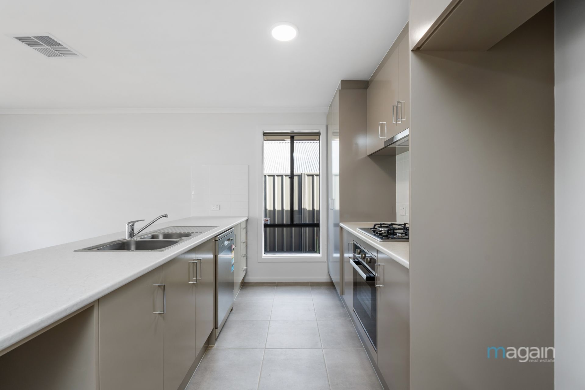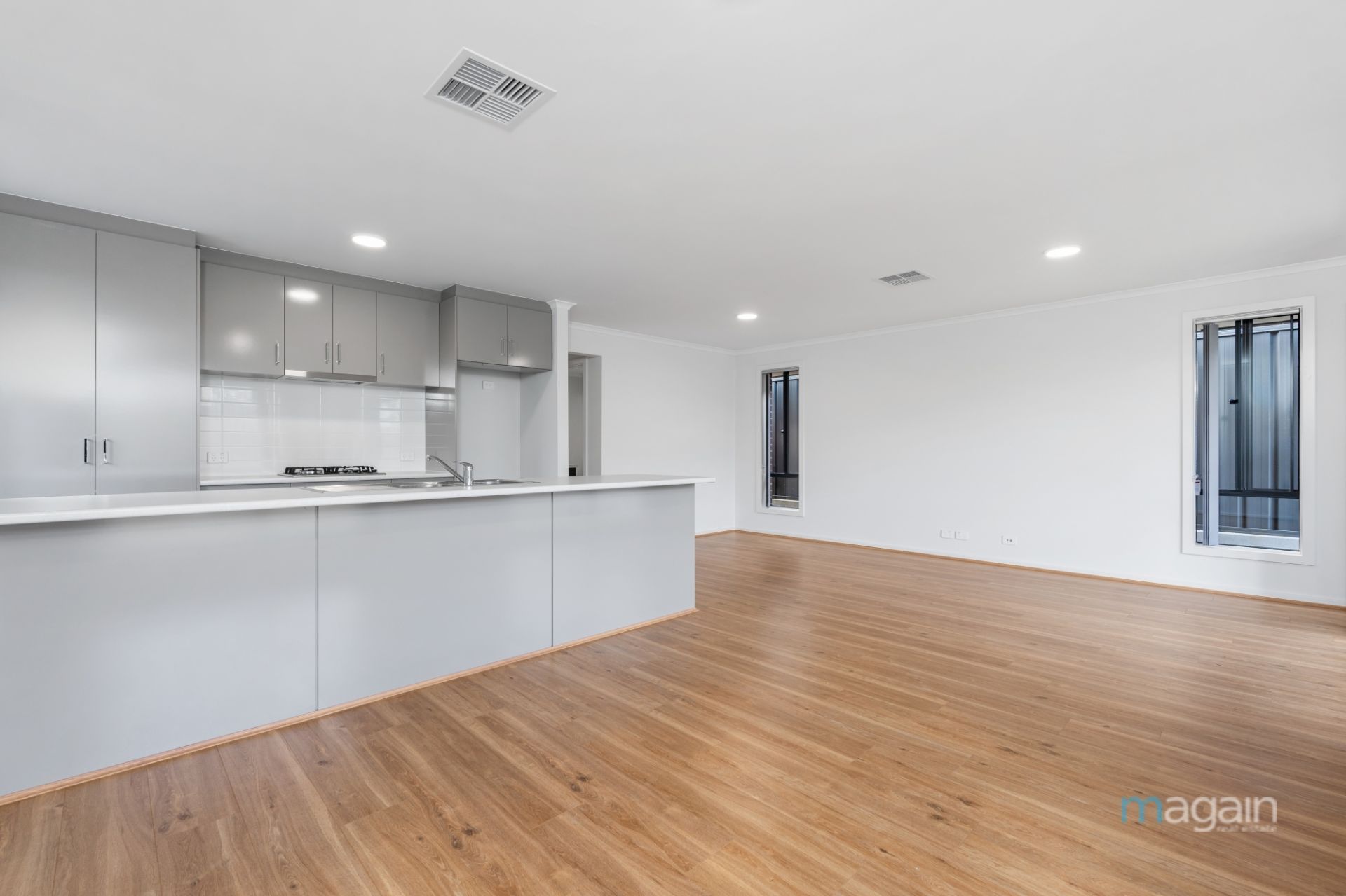 > open plan kitchen, dining and living areas