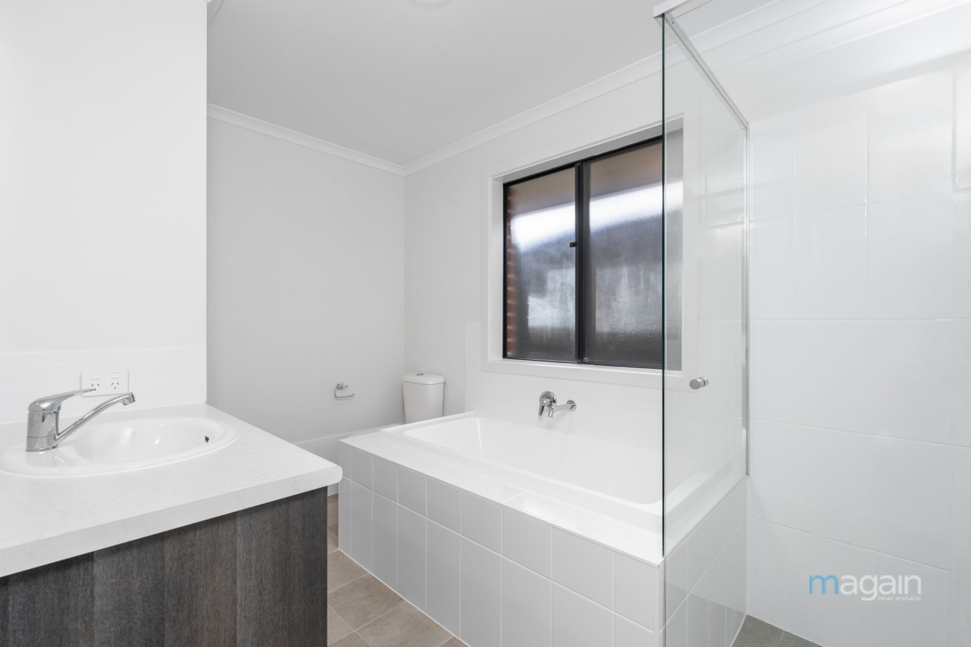 > neat and airy bathroom with bath tub, toilet and shower