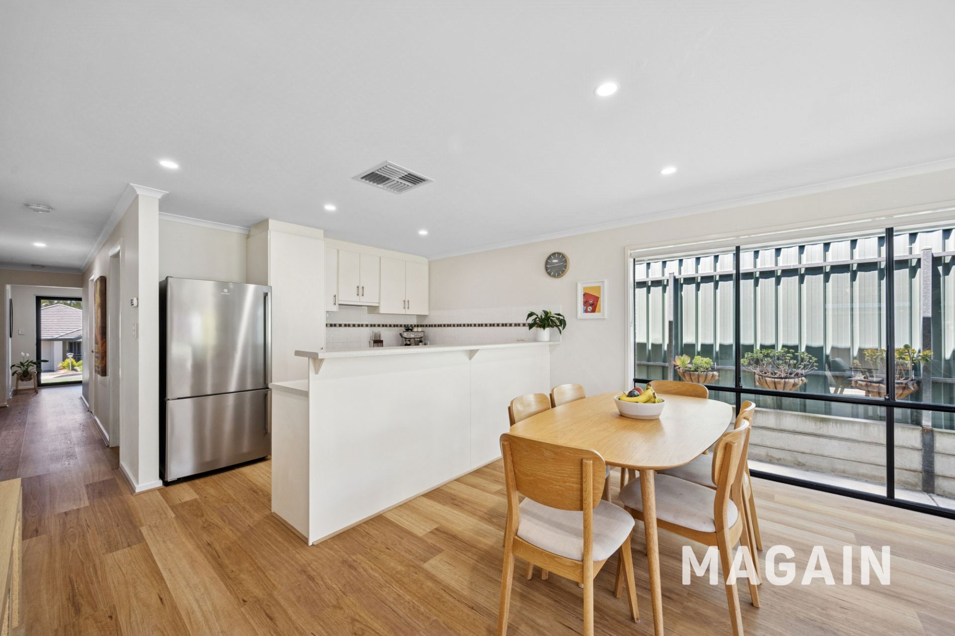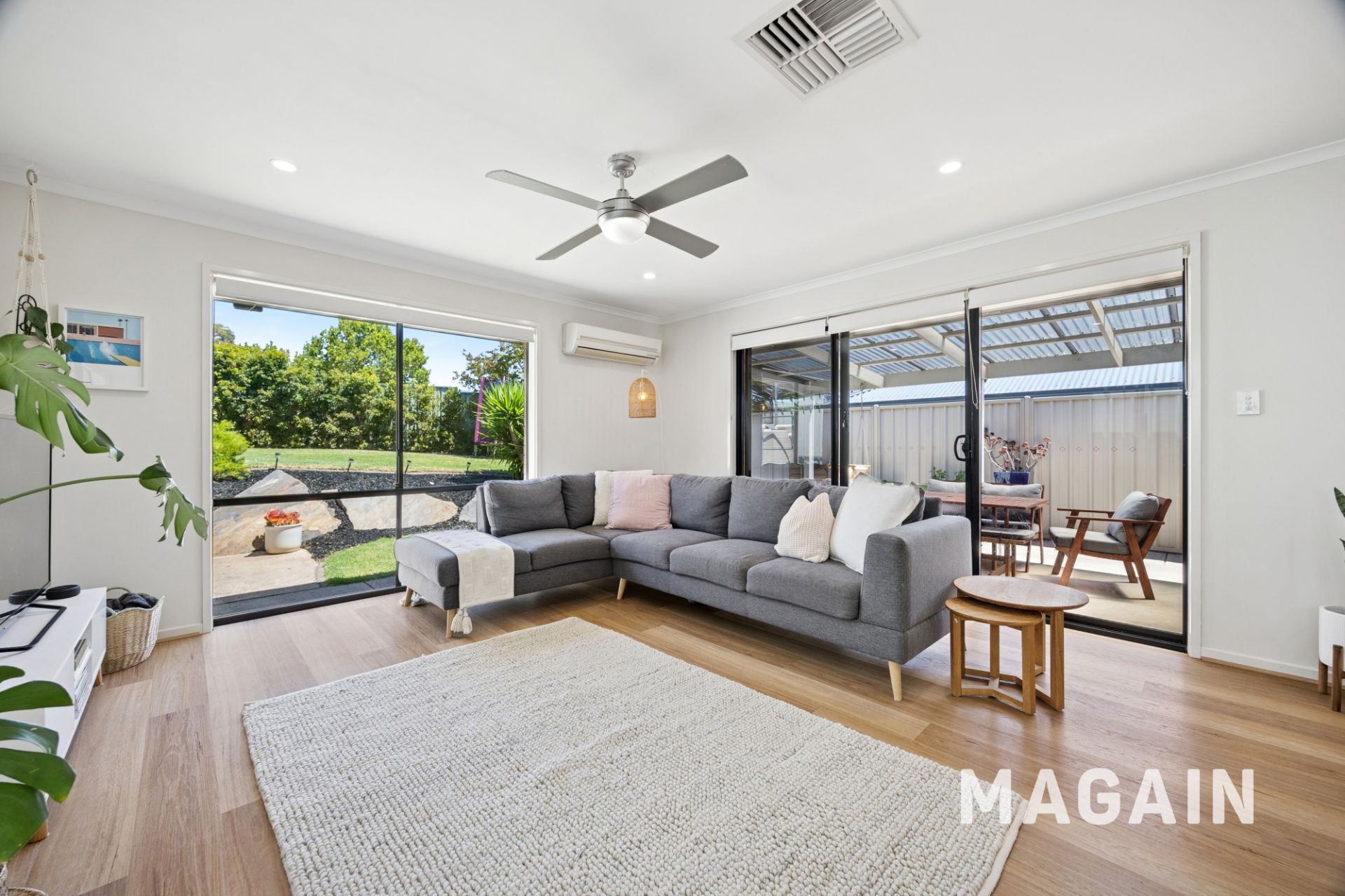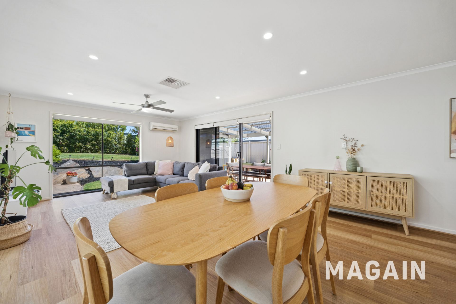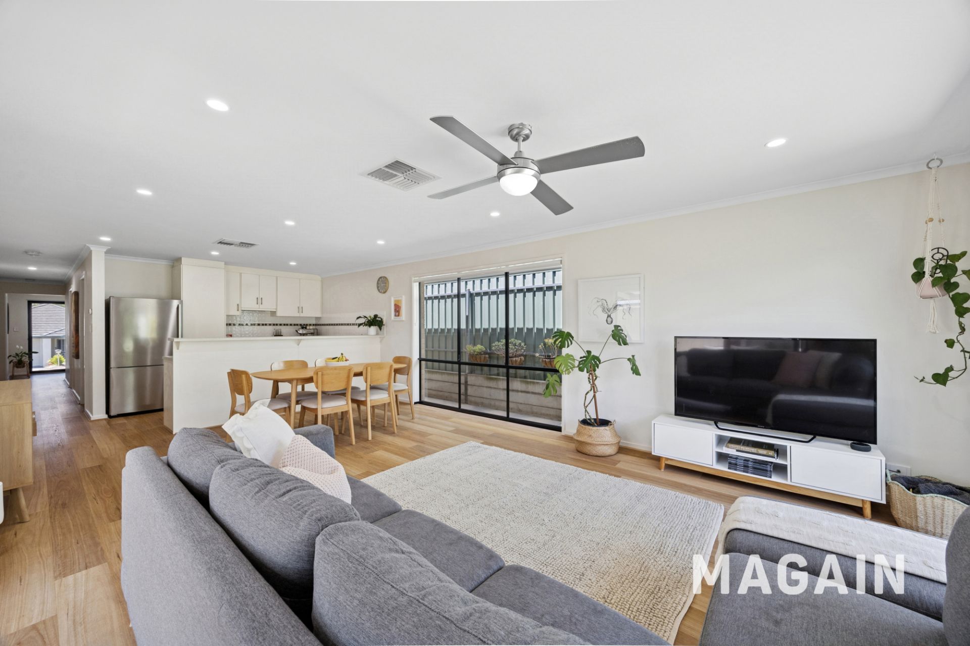 This inviting home welcomes you via a short hallway that opens into a stylish open-plan living, kitchen, and dining area. Bathed in natural light from large picture windows and wide sliding glass doors, the space creates a calm and comfortable retreat at the end of a busy day. Neutral timber-style flooring runs throughout the living zone, offering everyday practicality with a timeless finish to suit any décor. Sliding doors provide a seamless connection to the outdoor entertaining area, extending the living space and creating an ideal setting for hosting family and friends. A split-system air conditioner and ceiling fan ensure year-round comfort for the whole family.