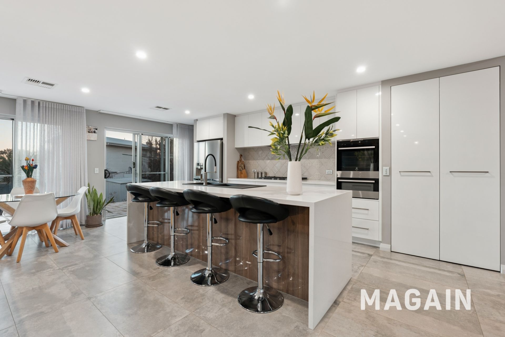 Downstairs, the open-plan living/meals area is the heart of the home, complete with a cosy gas fireplace, modern tile flooring, and seamless connection to the outdoor entertaining space. The sleek, updated kitchen is well-equipped with quality appliances including a 5 burner gas cook top, ample storage, and breakfast bar seating, flowing naturally into the separate dining zone and study, ideal for working from home or flexible use.