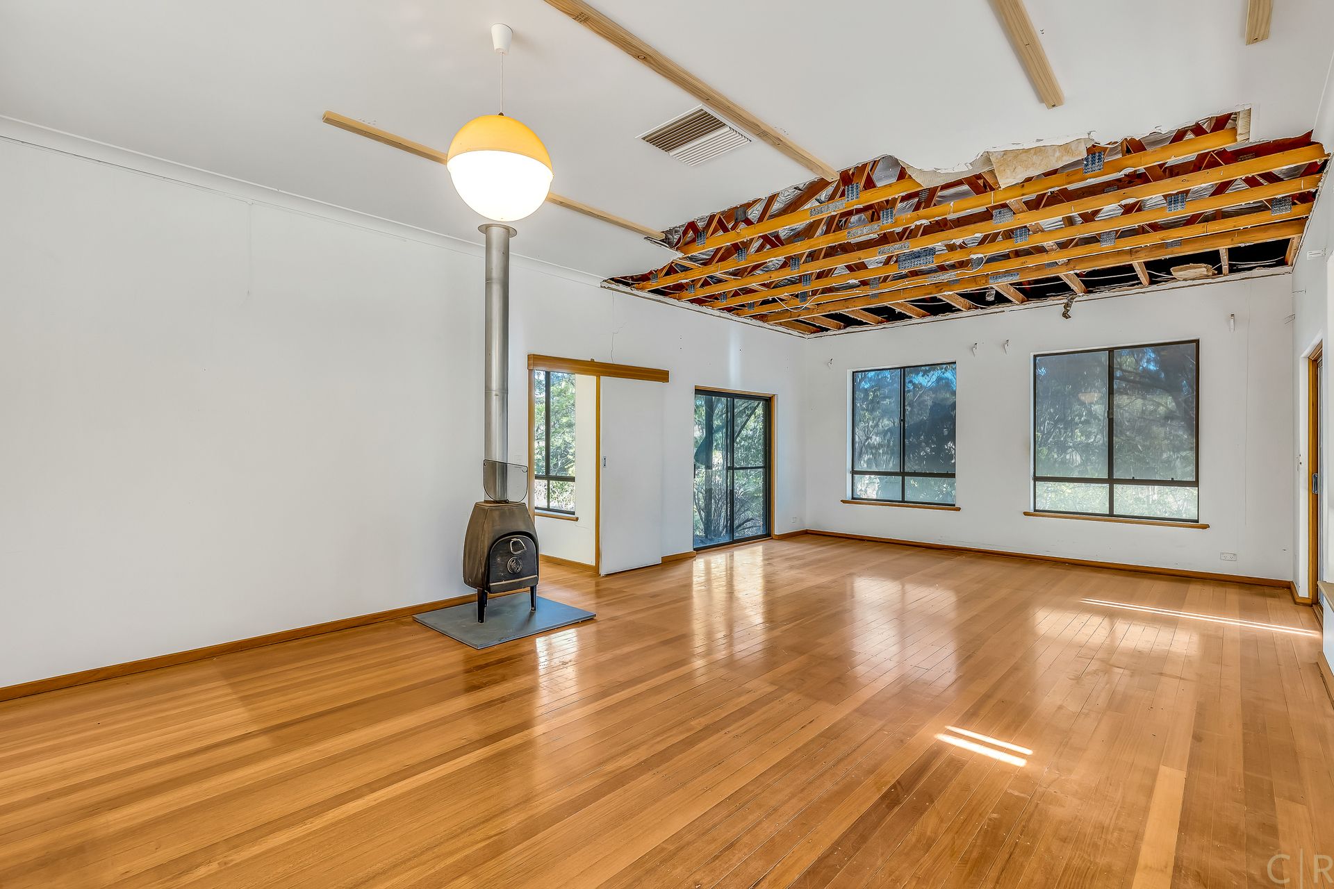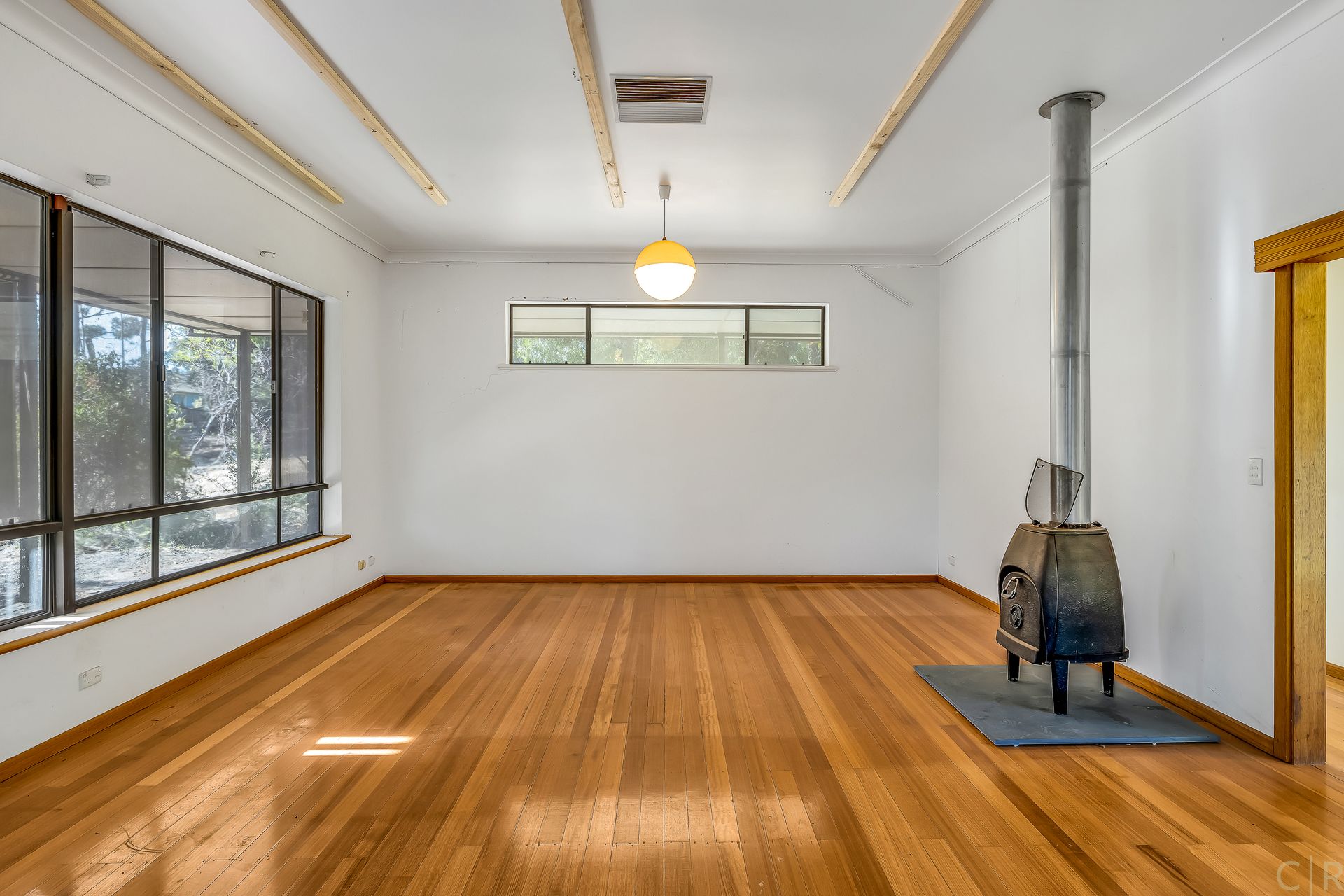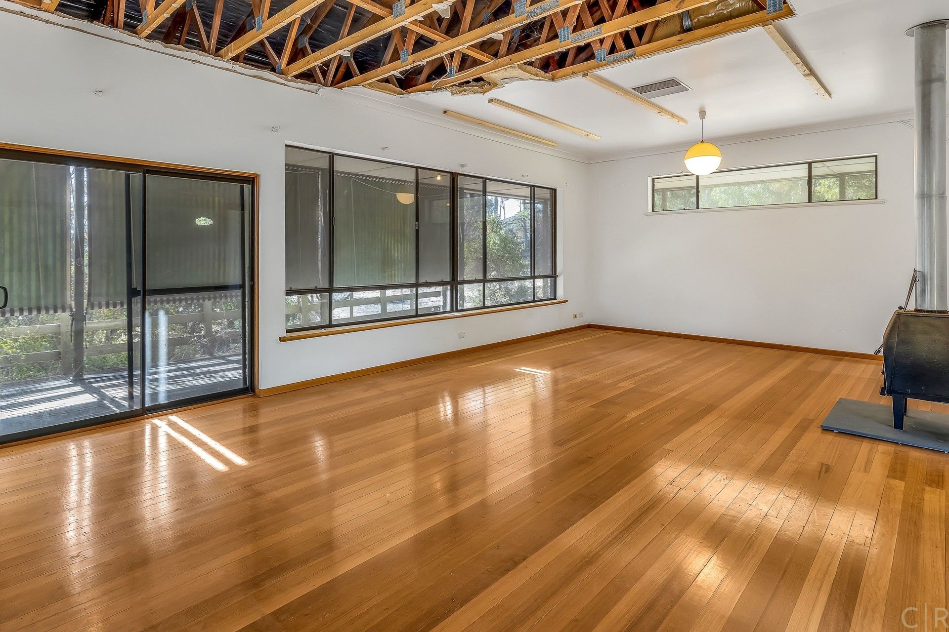 Huge living area with wood heater and sliding doors leading onto the deck