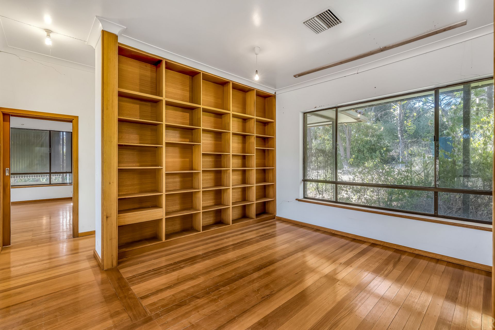 Library has built in bookshelves which can also be a perfect dining room