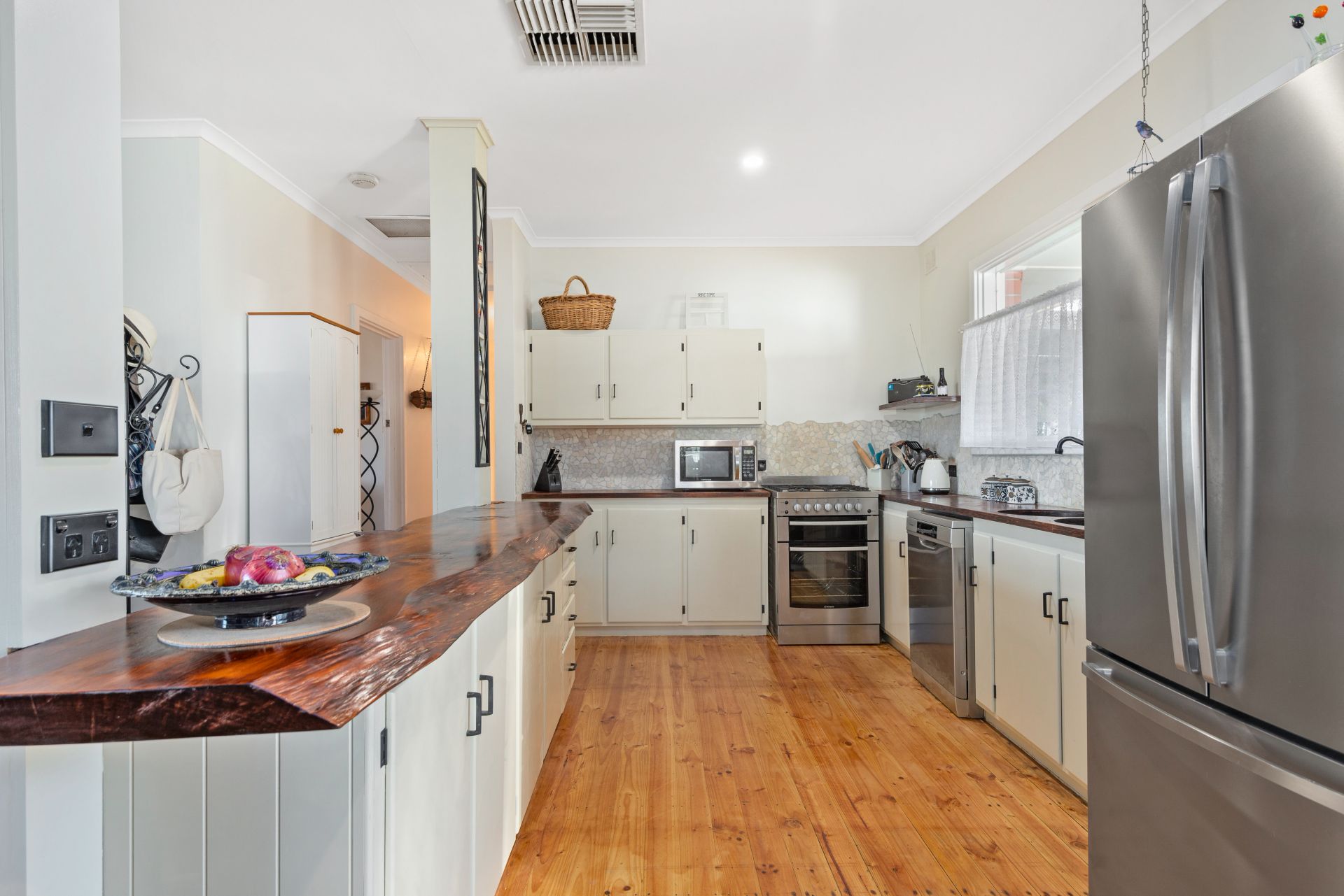 As you approach the home you will appreciate the privacy provided by the friendly neighbour fence and secure gate - and behind the fence you will love the beautiful front gardens and charming red brick facade. The open planned living area greets you as you enter the home, bursting with natural light. The home oozes with character, with polished floorboards and tall ceilings throughout. The lounge room is the perfect place to wind down after a long day at work, with the combustion fireplace setting the ambience during the winter months. The kitchen has been stunningly renovated with a rustic feel; the huge island bench being the perfect place to prepare your meals while still being able to talk to family and friends. The kitchen has plenty of cupboard space and all the essential appliances including gas cooktop and dishwasher.