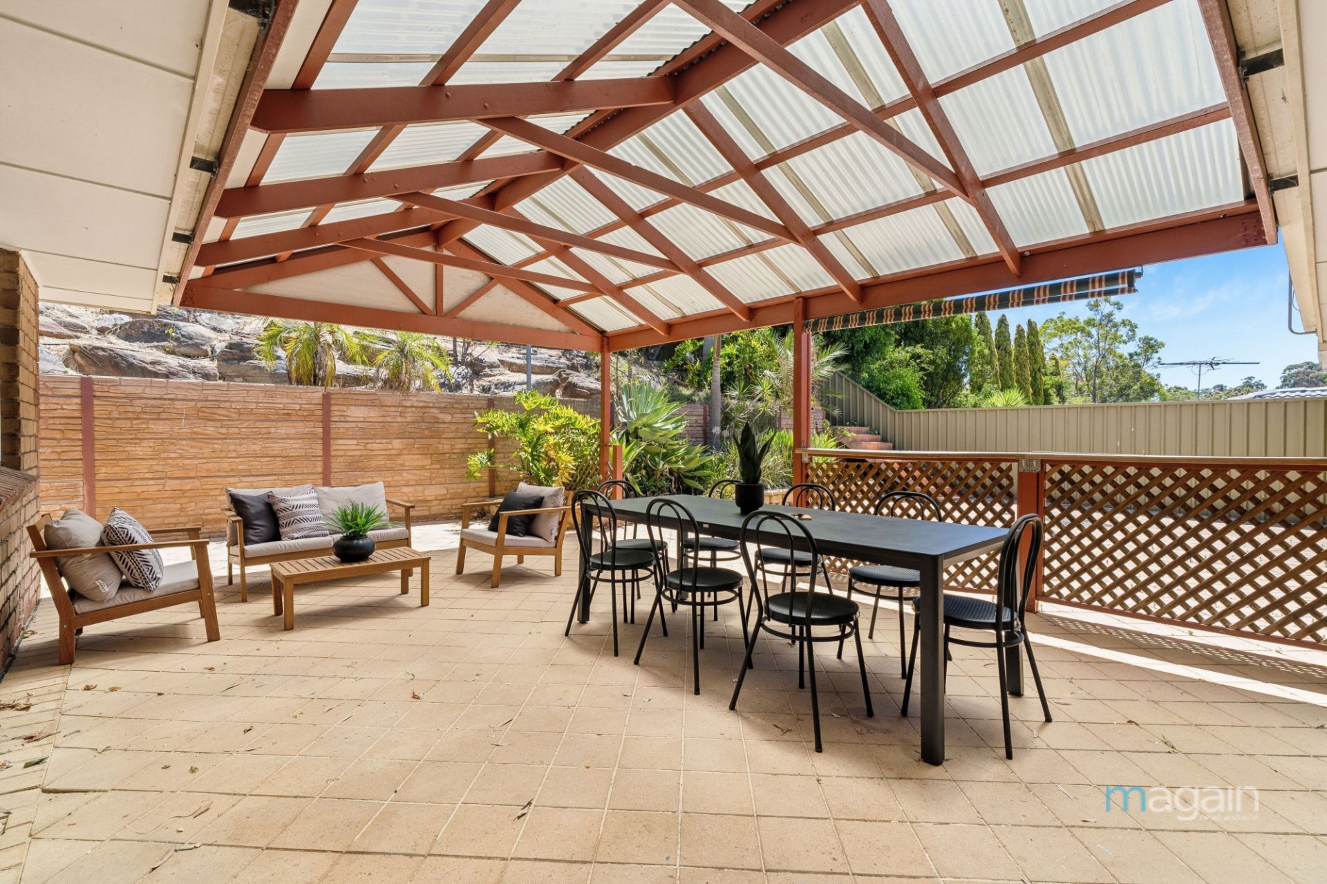 Outside, the home continues to impress with a beautifully designed outdoor entertaining area. The paved space, covered by a pitched roof pergola, is ideal for hosting barbecues or enjoying quiet evenings in the fresh air. The split-level backyard offers a top grassed area, complete with fruit trees, providing a private and tranquil setting.