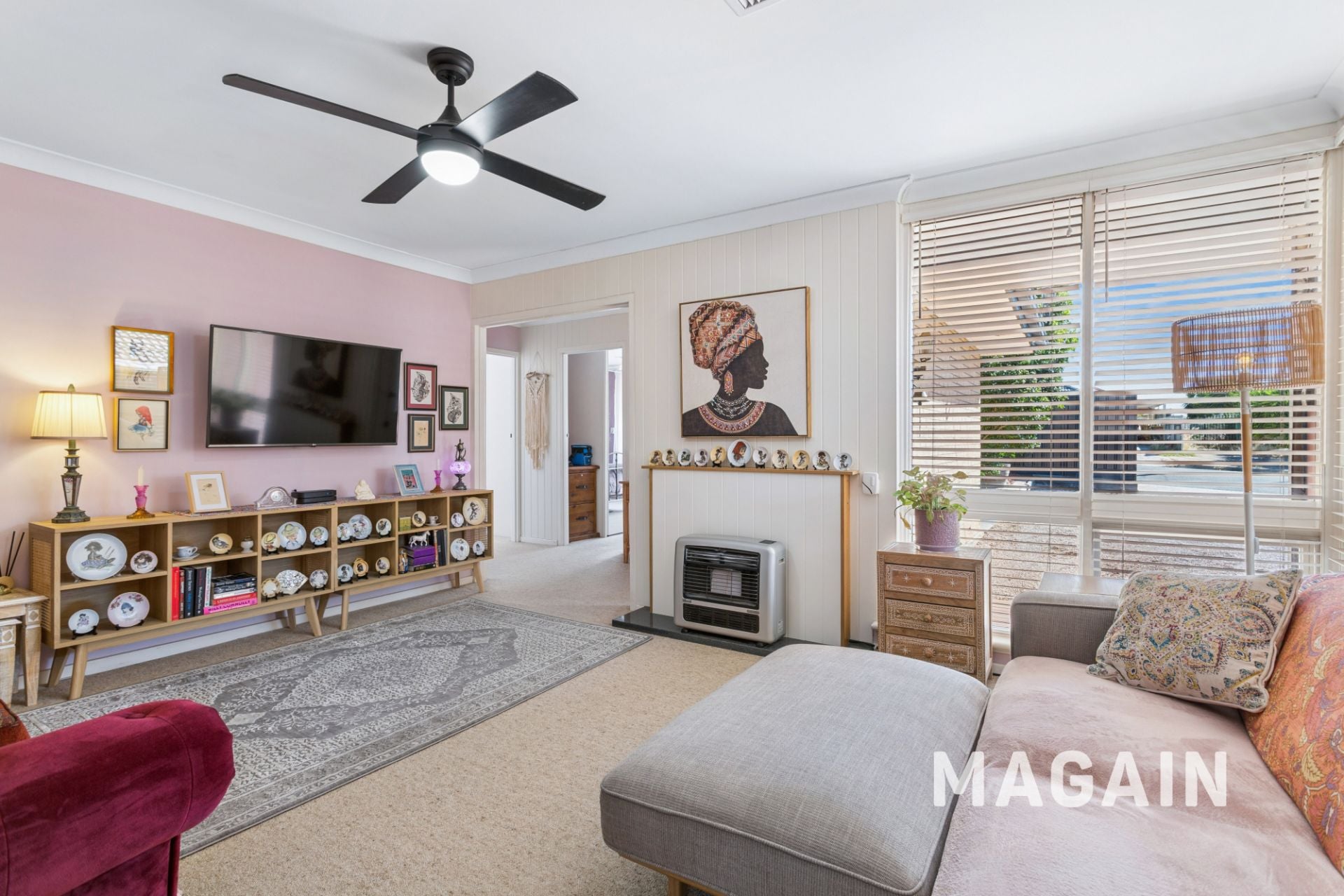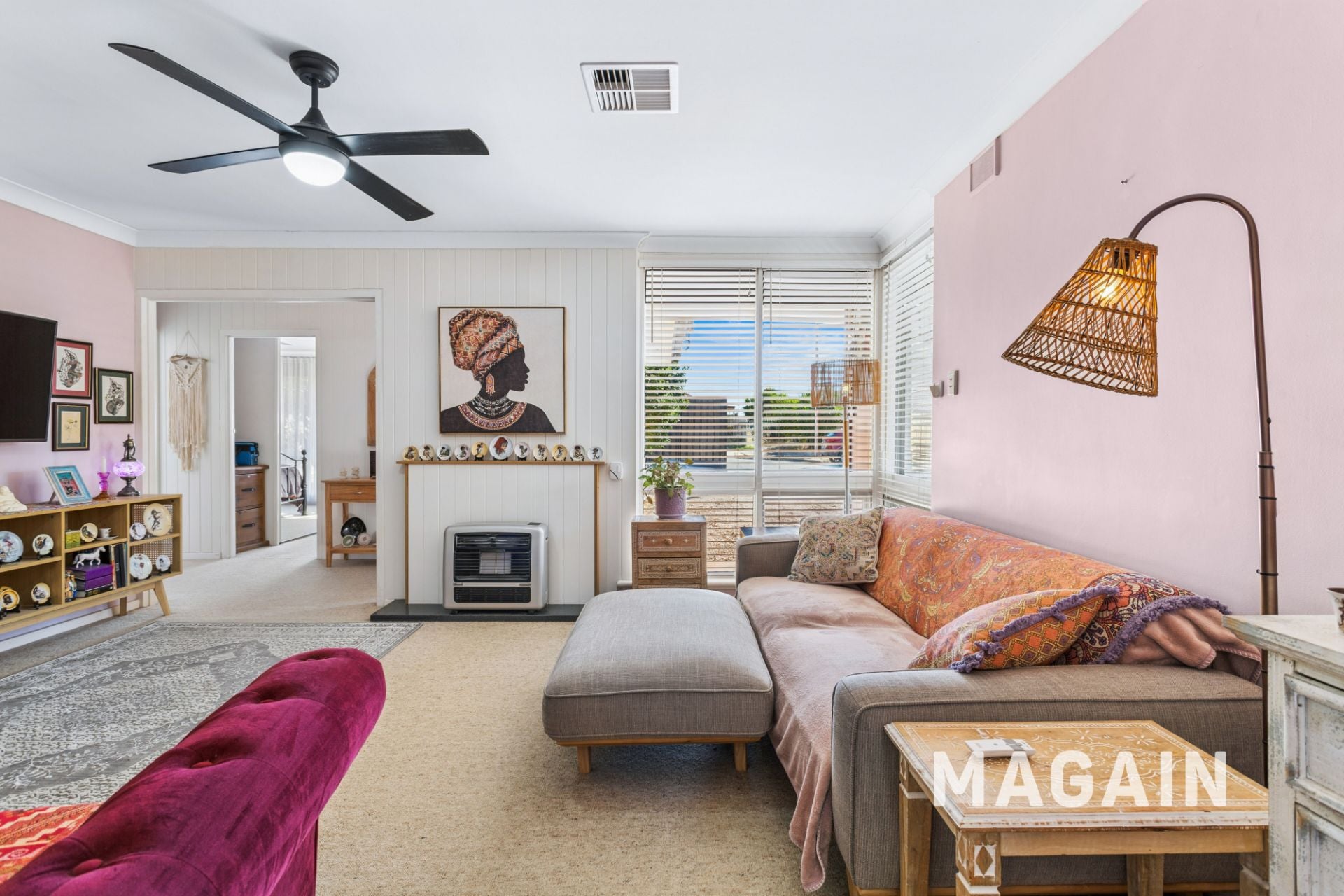 From the moment you step inside, you'll appreciate the home's thoughtful design, enhanced by striking panel styled walls and tasteful touches of pink that create a warm, vibrant atmosphere. The main living area is both inviting and functional, complete with soft carpeting, a heating unit, and ceiling fan for year round comfort.