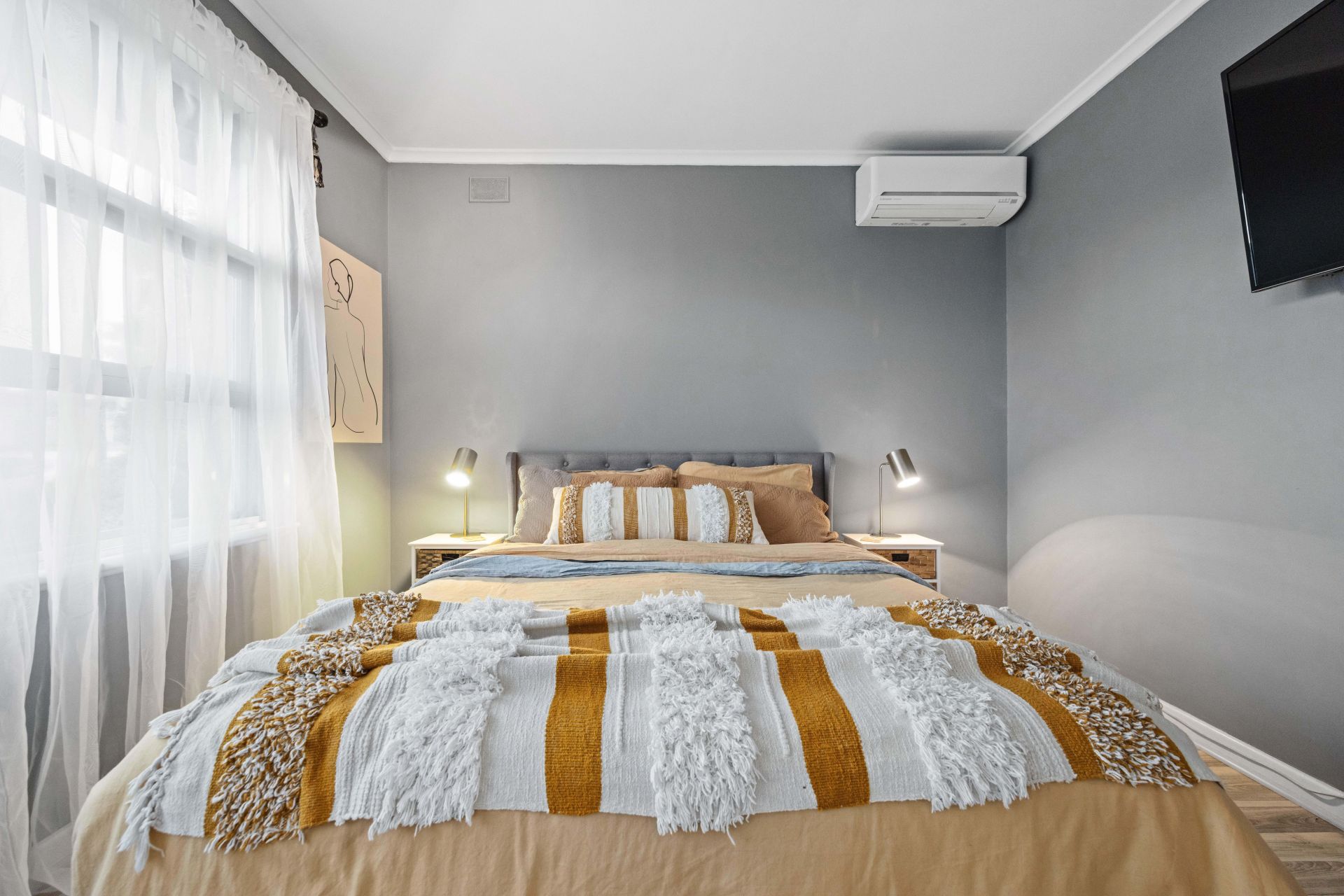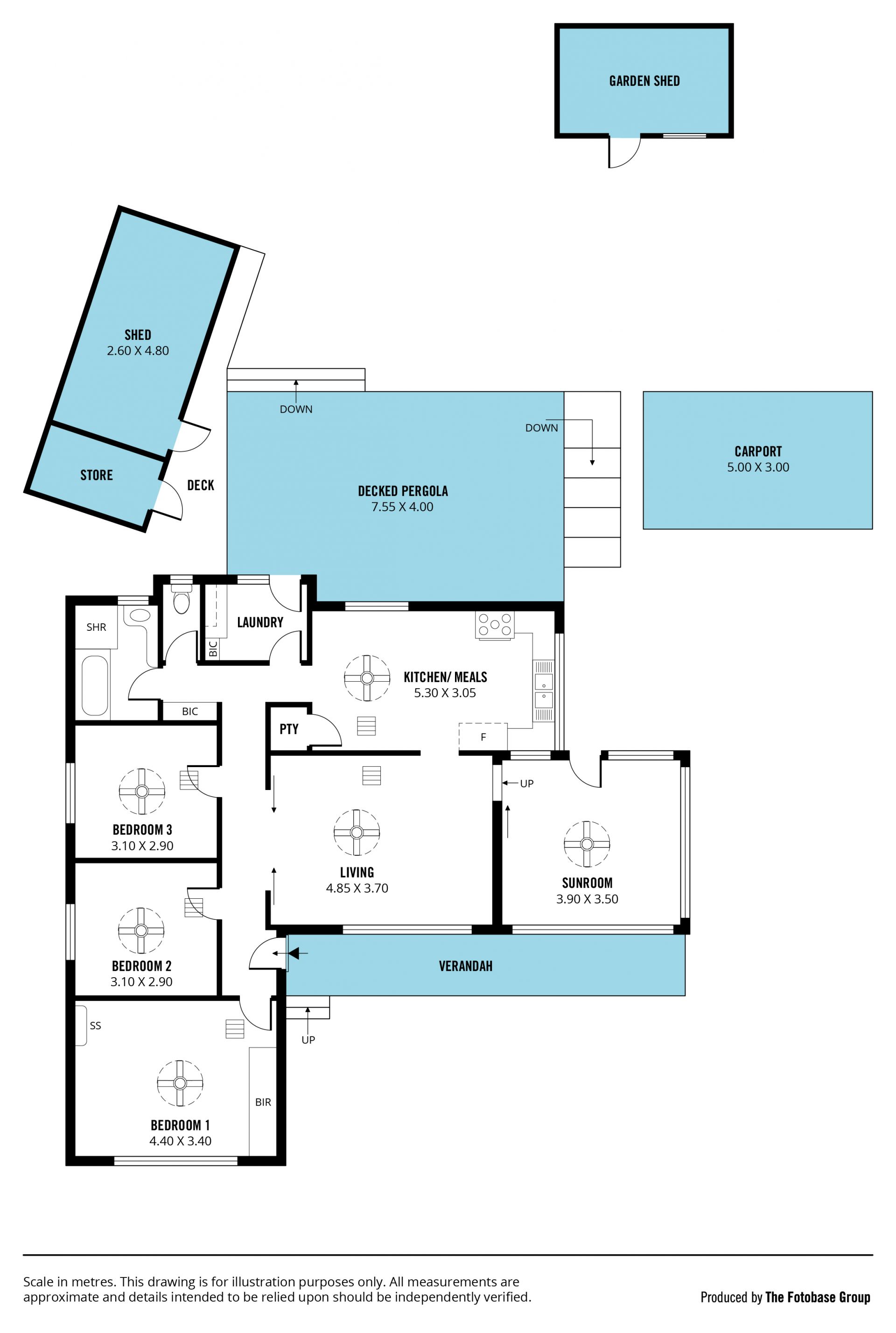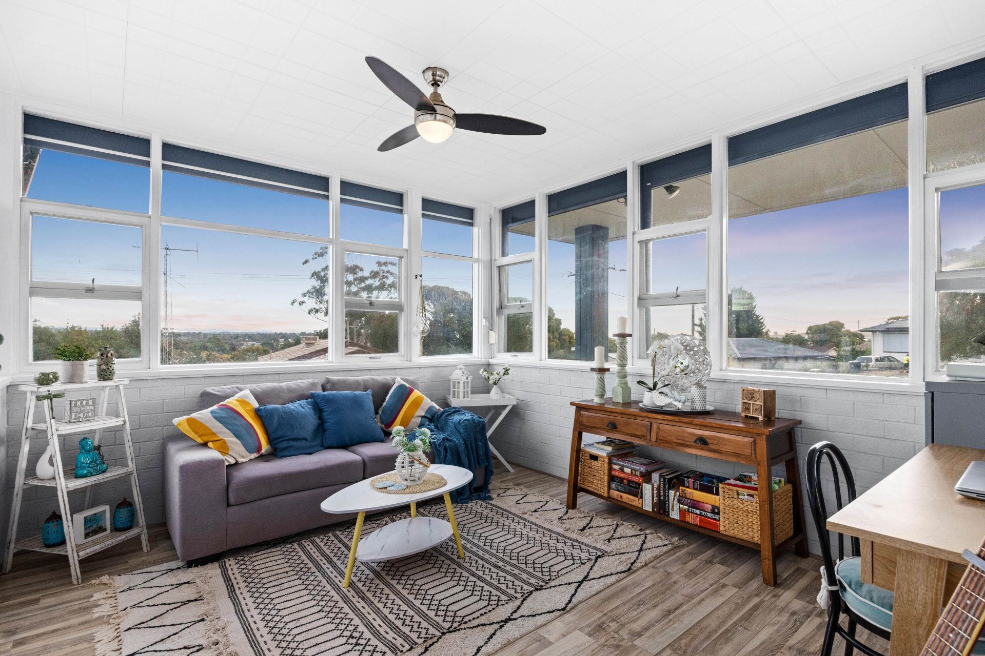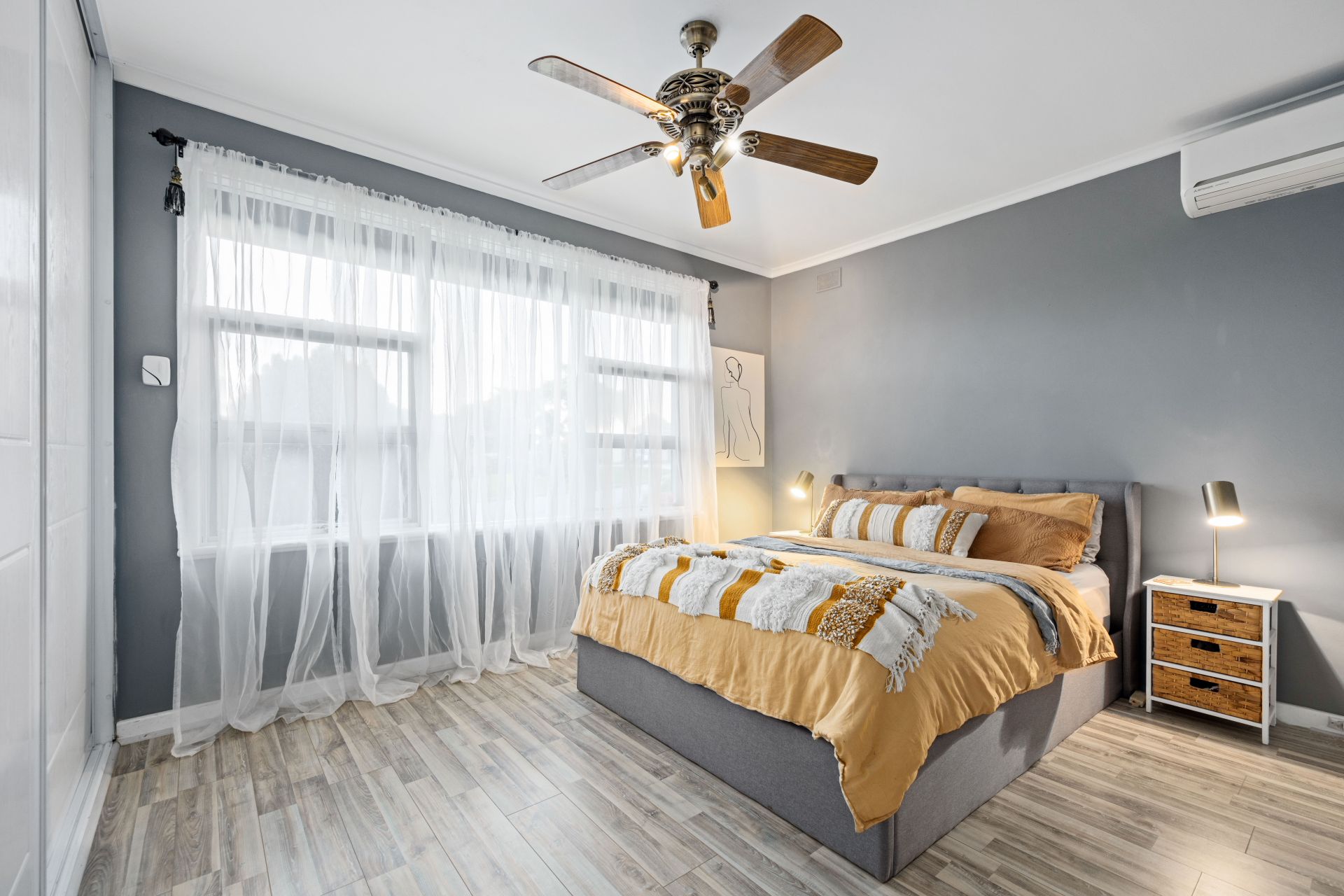 Inside, the home features a functional kitchen with ample storage space, gas cooking, and a dishwasher. The bedrooms are all generously sized and feature built-in wardrobes, with the master bedroom including a ceiling fan. The study/sunroom is a versatile space that can be used as a home office, extra living area, or a playroom for the kids.