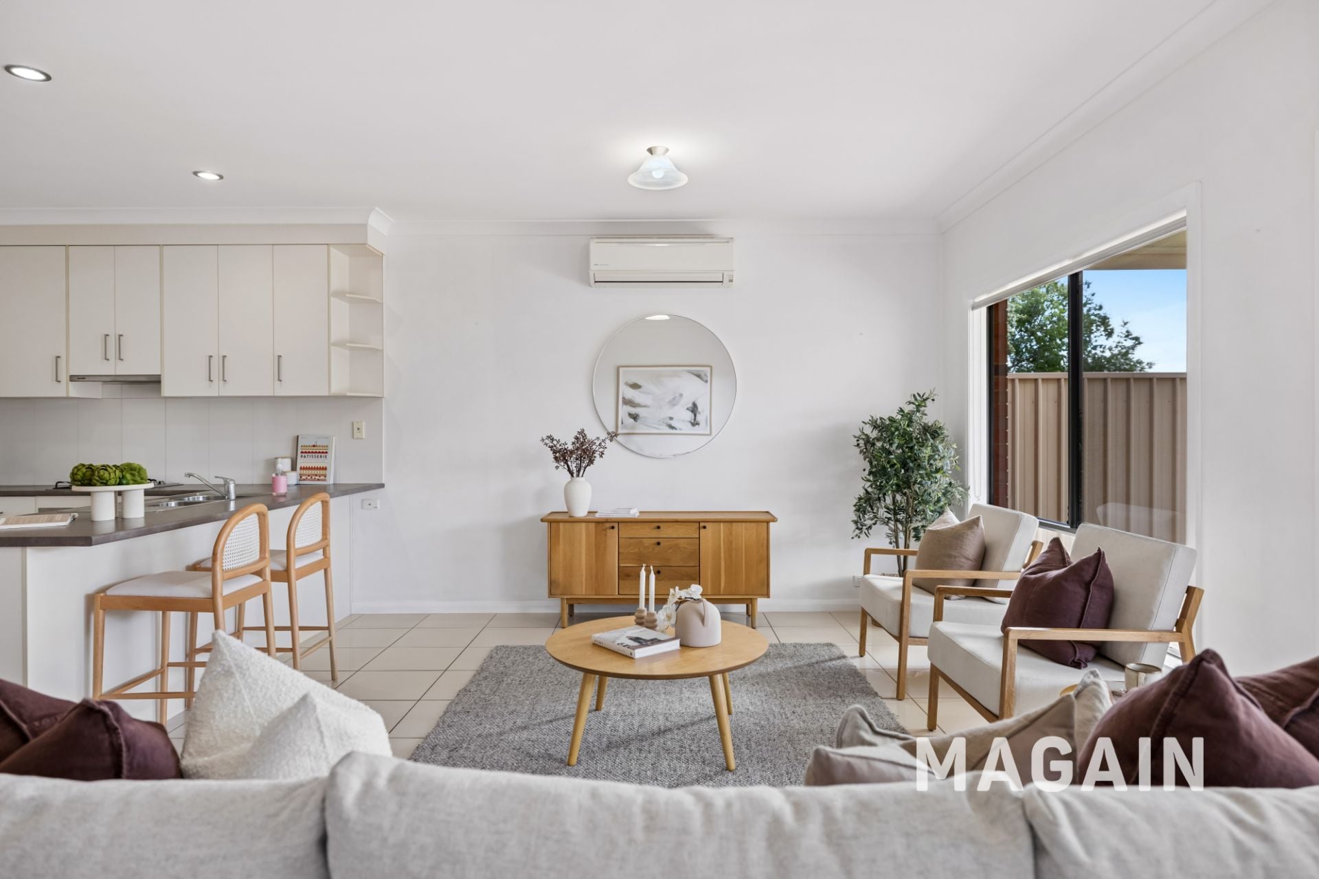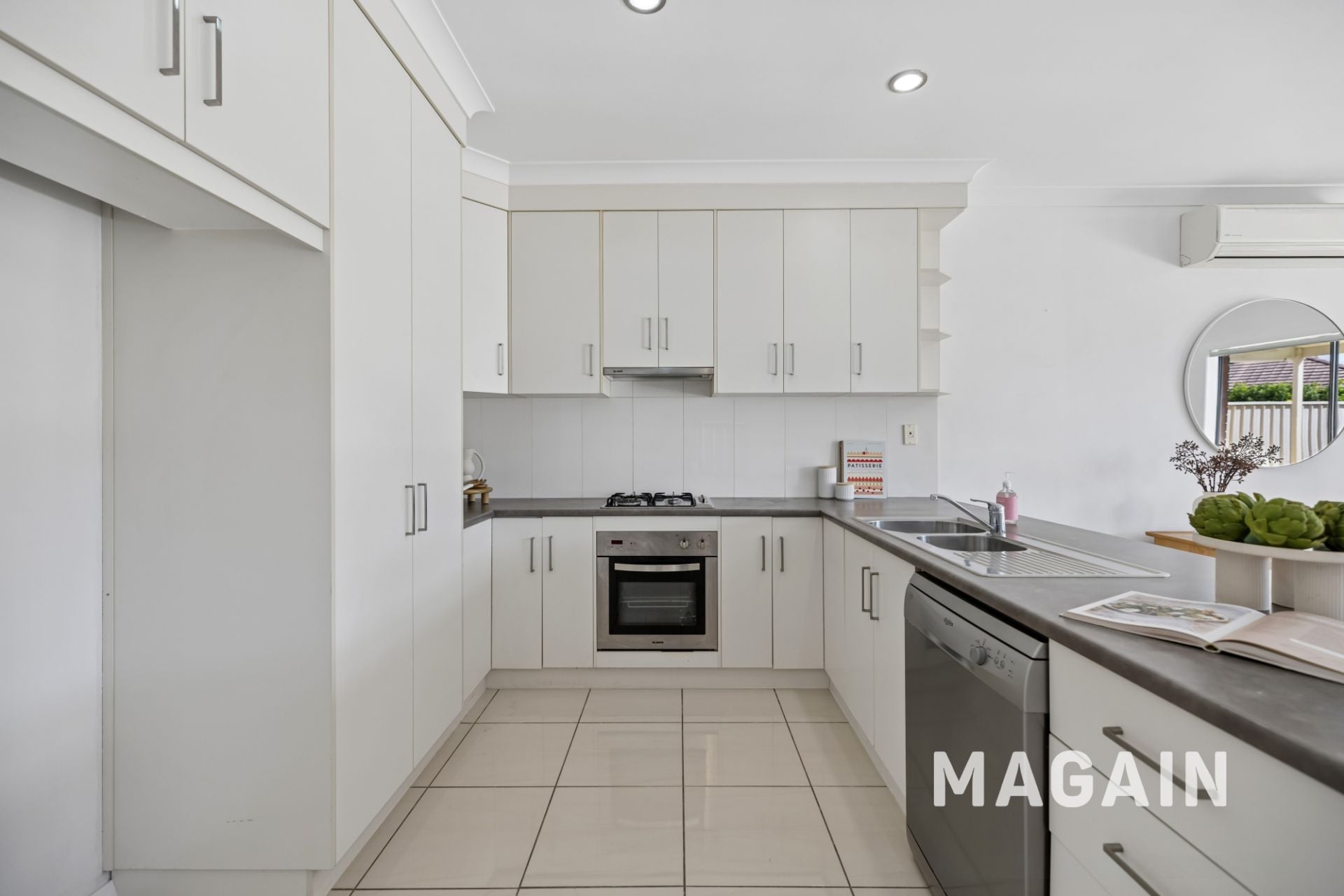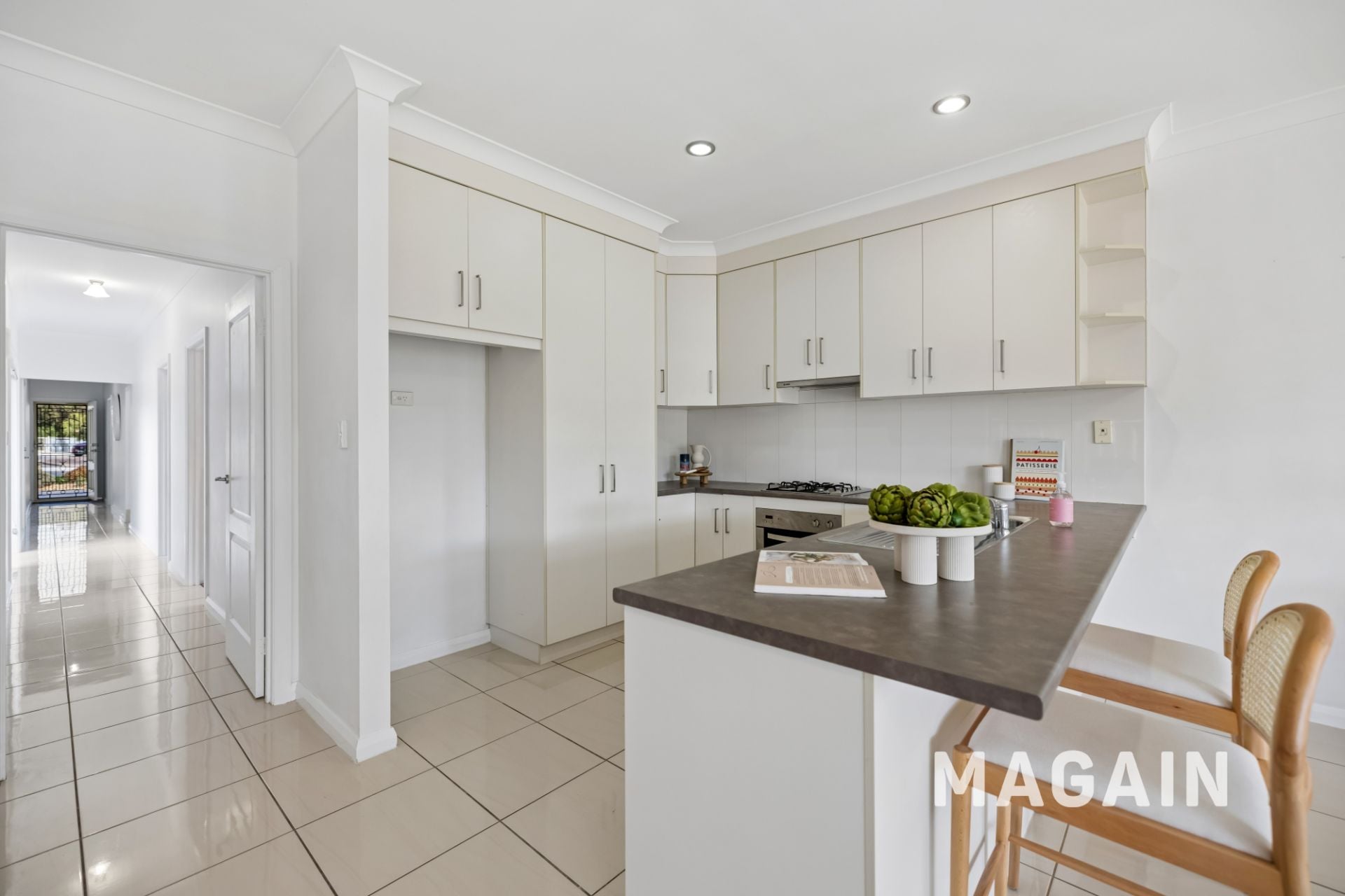 The kitchen showcases a modern and elegant design, featuring neutral cabinetry, generous benchtop space and equipped with quality appliances—including a four-burner gas cooktop, oven with rangehood, and dishwasher—it caters to both everyday convenience and entertaining.