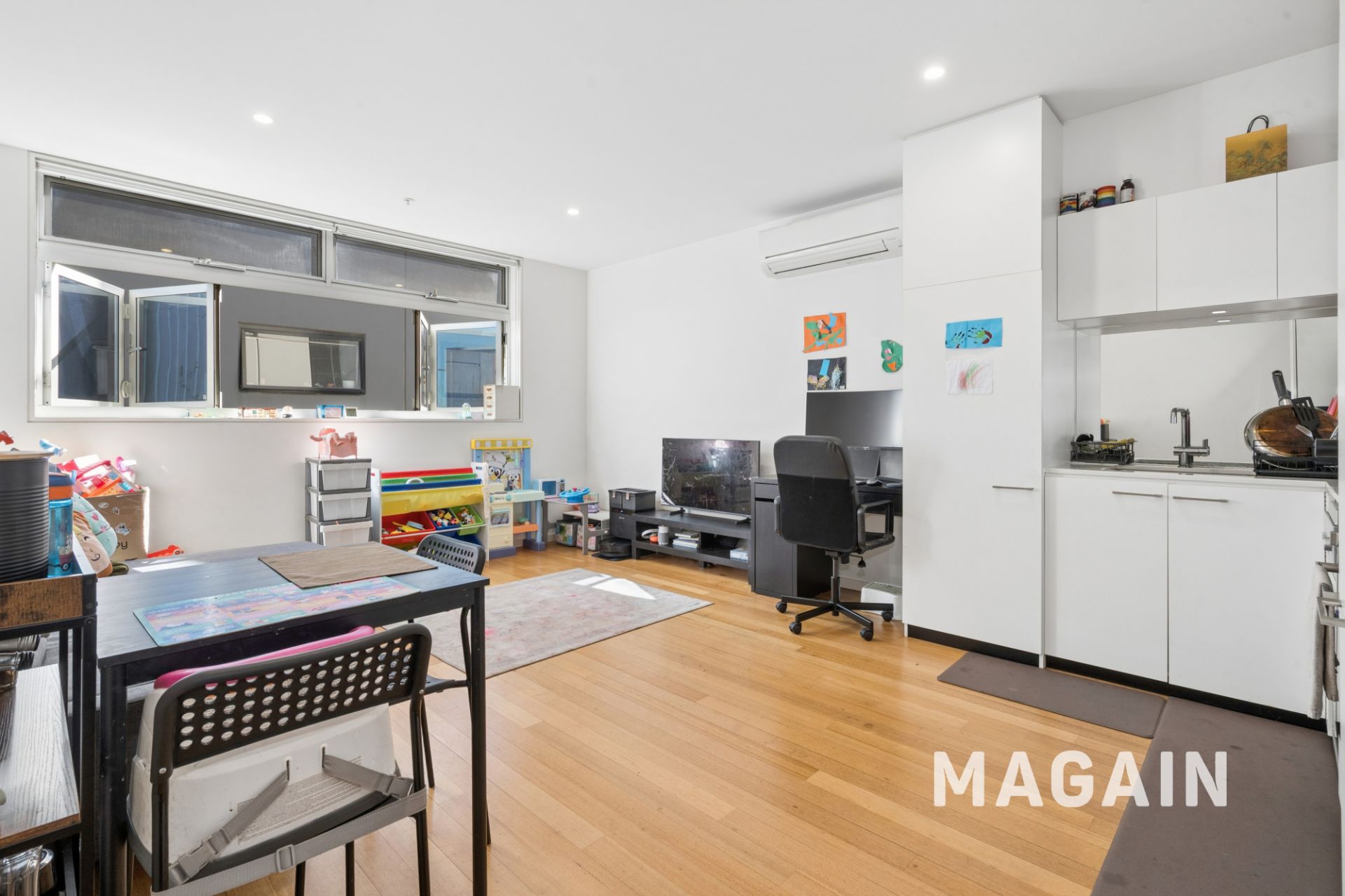 - Bright, open-plan living and dining area featuring beautiful floorboards and a split system for year-round climate control