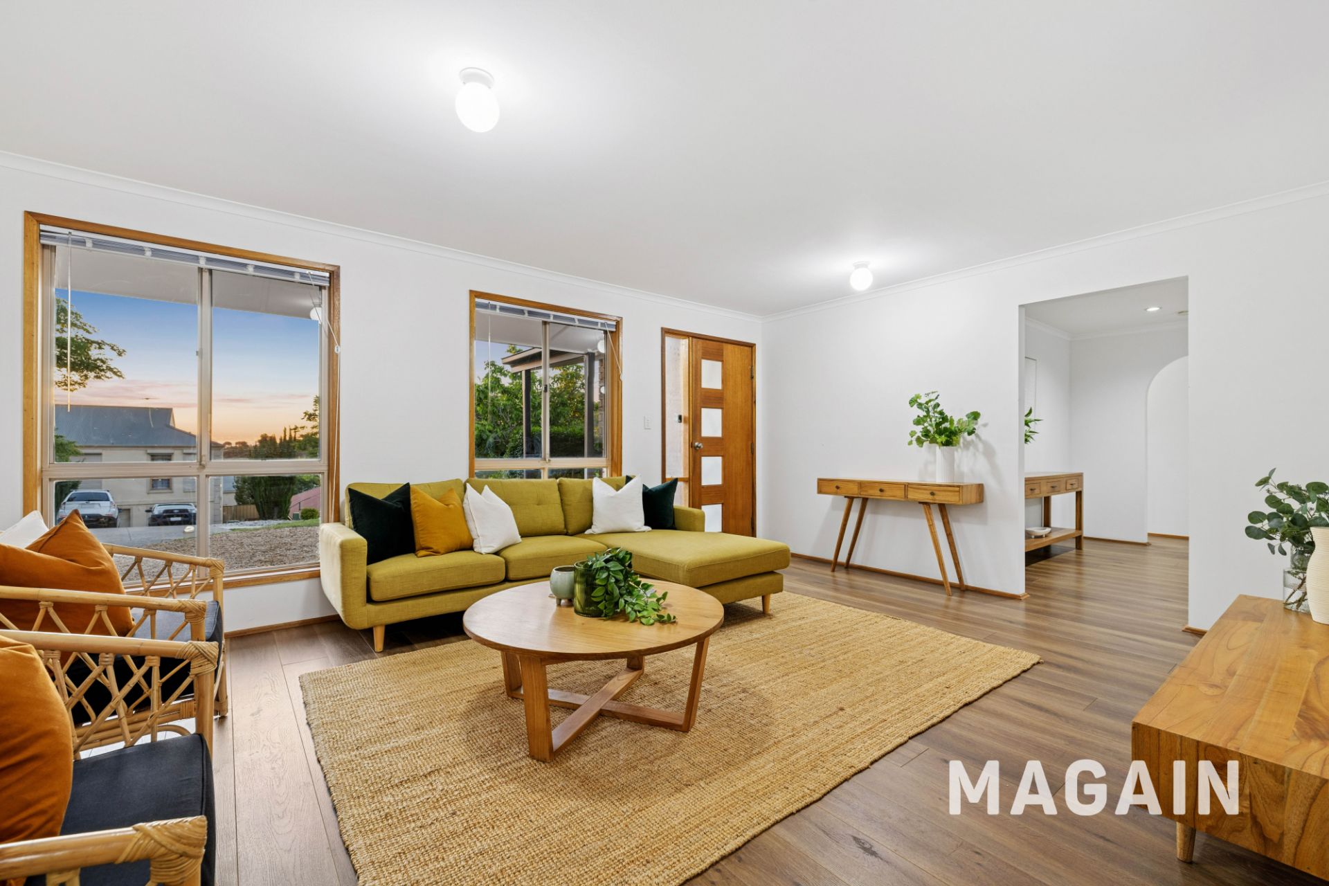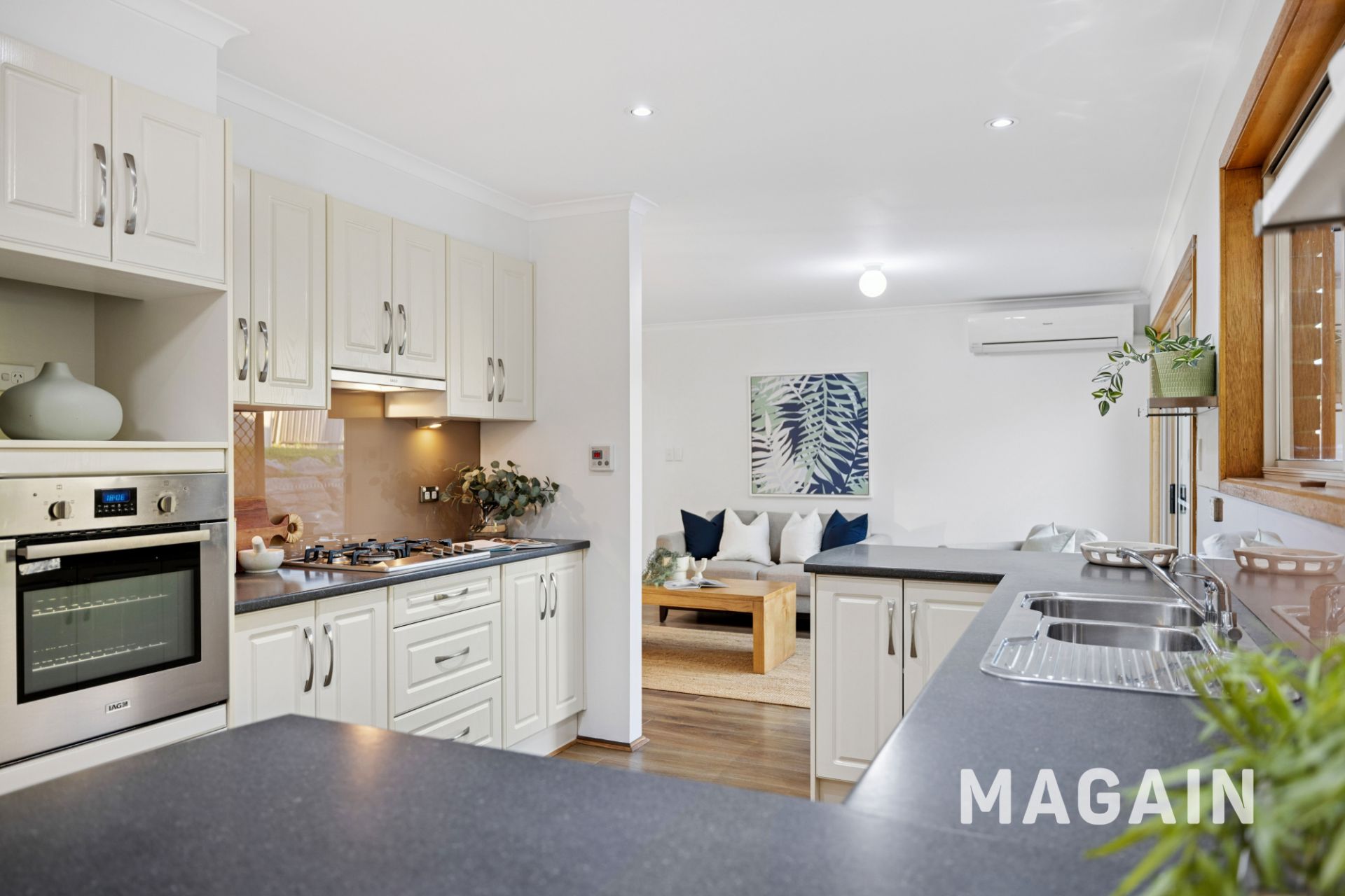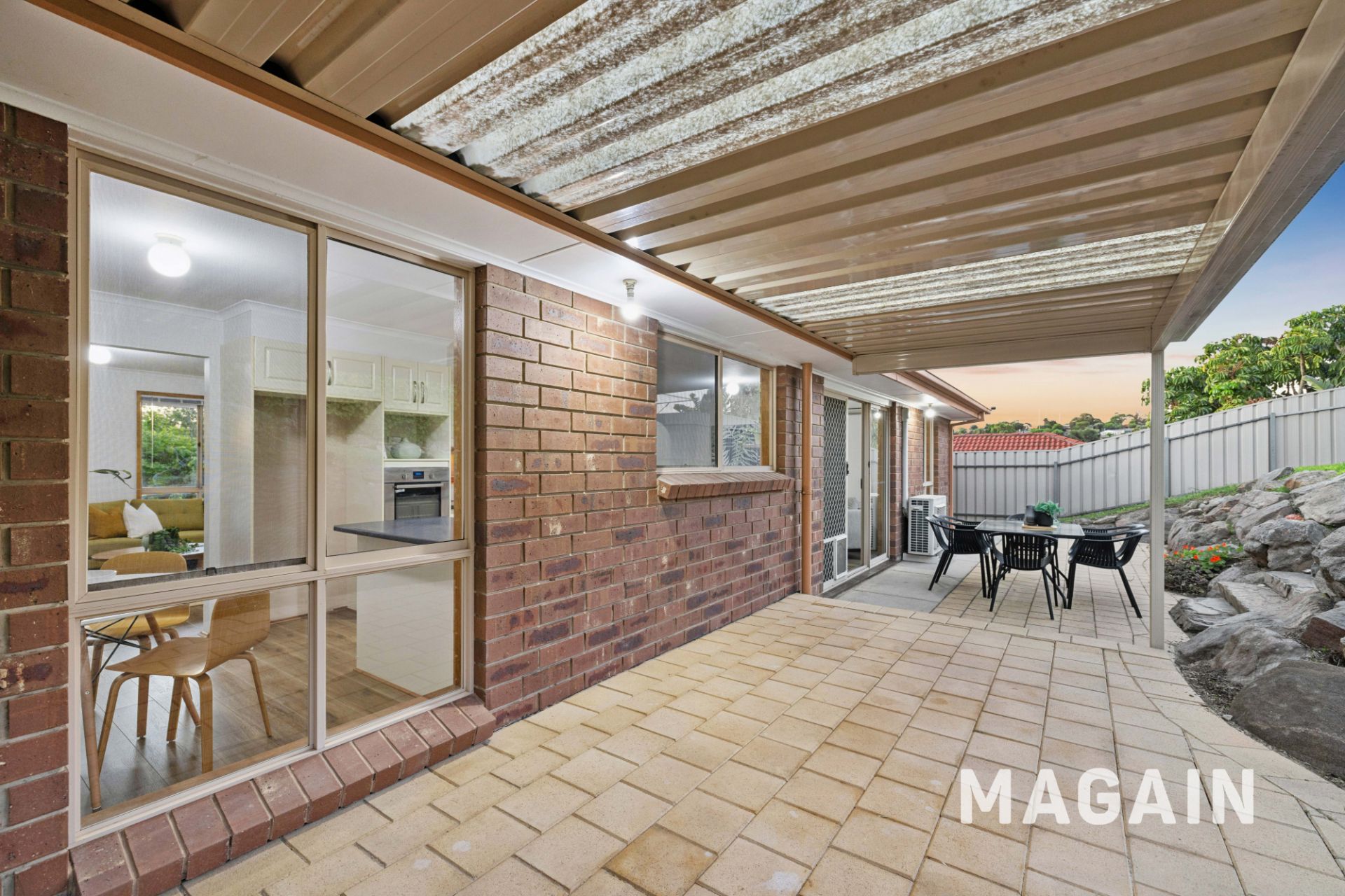 All three bedrooms feature floor-to-ceiling built-in wardrobes, while the bathroom includes a shower and separate toilet. A reverse-cycle split-system air-conditioner keeps the home comfortable year-round, and large windows capture the soft western light that fills the living areas in the afternoon.