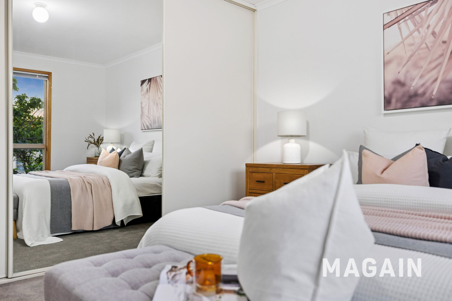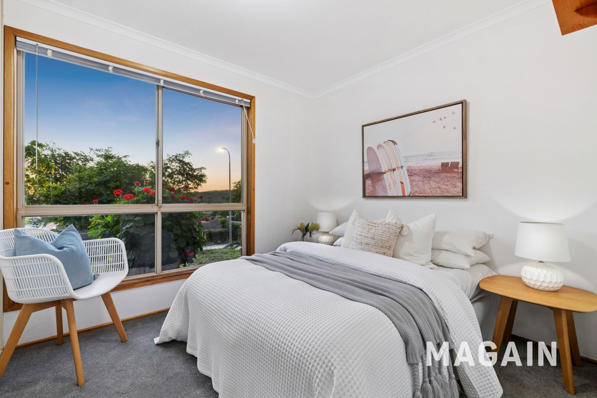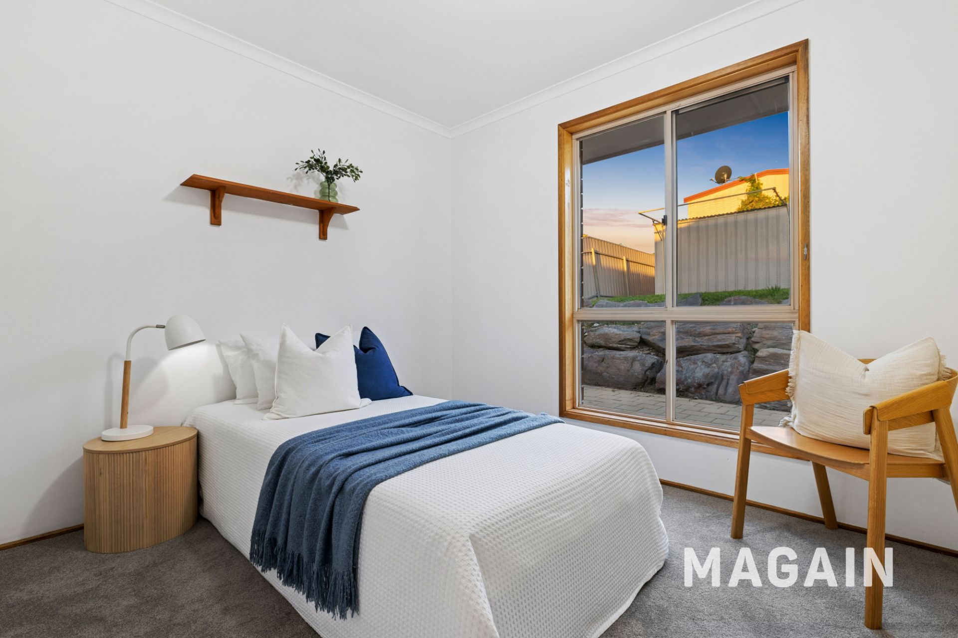 All three bedrooms feature floor-to-ceiling built-in wardrobes, while the bathroom includes a shower and separate toilet. A reverse-cycle split-system air-conditioner keeps the home comfortable year-round, and large windows capture the soft western light that fills the living areas in the afternoon.