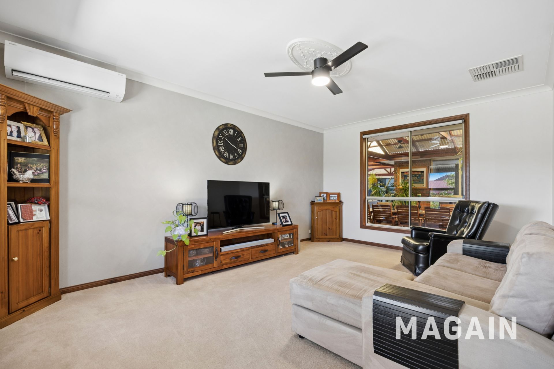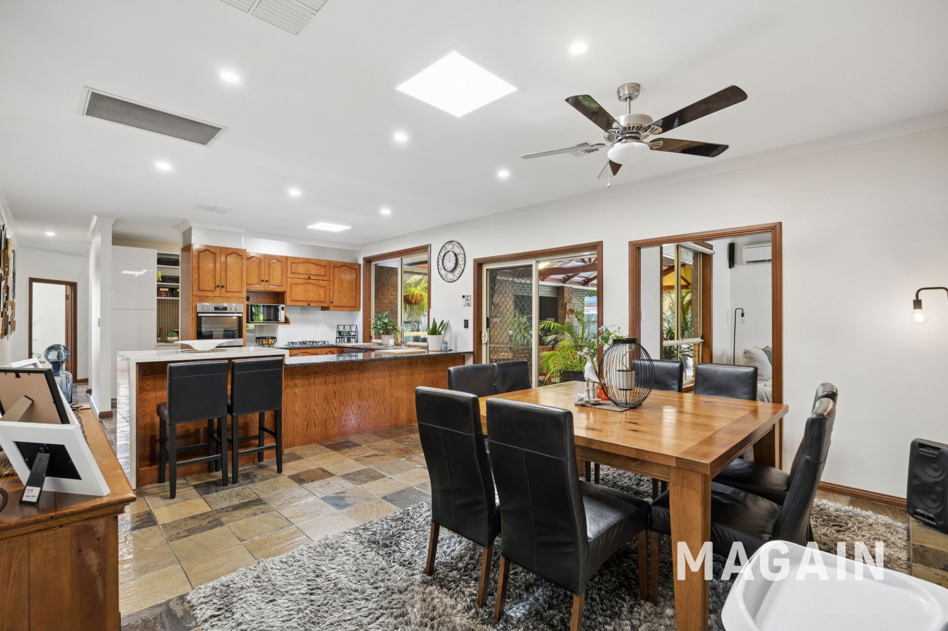 A striking entry with polished slate flooring sets the tone, opening to a series of thoughtfully zoned living spaces. Multiple lounge and family areas provide flexibility for both formal and informal living, including a dedicated theatre/lounge room at the front of the home, complete with plush carpeting, ceiling fan and split system air conditioning. A generous rumpus room and separate study further enhance the home's adaptability for modern lifestyles.