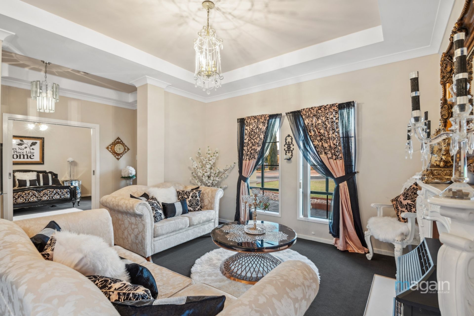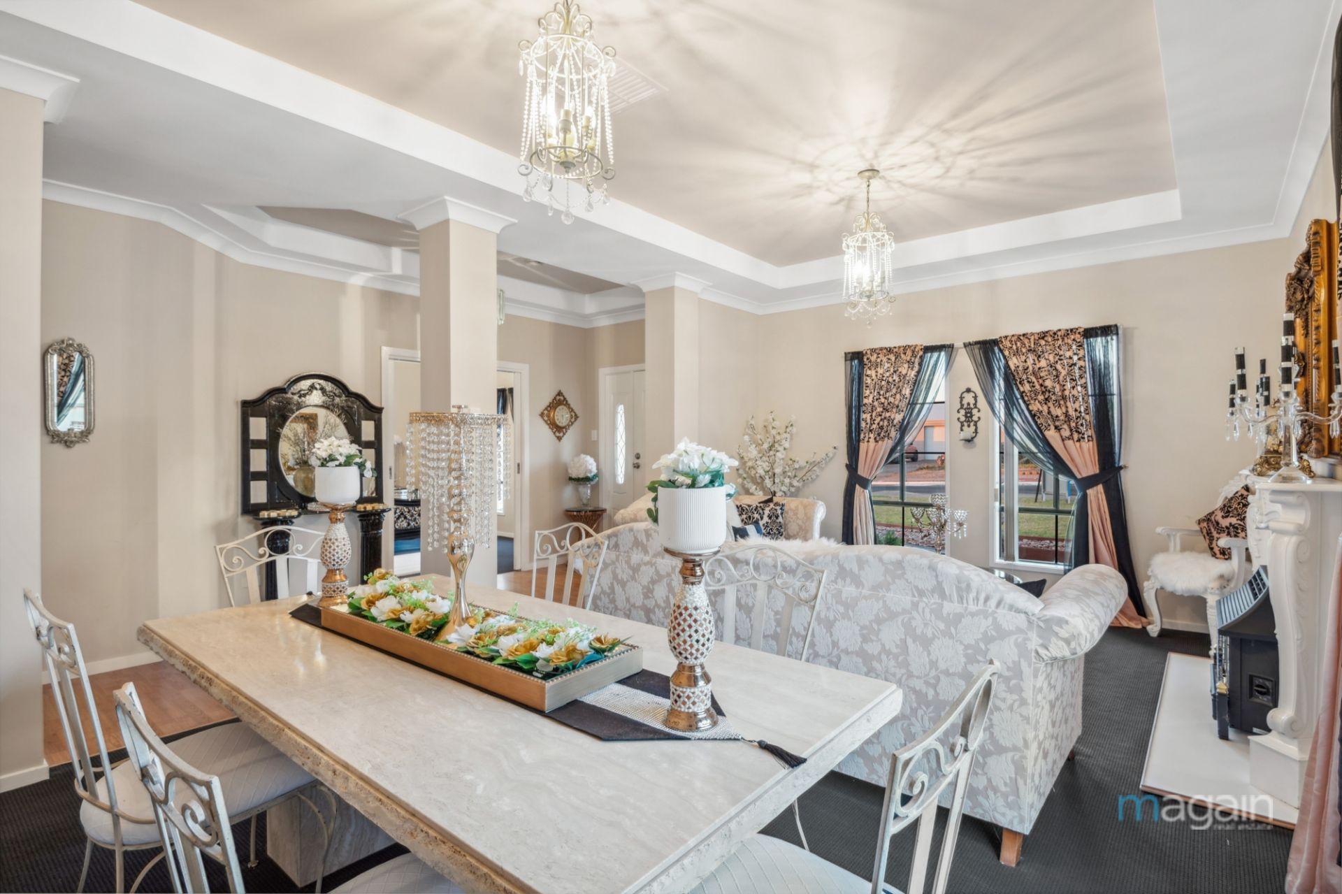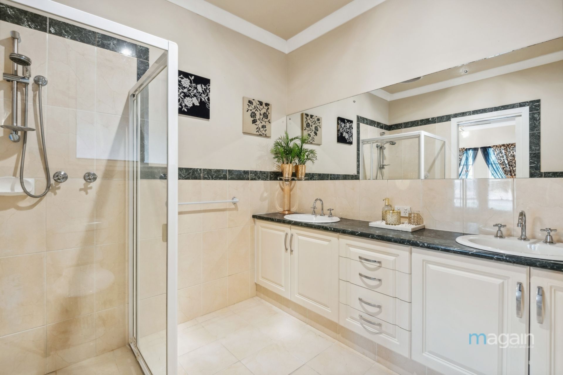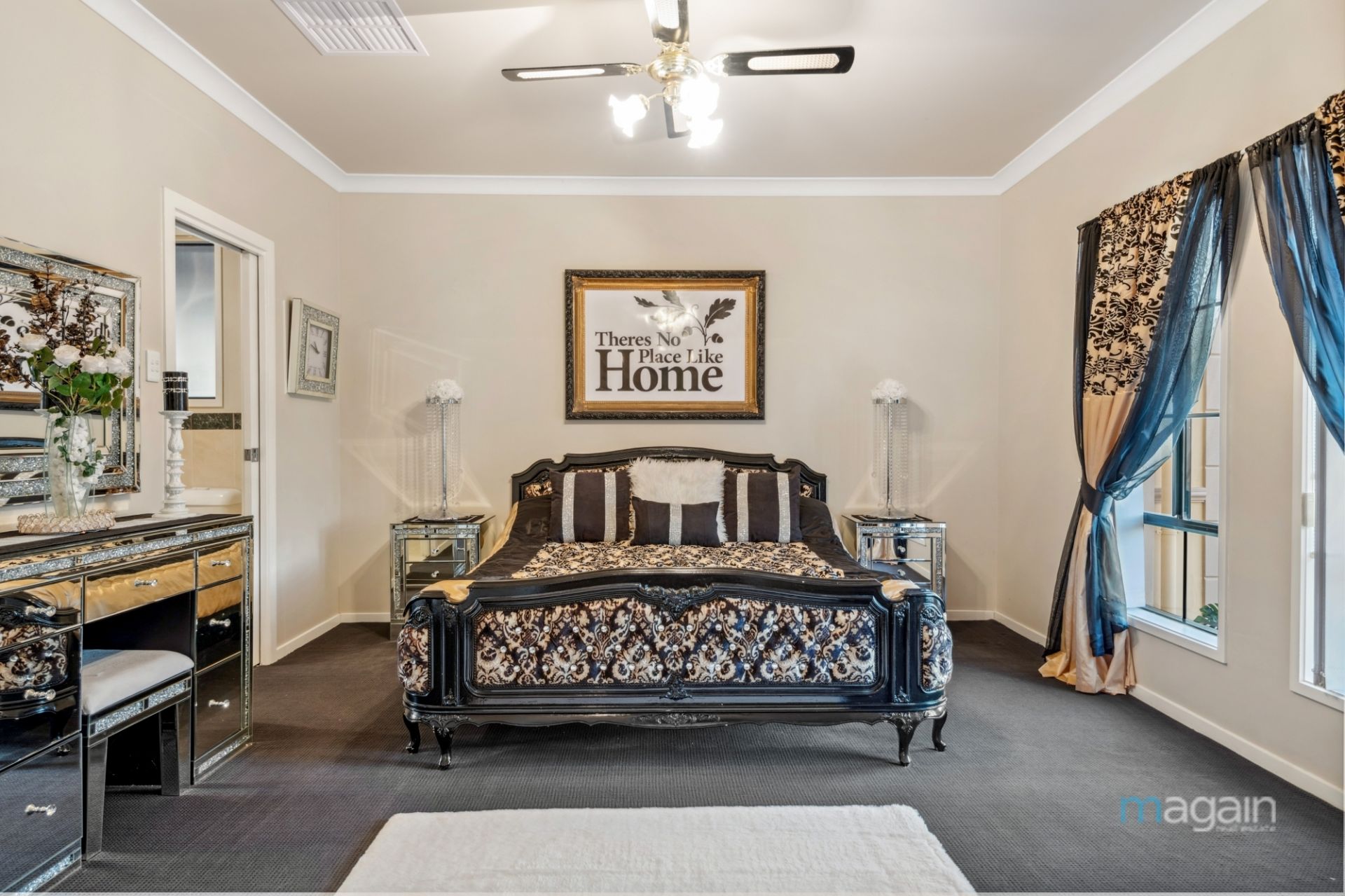 Step inside, and you'll find a seamless flow between the various living spaces along with high ceilings throughout the home adding an extra sense of spaciousness. At the front of the home is the formal living and dining area, with bulkhead ceilings, the perfect space to use as a second lounge room away from the main heart of the home. To the right of the hallway is the main bedroom, beautifully designed offering an en-suite finished with large double sink vanity, and a generous walk-in robe.