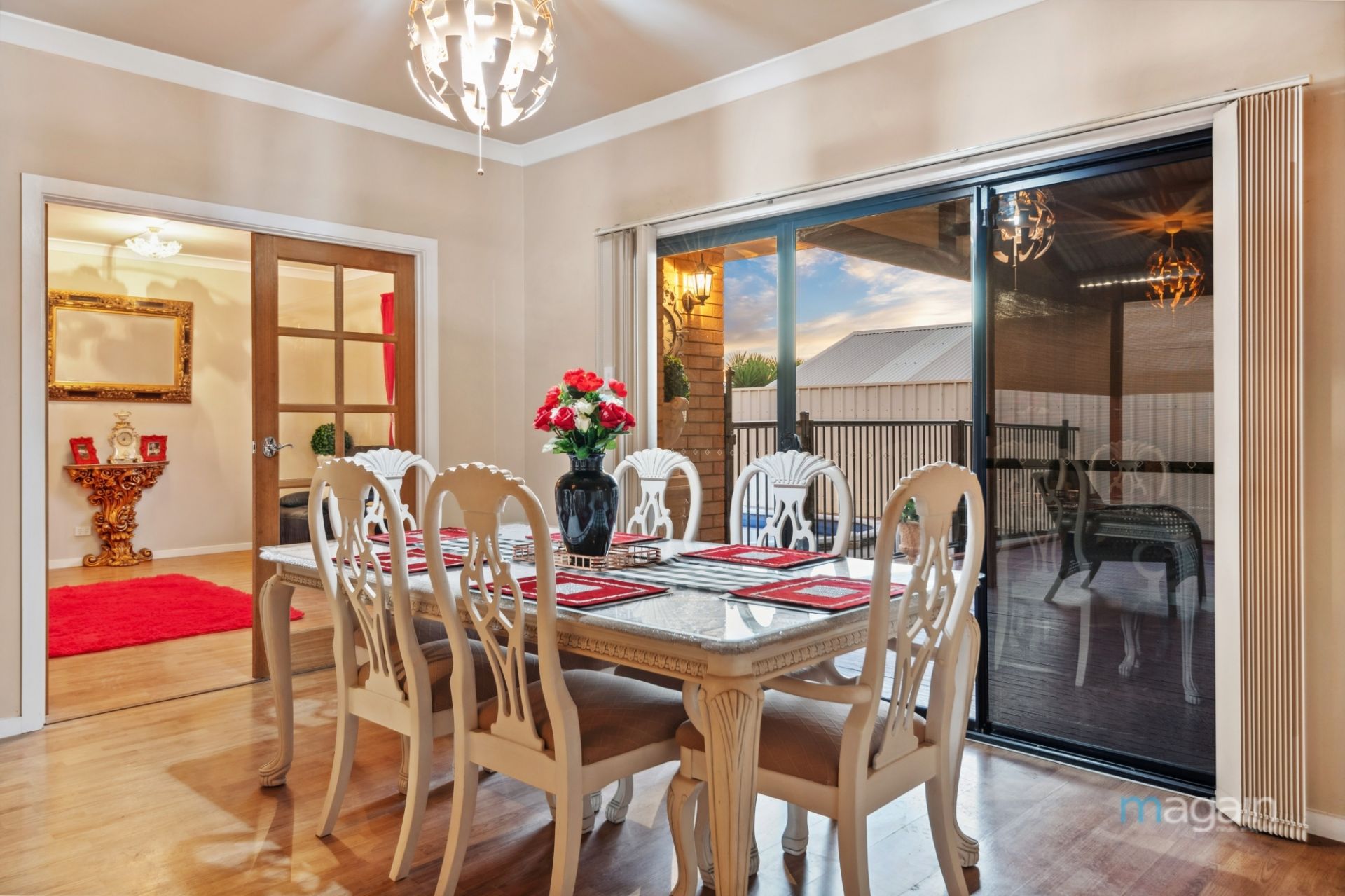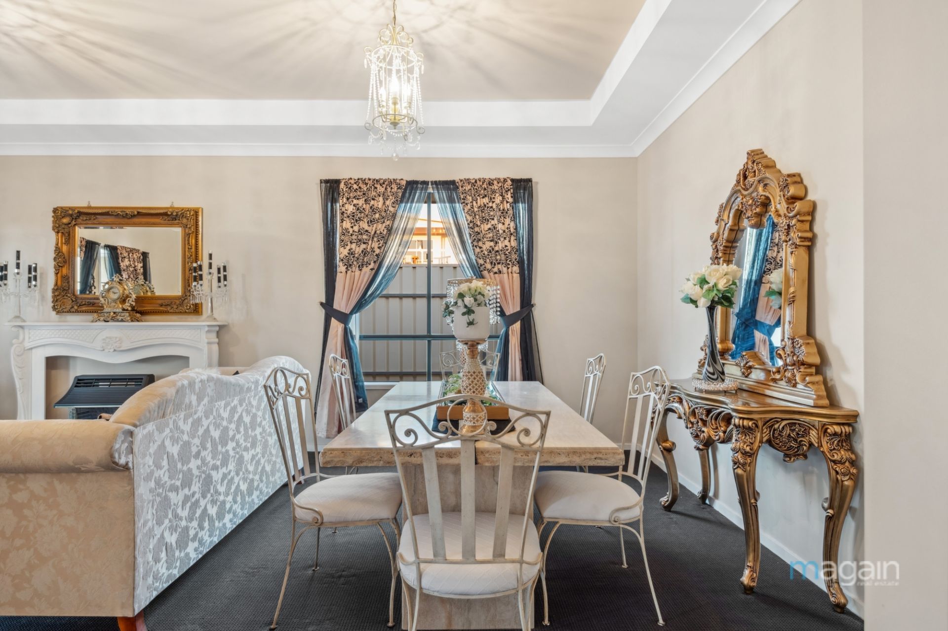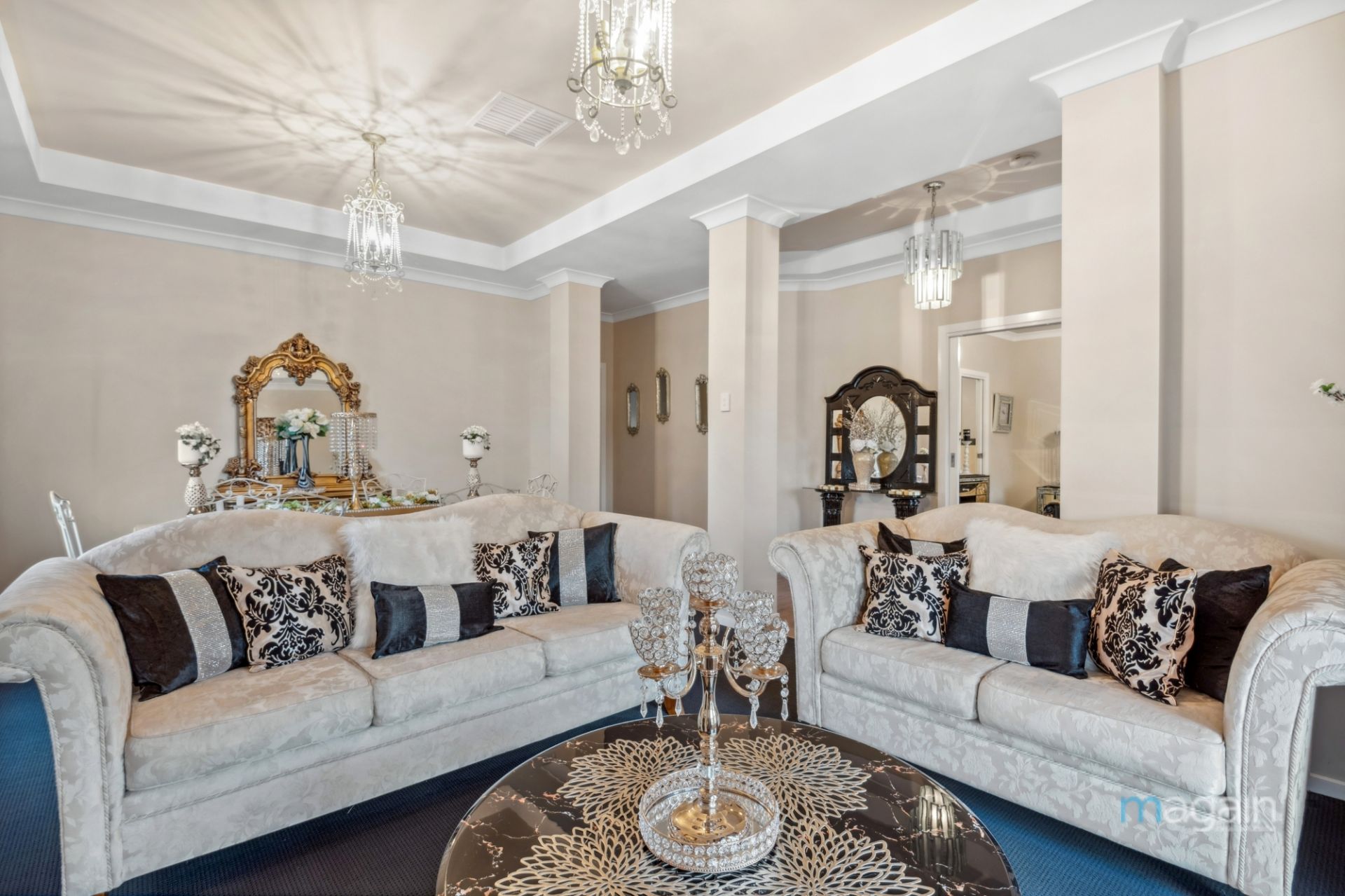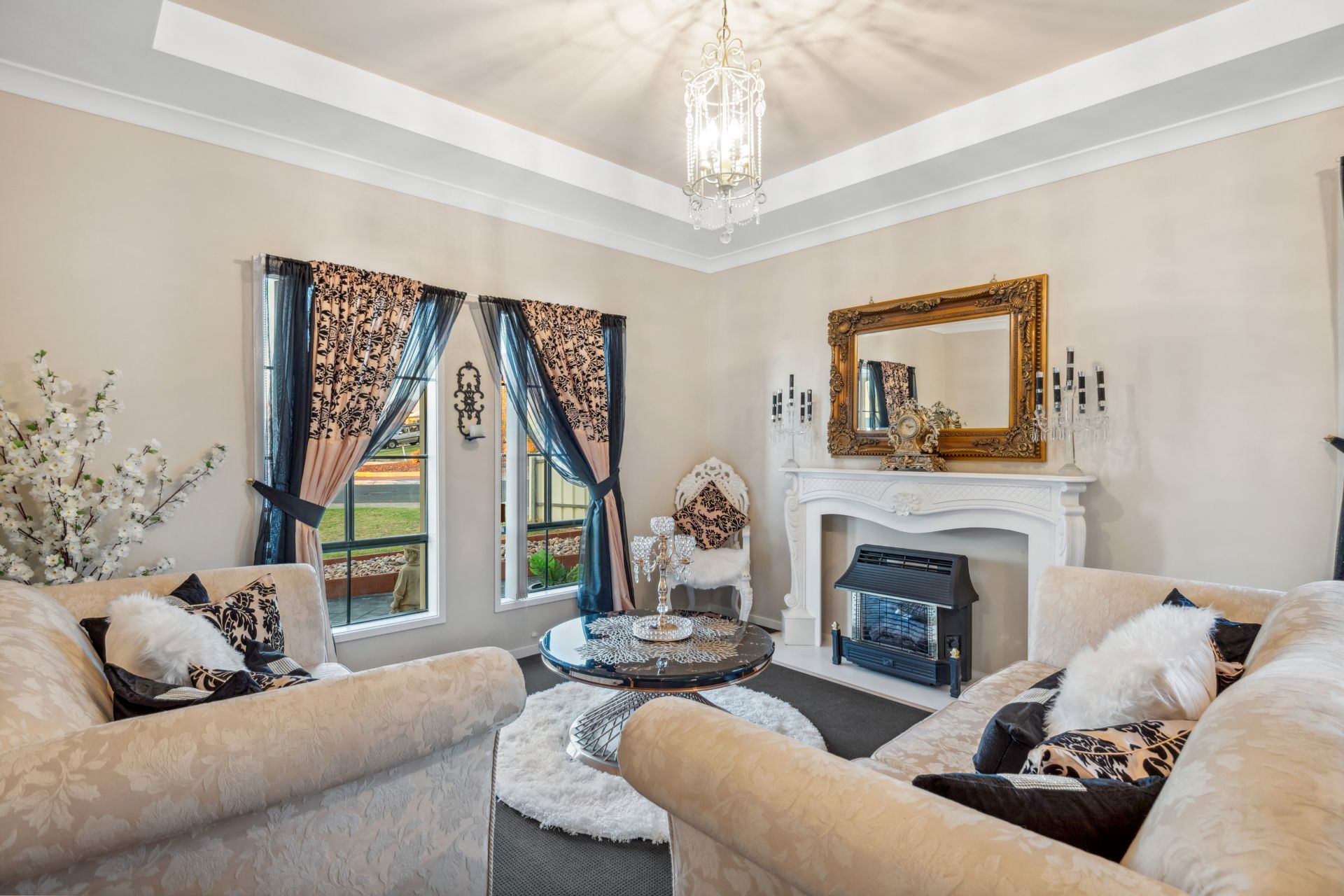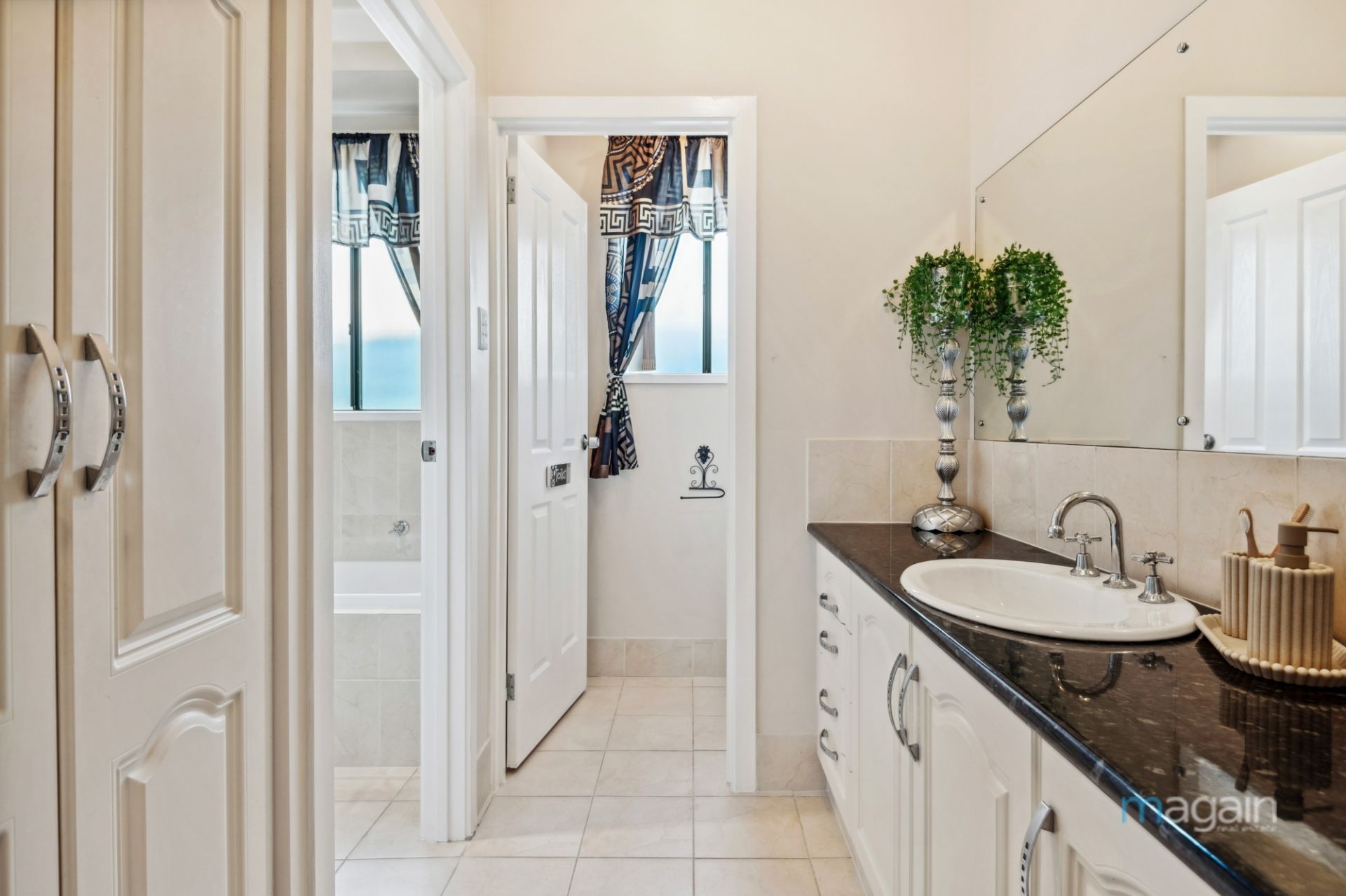 Step inside, and you'll find a seamless flow between the various living spaces along with high ceilings throughout the home adding an extra sense of spaciousness. At the front of the home is the formal living and dining area, with bulkhead ceilings, the perfect space to use as a second lounge room away from the main heart of the home. To the right of the hallway is the main bedroom, beautifully designed offering an en-suite finished with large double sink vanity, and a generous walk-in robe.