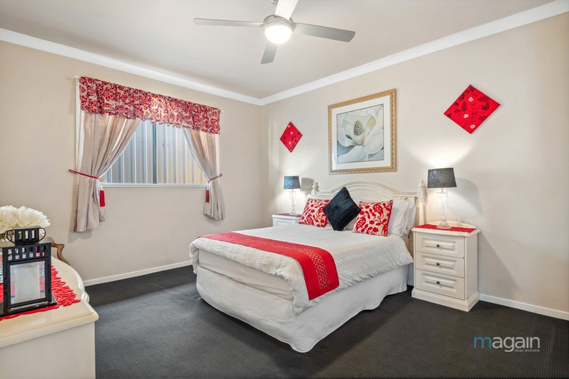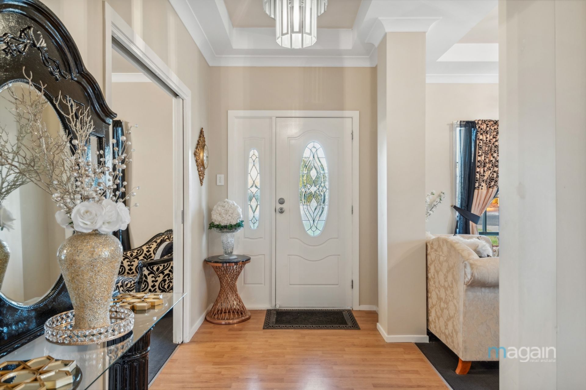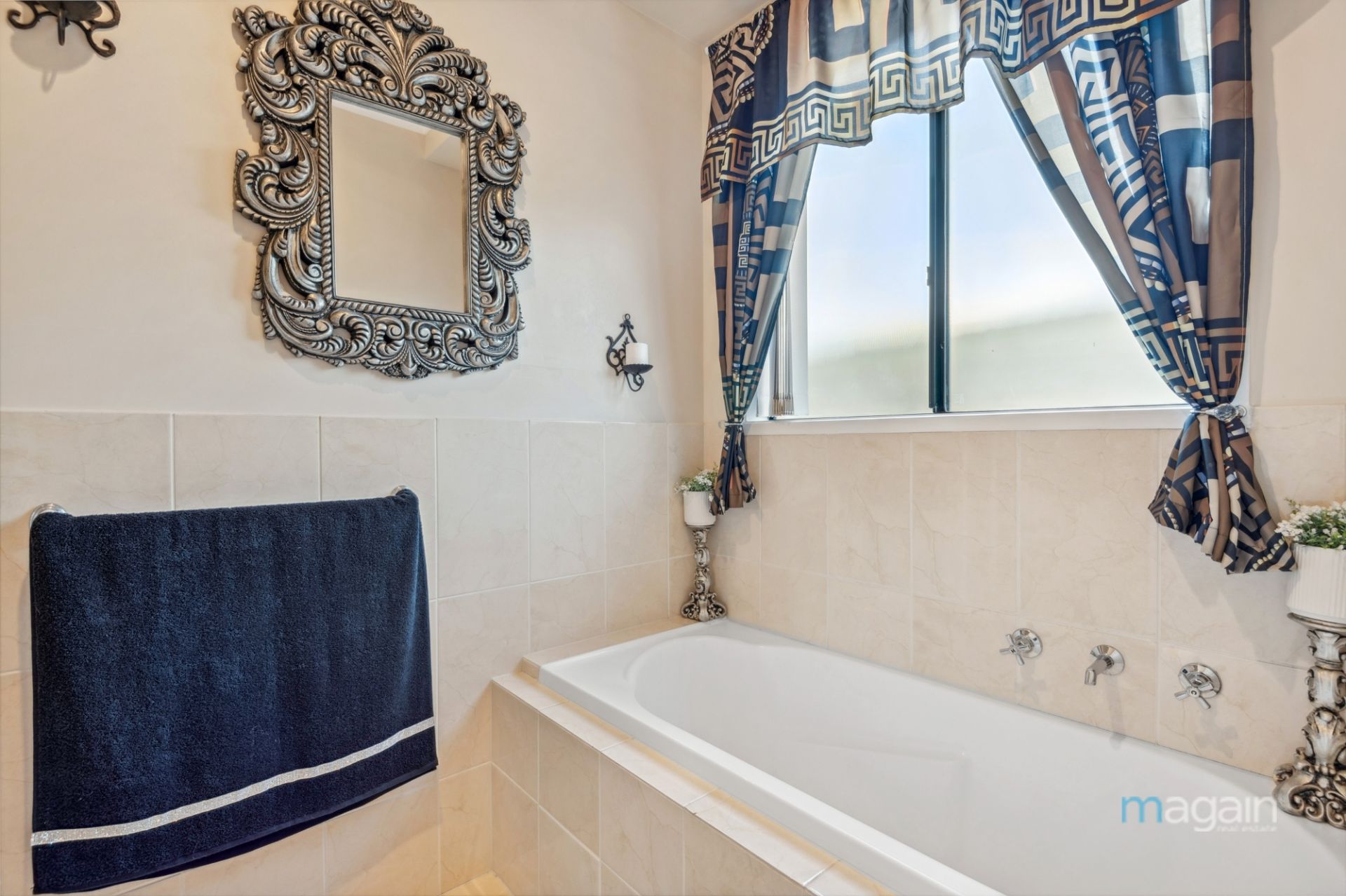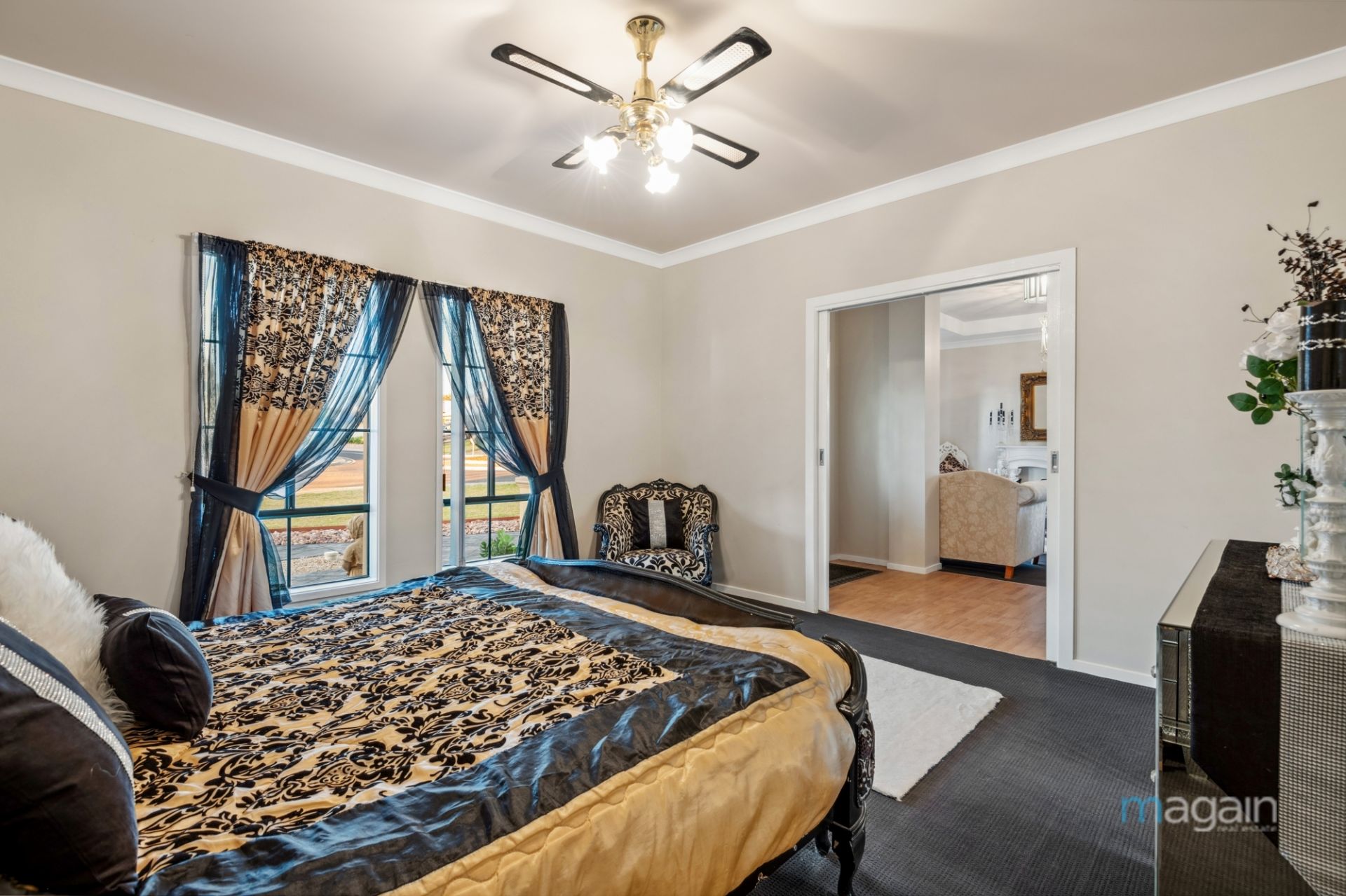 Step inside, and you'll find a seamless flow between the various living spaces along with high ceilings throughout the home adding an extra sense of spaciousness. At the front of the home is the formal living and dining area, with bulkhead ceilings, the perfect space to use as a second lounge room away from the main heart of the home. To the right of the hallway is the main bedroom, beautifully designed offering an en-suite finished with large double sink vanity, and a generous walk-in robe.