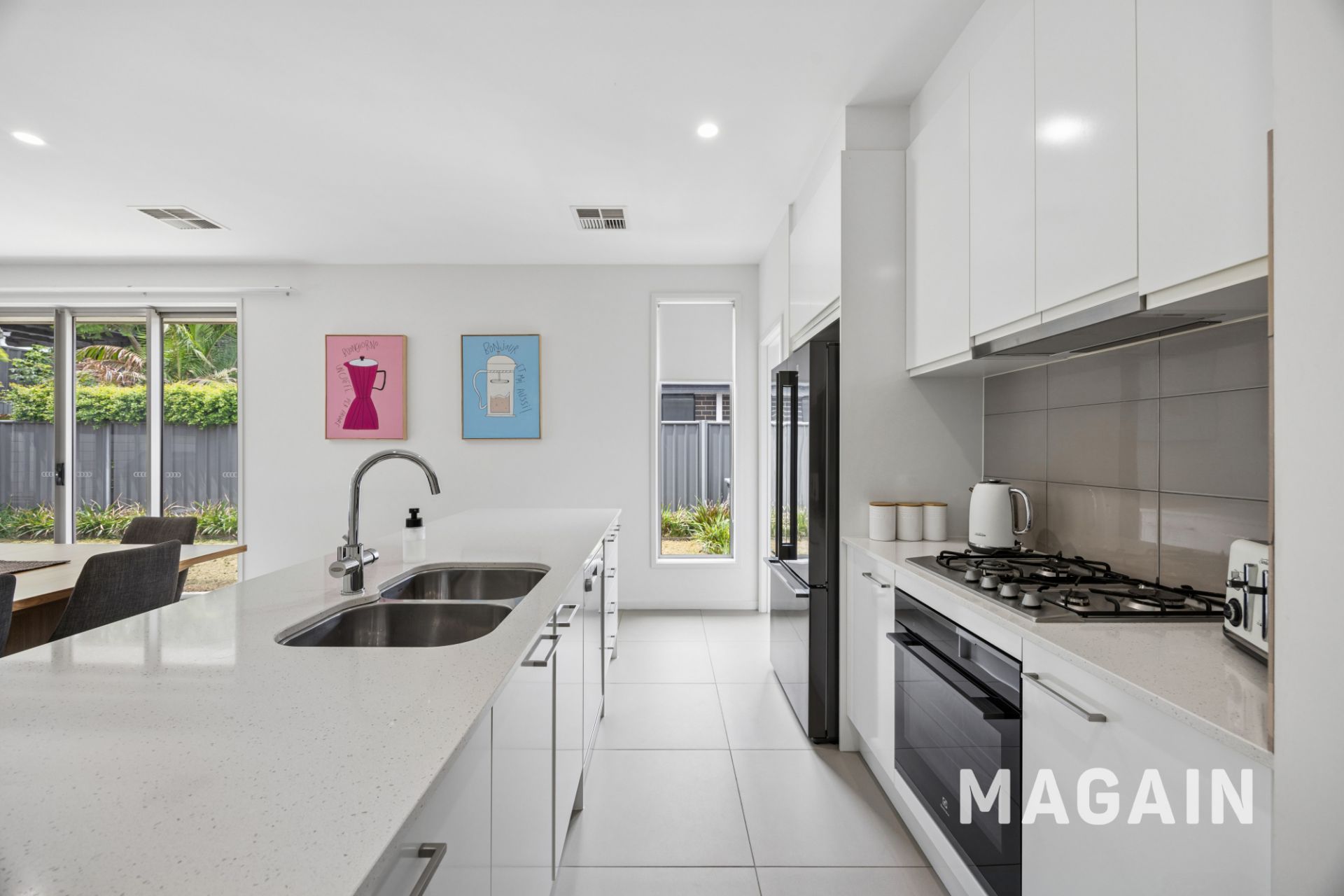 The kitchen combines style and functionality with a contemporary design, featuring abundant white cabinetry, light countertops, and a contrasting dark tile backsplash that provides a versatile backdrop for any décor. Equipped with high-quality appliances, including a 4-burner gas cooktop with rangehood, oven, and dishwasher, meal preparation and cleanup are effortless. Additional highlights include a spacious walk-in pantry, dedicated fridge nook, double sink, and a breakfast/serving bench ideal for casual dining and entertaining.