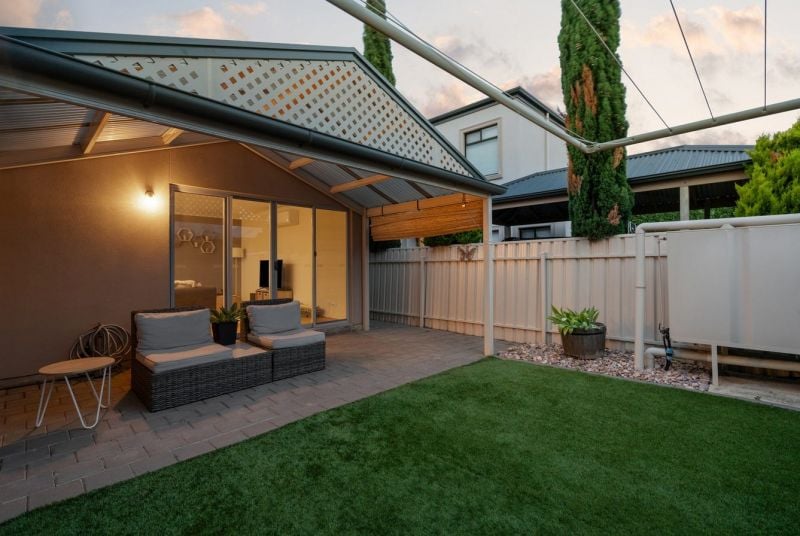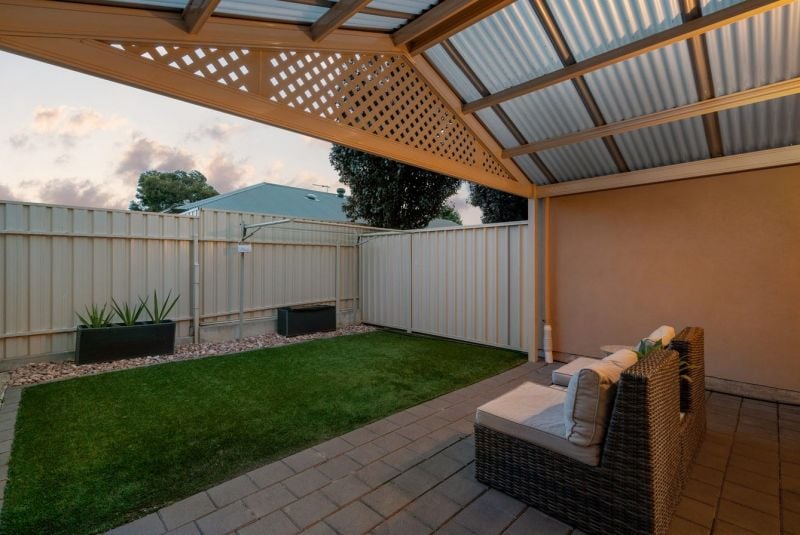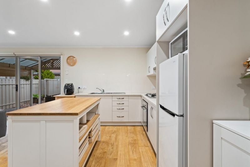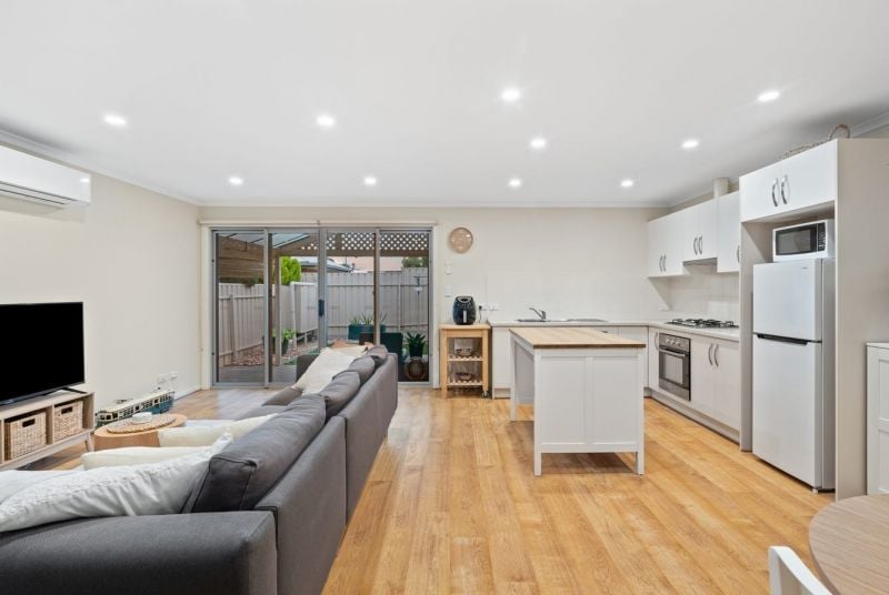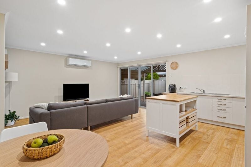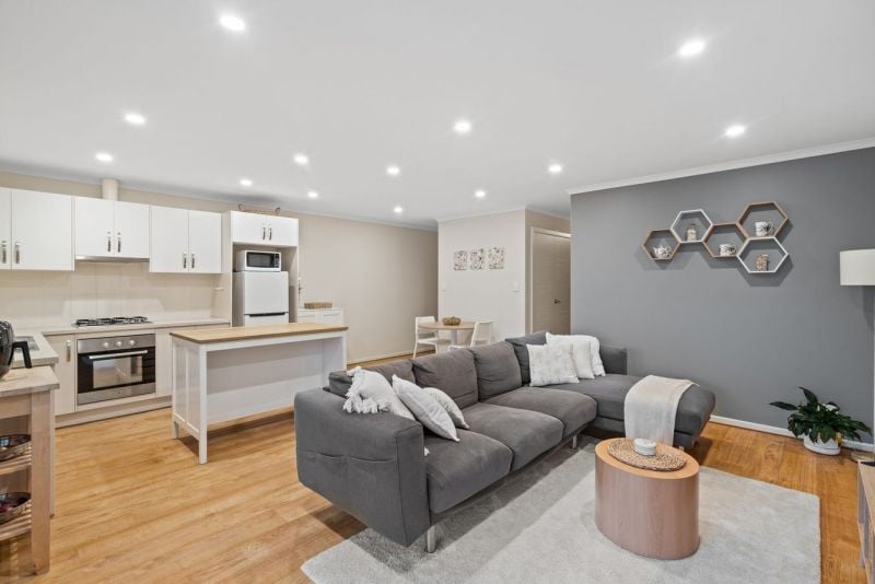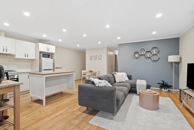 At the rear of the home is the well-equipped kitchen which comes with loads of storage, stainless steel gas cooker and dishwasher. The home also features a split system air conditioner, ensuring year-round comfort, while sleek timber flooring adds a touch of modern elegance throughout. The living and dining area seamlessly open out to a low maintenance private area where you can entertain guests or simply relax.