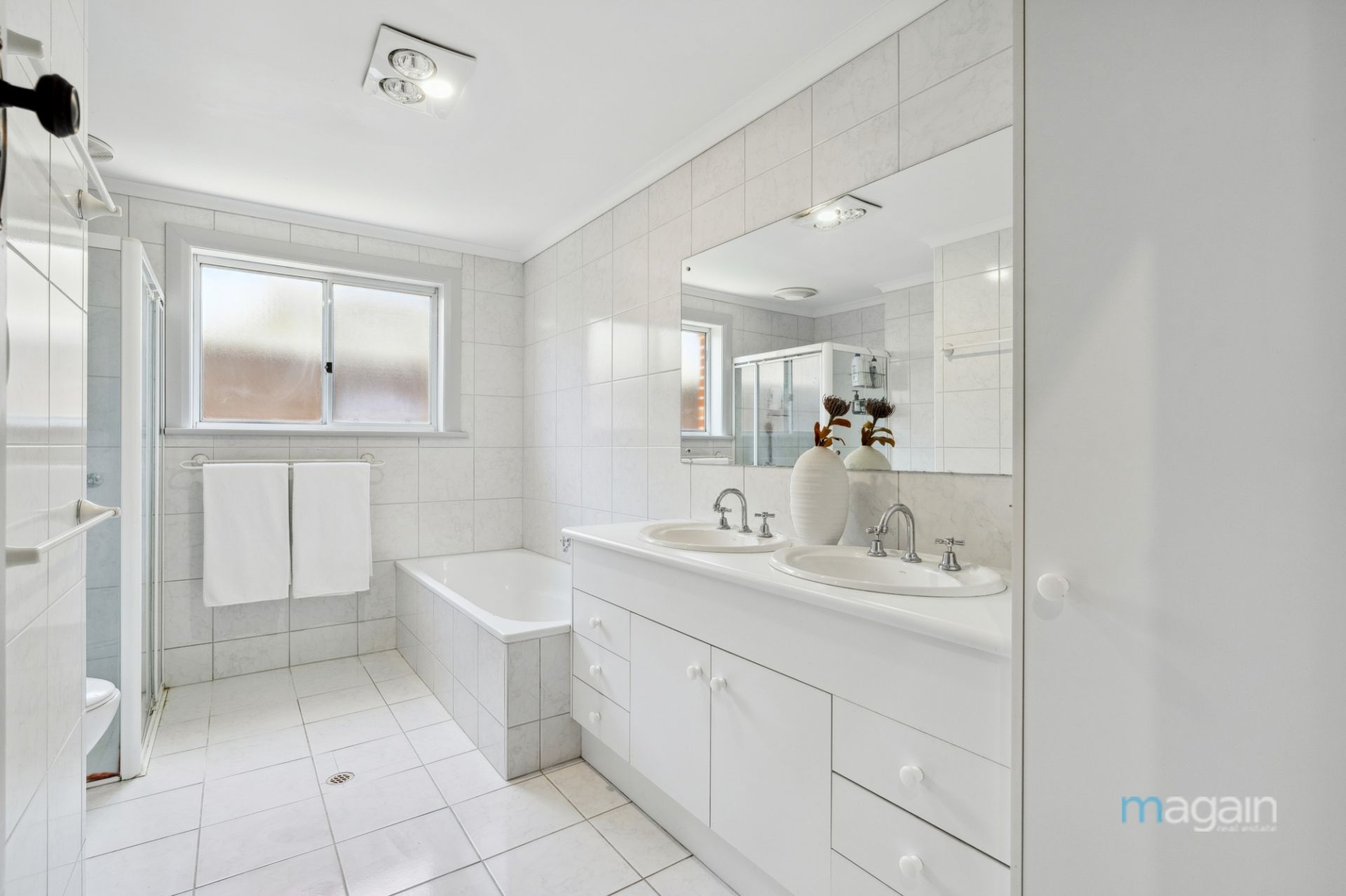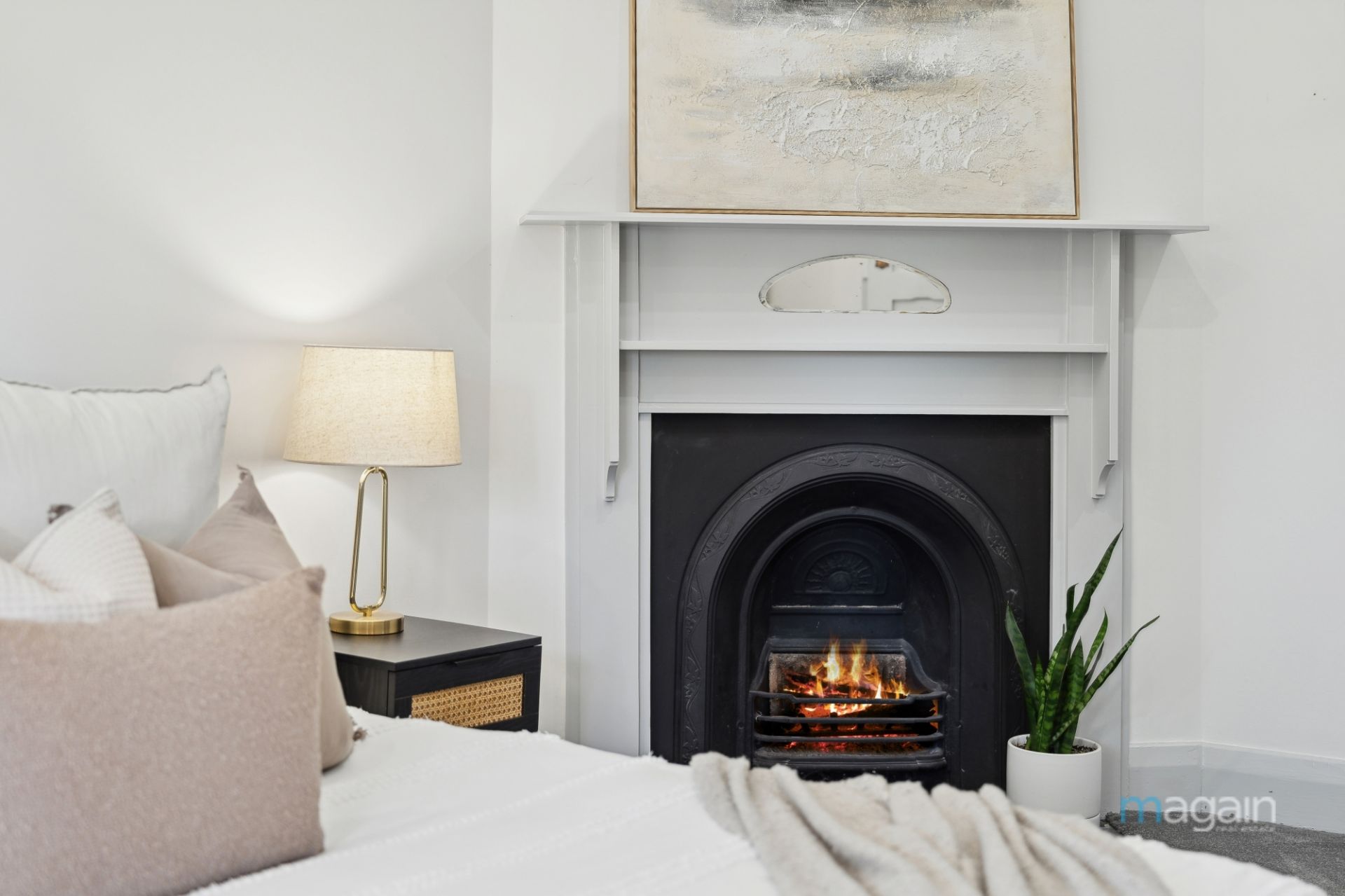 The front-positioned master bedroom serves as a serene retreat, complete with two freestanding built-in robes and a charming fireplace for added character. Bedroom two features a cosy gas heater, while bedroom three includes a bookshelf and a built-in robe for ample storage. Each bedroom enjoys easy access to a beautifully designed bathroom, complete with a his-and-hers vanity, shower, bath, and toilet. An additional powder room off the laundry provides added convenience for guests, enhancing the home's thoughtful layout.