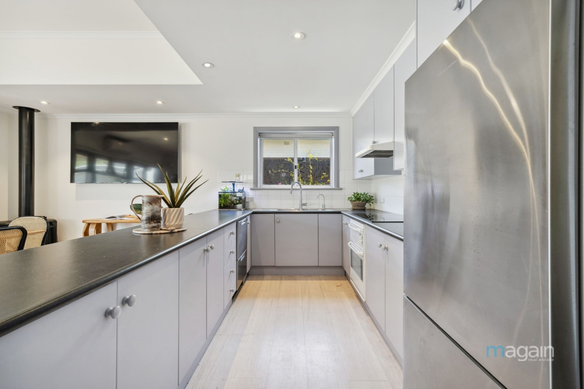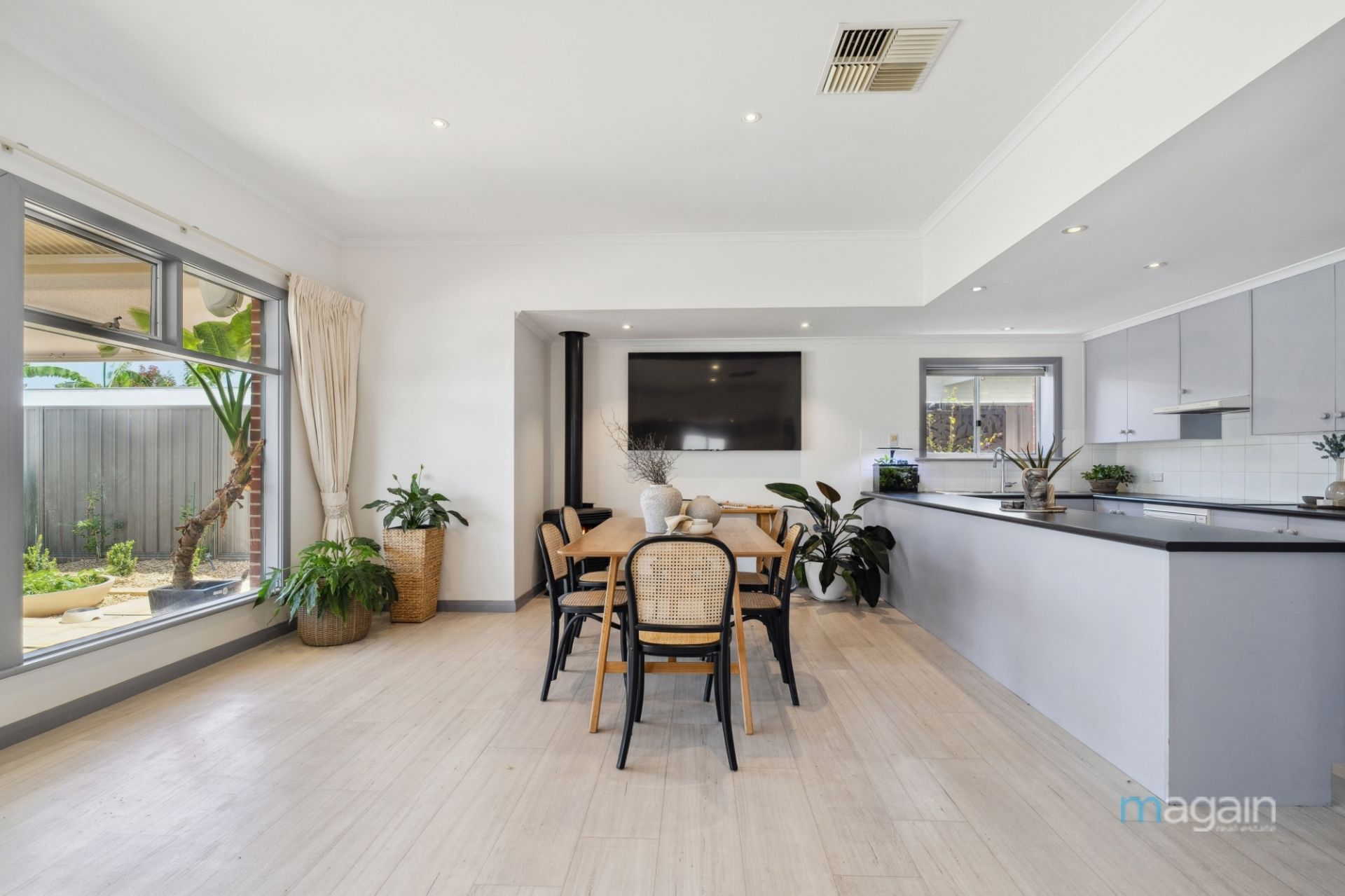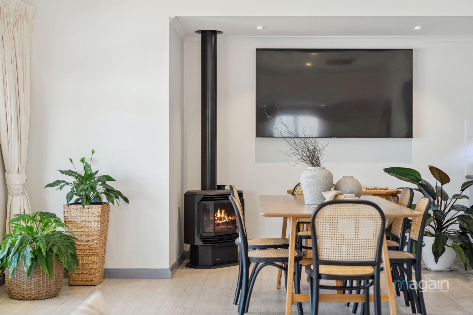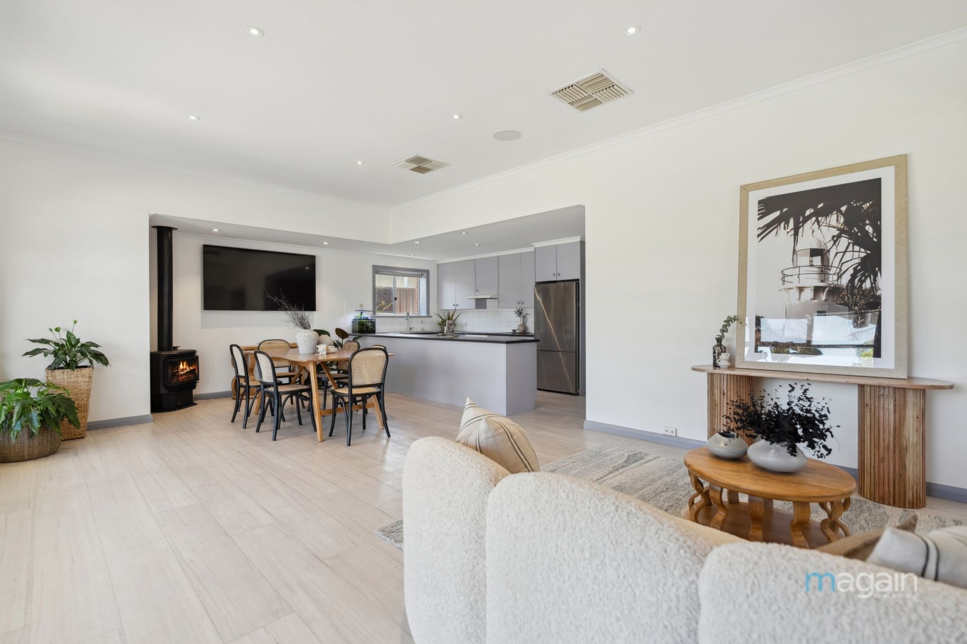 Step into a welcoming hallway with impressive high ceilings that lead you into the heart of the home, a spacious, light-filled open-plan kitchen, lounge, and dining area. Centered around a cosy combustion fireplace, this inviting space flows effortlessly to an expansive alfresco entertaining area, creating a seamless blend of indoor and outdoor living. Freshly painted, an elegant combination of brand new carpets, and timber-look flooring throughout exude sophistication, while split system heating, cooling, and ducted evaporative cooling ensure year-round comfort in style.