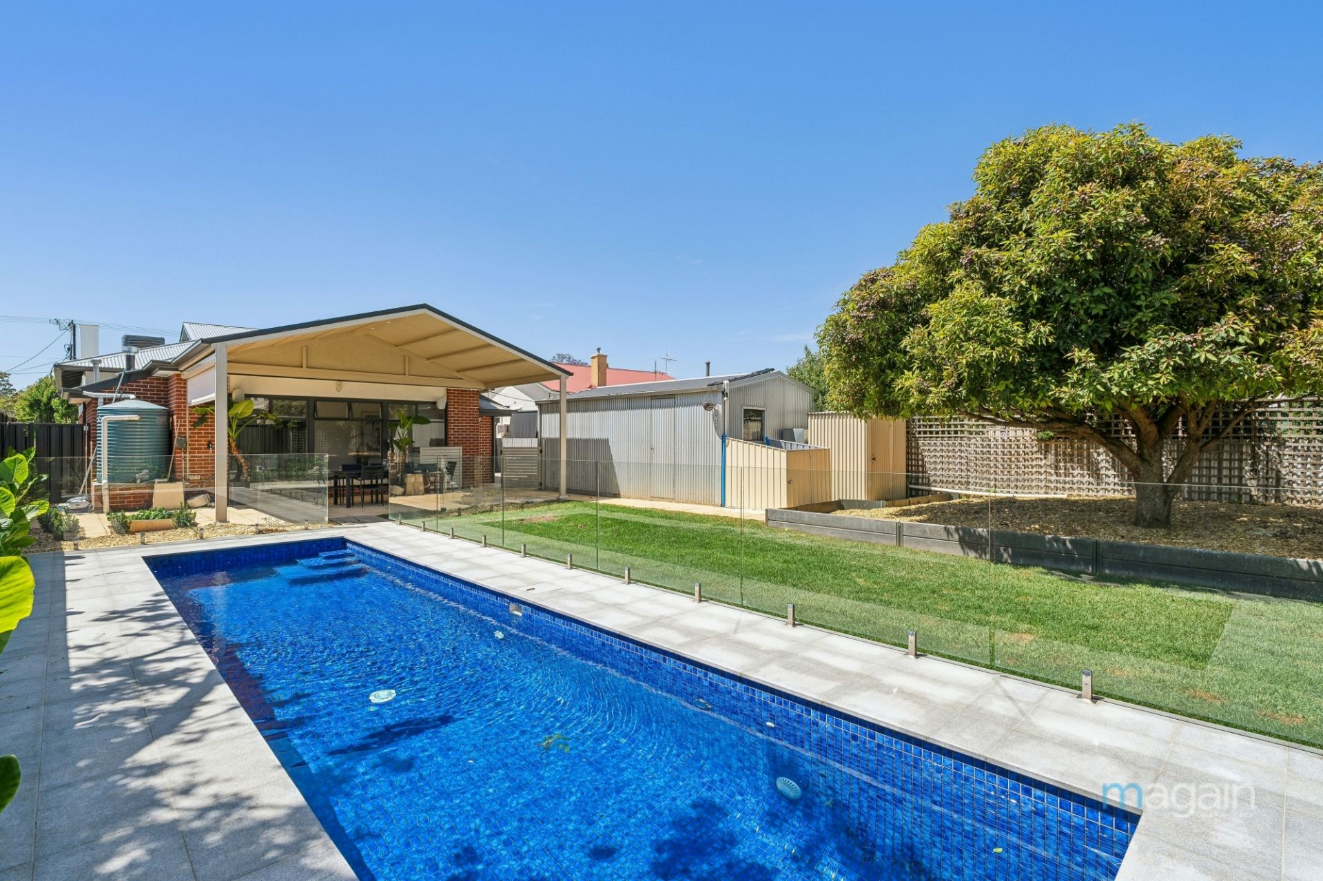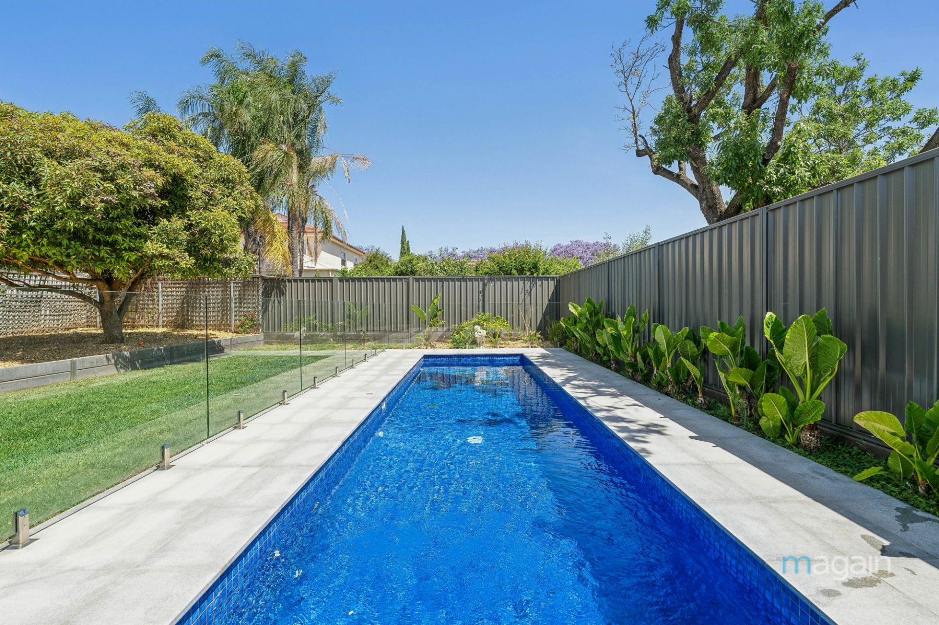 Step outside from the open-plan living area into a backyard crafted for unforgettable entertaining. A paved alfresco area, complete with a pitched roof pergola, modern LED lighting, and built-in surround sound, sets the perfect atmosphere for gatherings day or night. This inviting space overlooks a brand-new, solar-heated, tiled saltwater pool, a stunning centrepiece that promises endless relaxation. Beyond the pool, a generous lawn shaded by established trees offers ample space for family fun and outdoor activities, making this backyard a true haven for both leisure and lively events.
