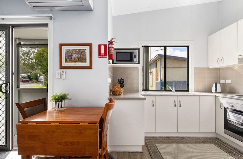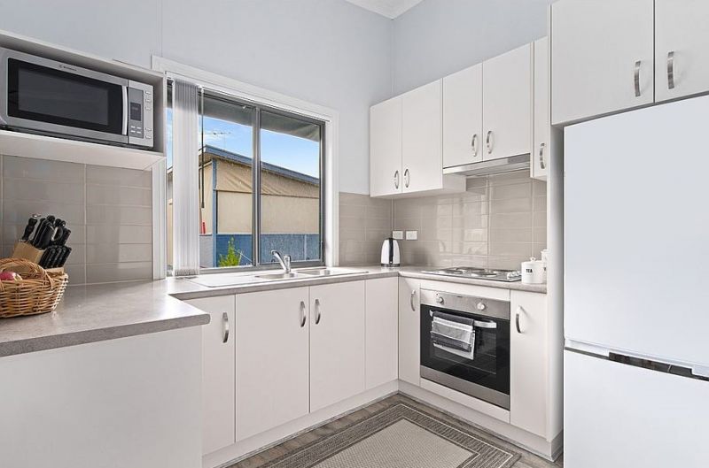 The modern kitchen has floating floors and incorporates electric cooking and gas hot water. Plenty of cupboard space here.