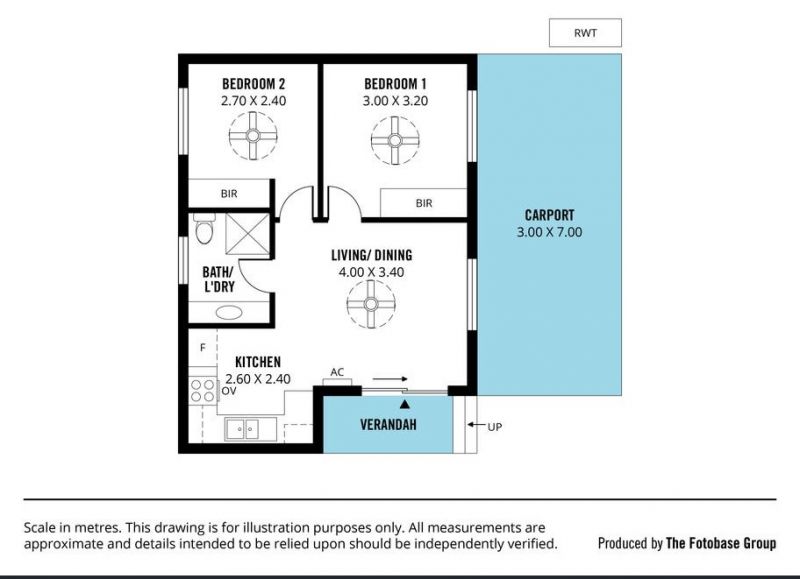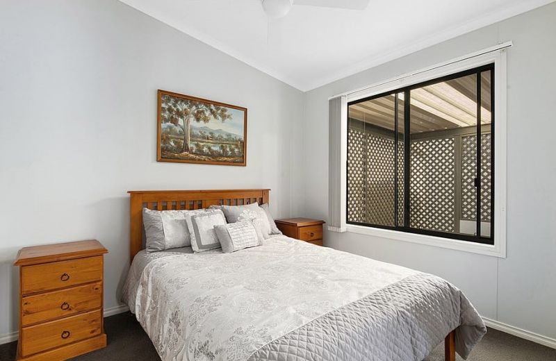 Lounge and bedrooms are carpeted, with built in robes and ceiling fans in both bedrooms.