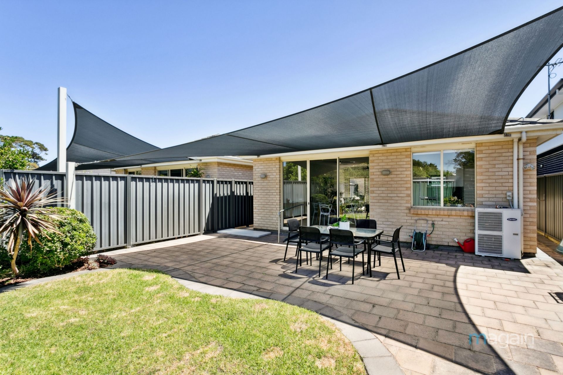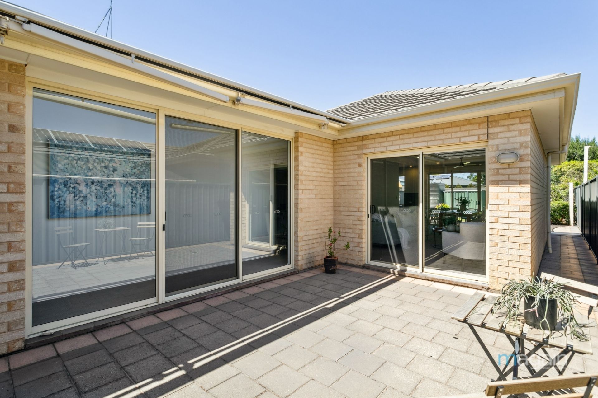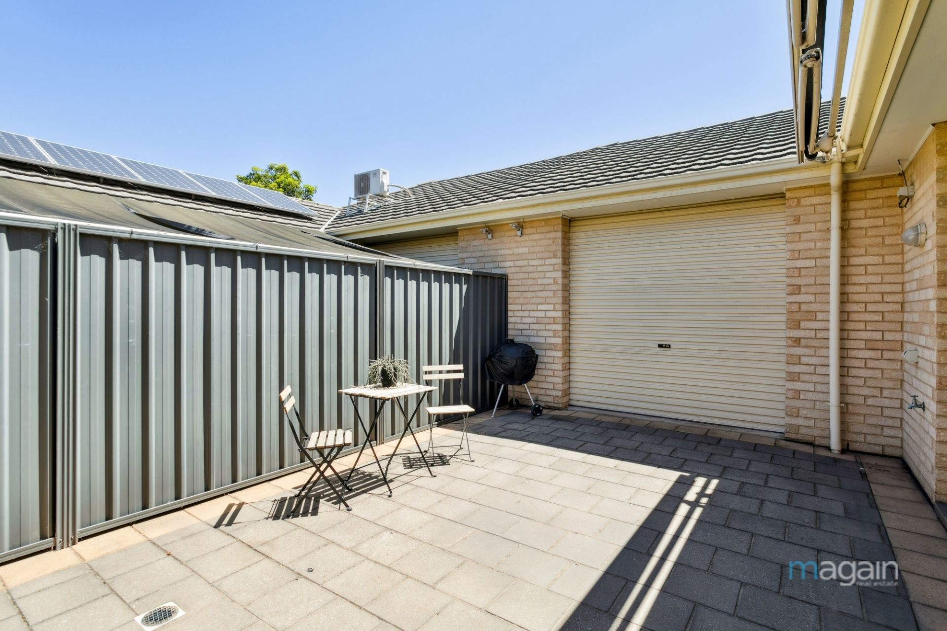 - Small paved courtyard at the side with a retractable pergola