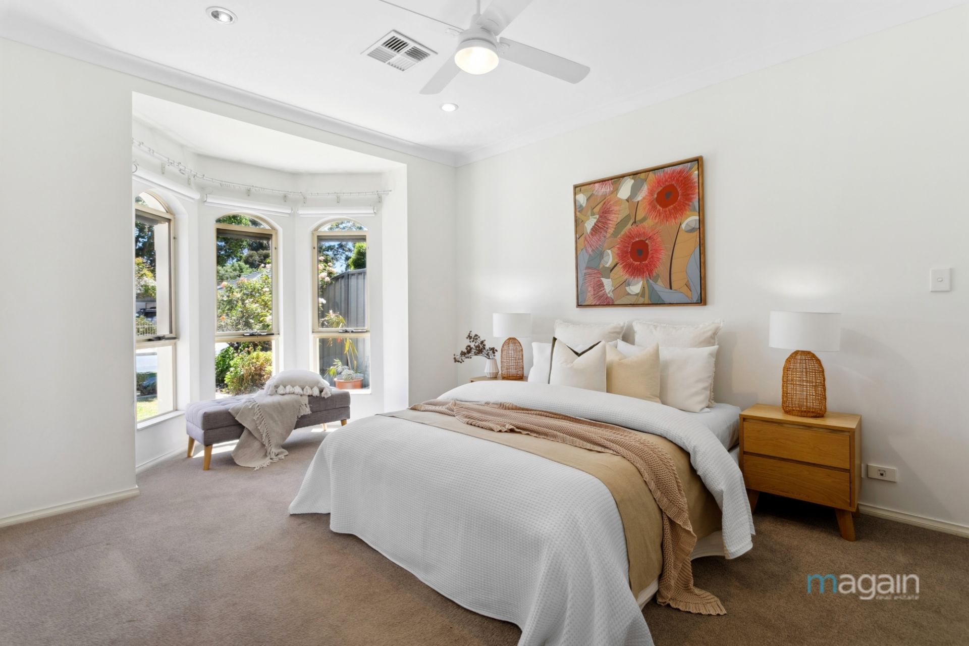 The generously sized master bedroom, positioned at the front, boasts a charming bay window surrounded by automatic blinds, and a walk-in robe leading to a private ensuite. Bedrooms two and three are complete with ceiling fans, built-in robes, and easy access to the modern three-way main bathroom, featuring a separate toilet and vanity-ideal for guests. Additional storage is provided by a large closet in the hallway and a built-in cupboard in the laundry.