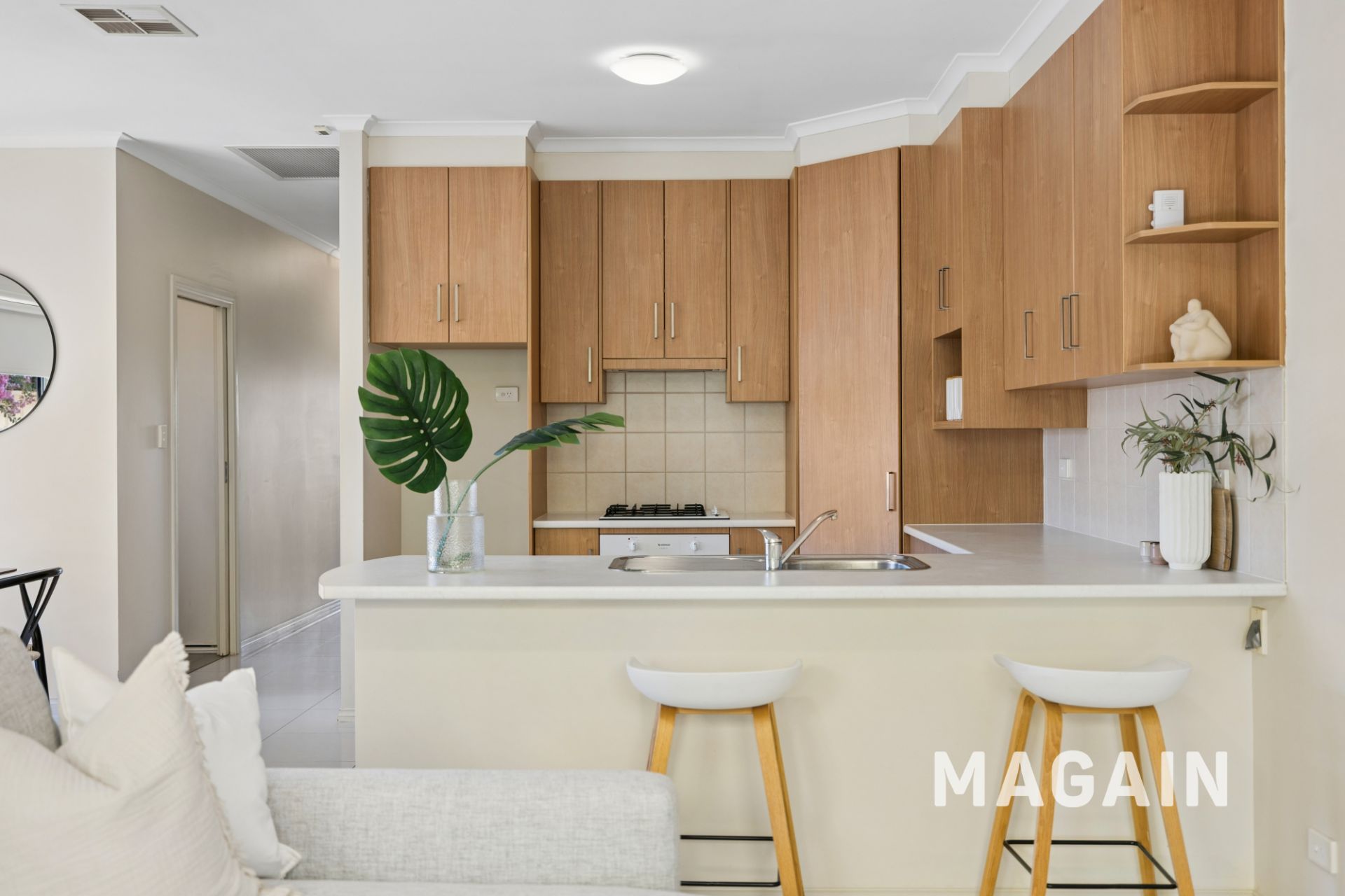 The kitchen is bright and neutral, featuring plenty of wooden cabinetry and light-coloured benchtops. Equipped with high-quality appliances, including a 4-burner cooktop with rangehood, oven, and dishwasher, it makes meal preparation and cleanup a breeze. Additional standout features include a spacious pantry, dedicated fridge and microwave spaces, and a convenient breakfast/serving bench, ideal for casual meals or entertaining guests.