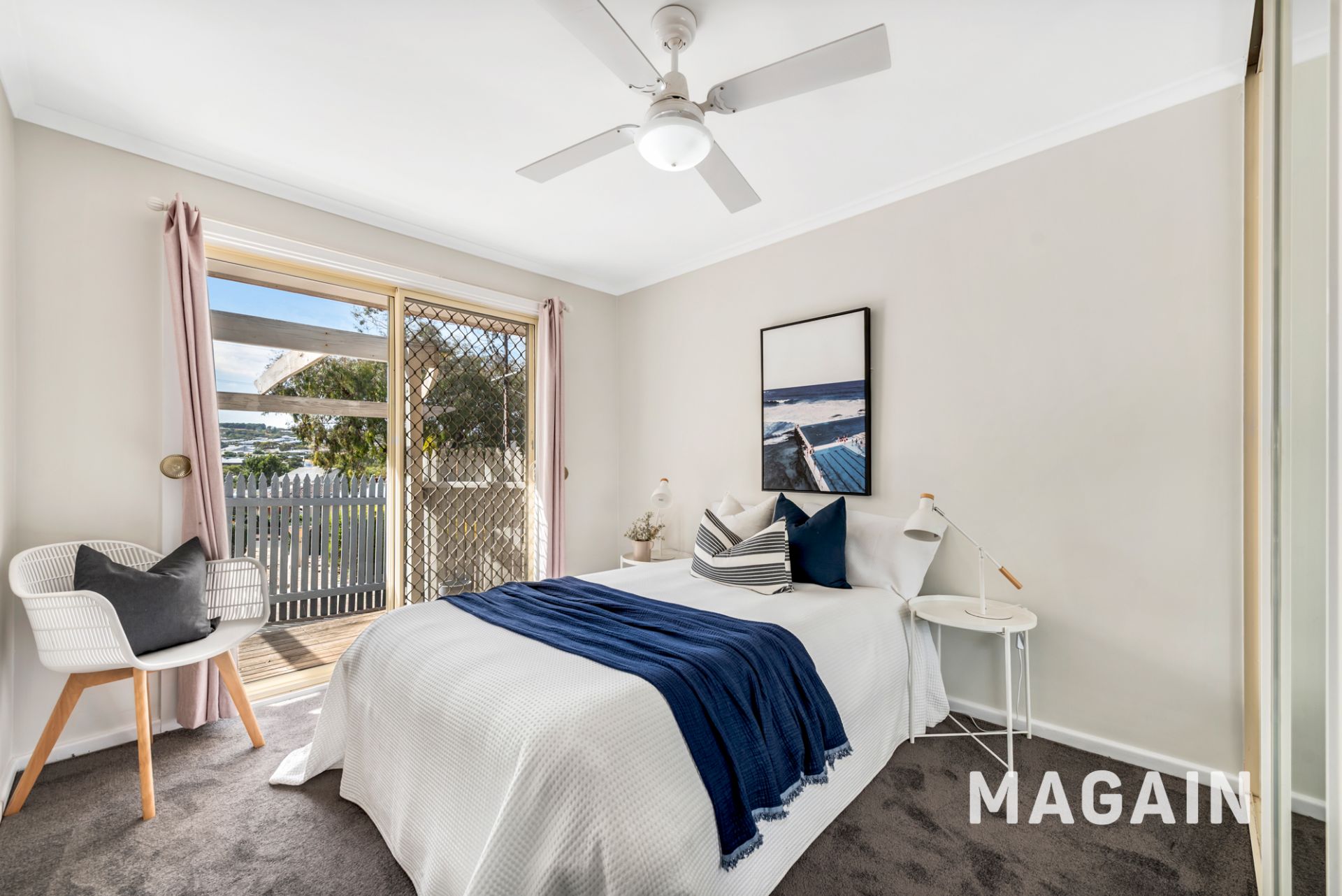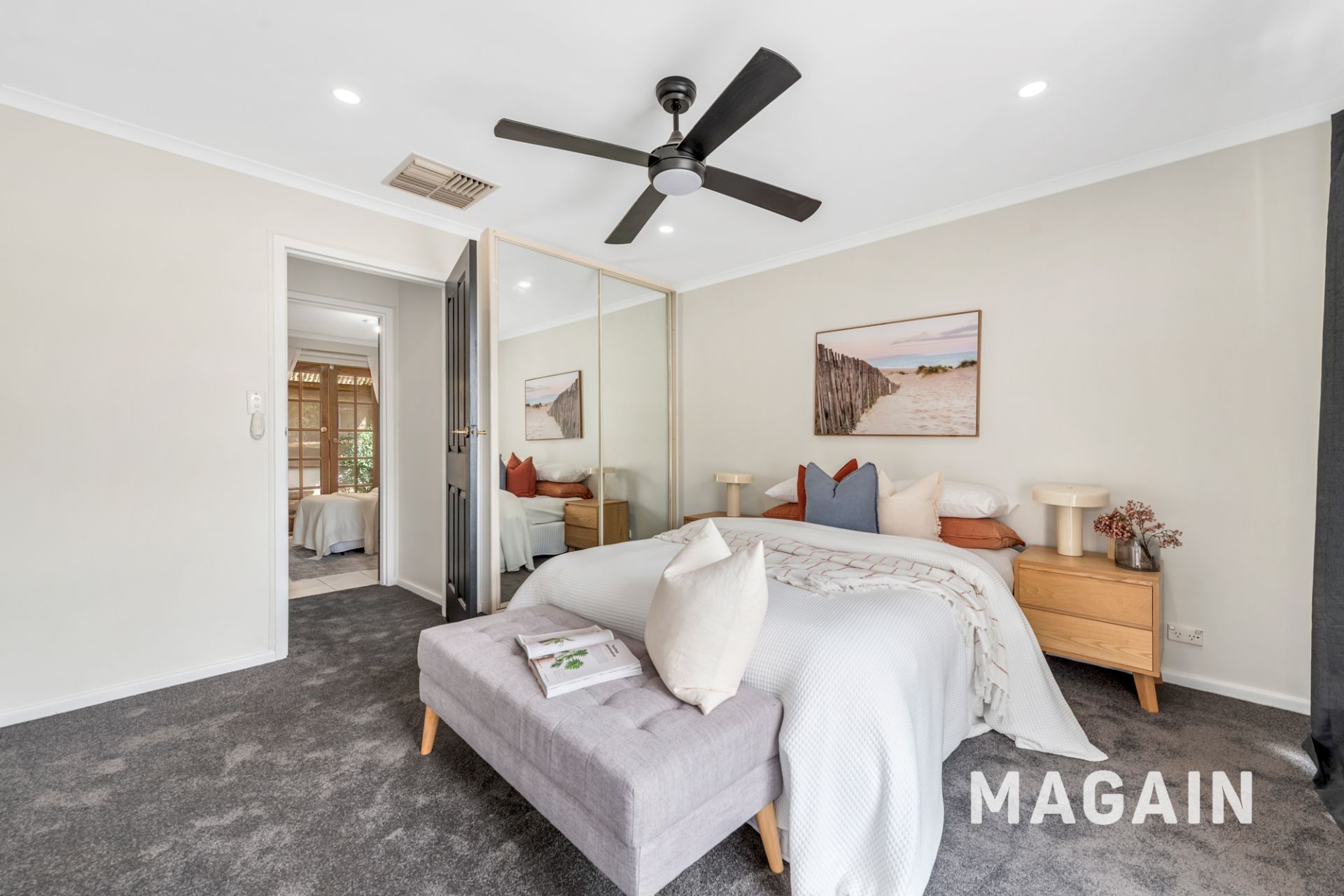 The home includes three bedrooms, all accessed via a central hallway and serviced by the main bathroom. Bedrooms one and two include built-in robes and new carpet. Storage is well catered for, with a long line cupboard positioned along the hallway. A separate office or retreat is located away from the main living areas, providing flexibility for use as a study, sitting room or additional living space.