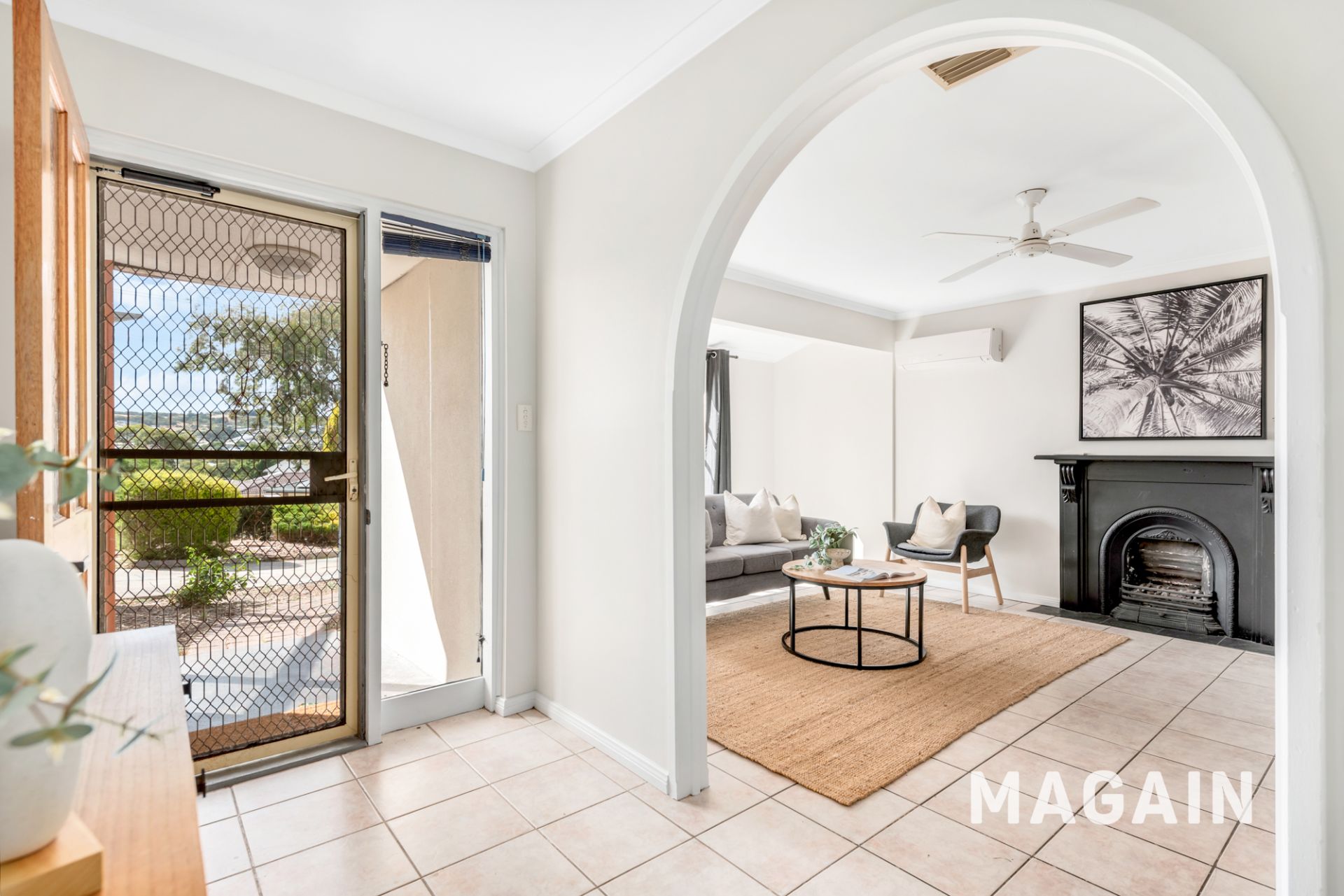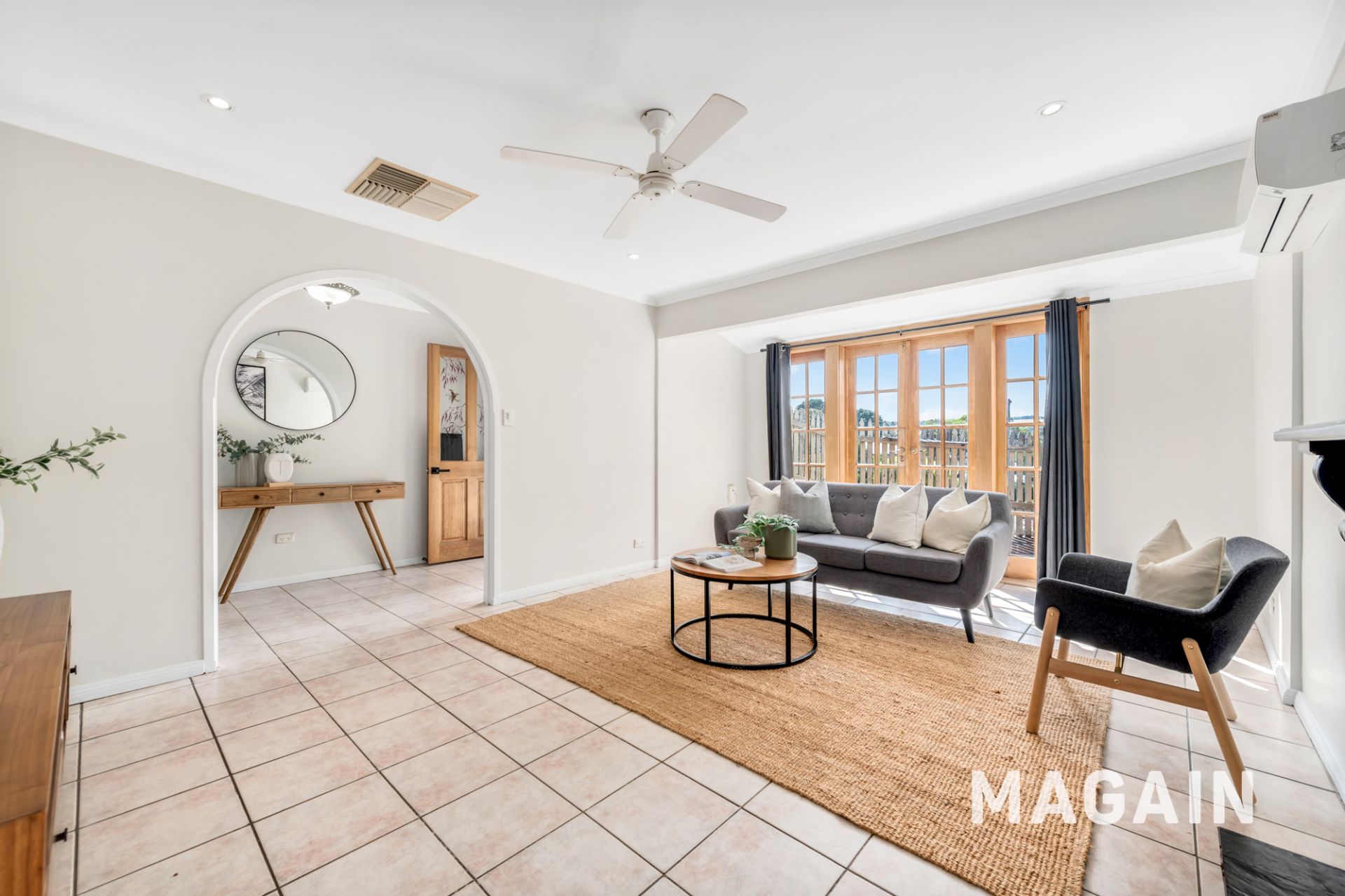 Upon entry, the home opens into the main lounge room, where neutral tones and an abundance of natural light create a welcoming atmosphere. This space is equipped with a split-system air conditioner, a fireplace, and French doors that lead out to a decked patio, seamlessly connecting indoor and outdoor living. The lounge flows through to a separate dining area, positioned adjacent to the kitchen. Ducted evaporative cooling services the home, complemented by ceiling fans throughout.