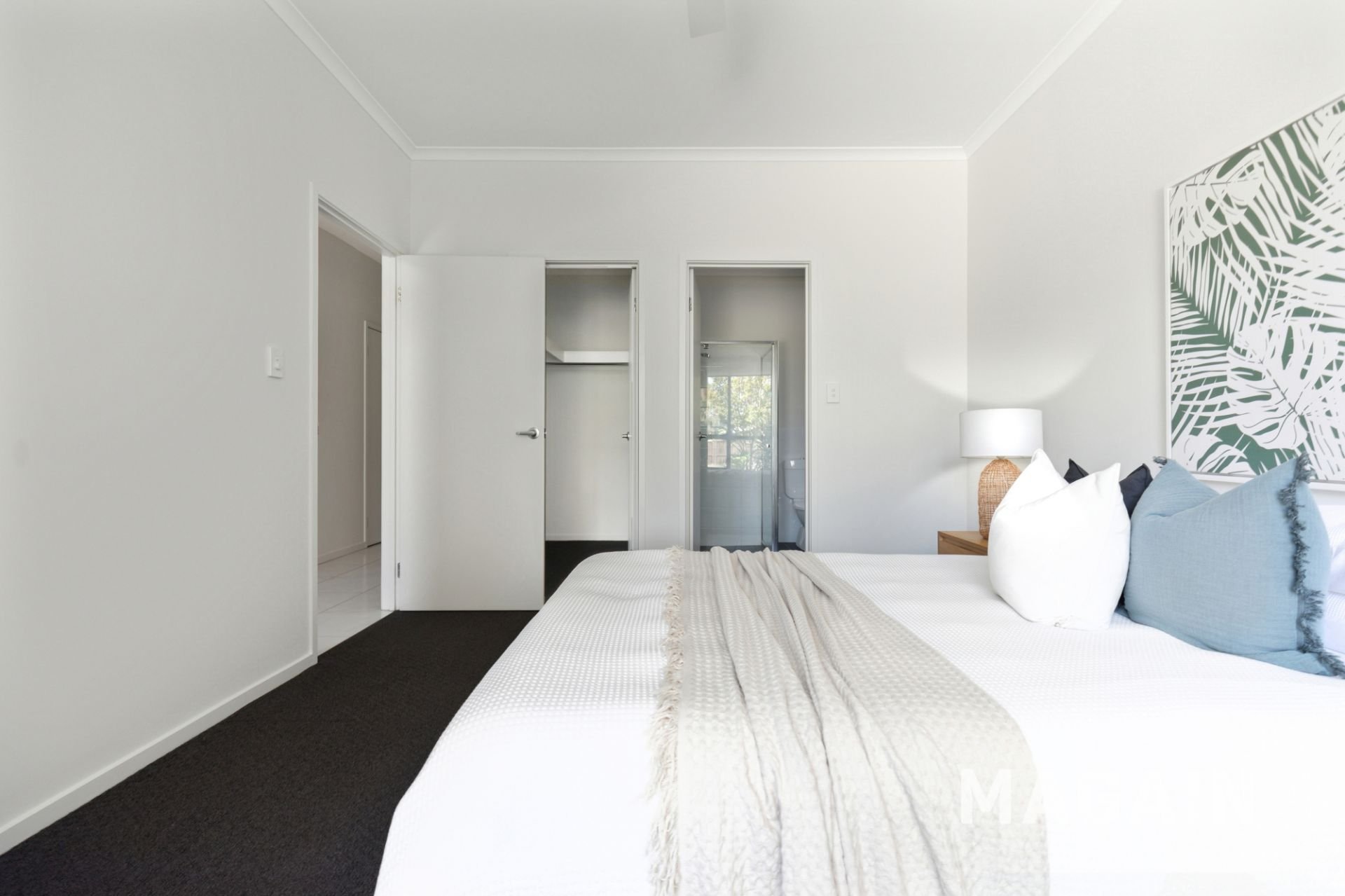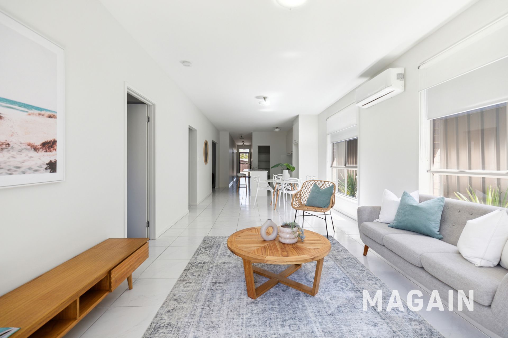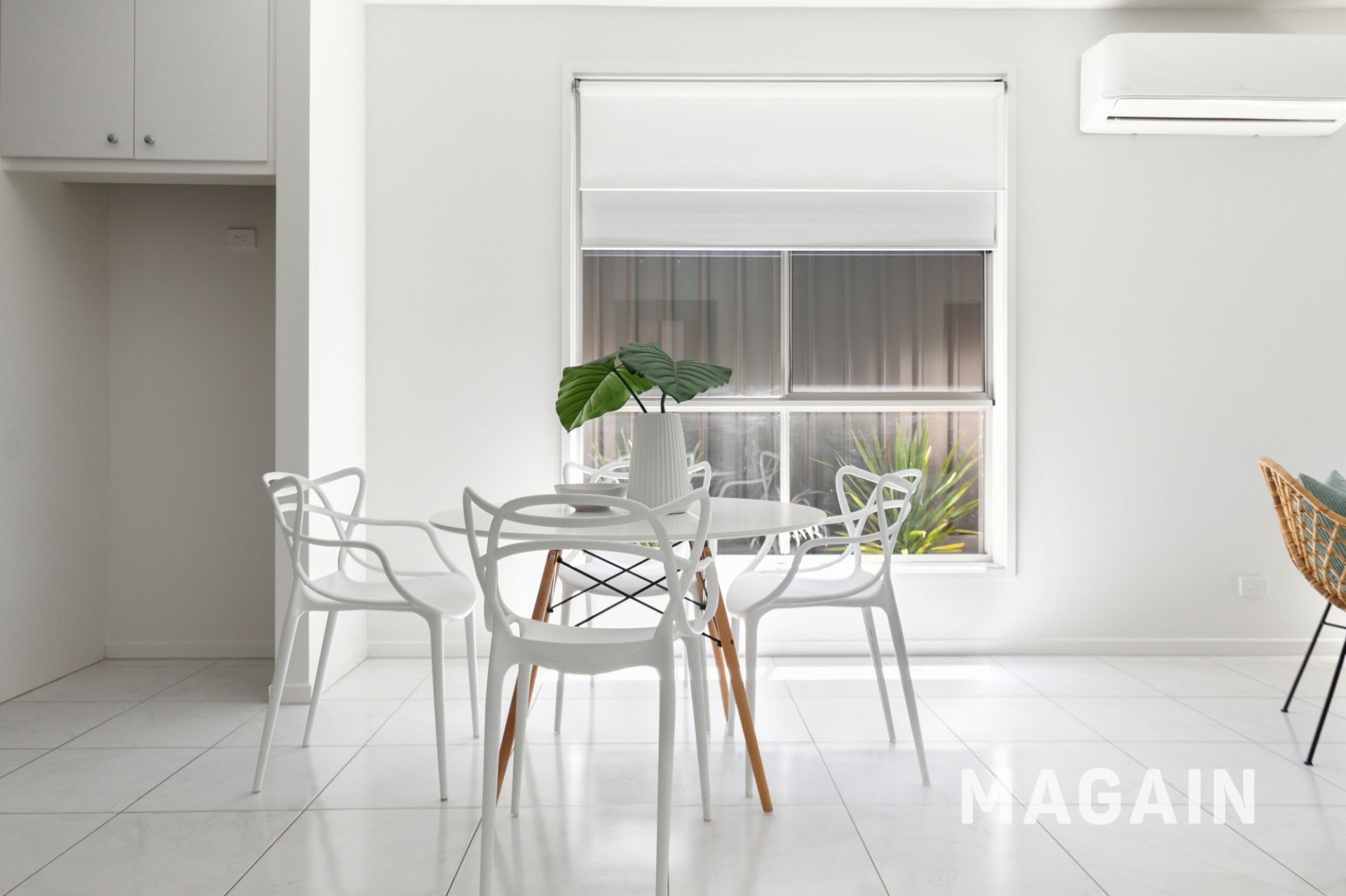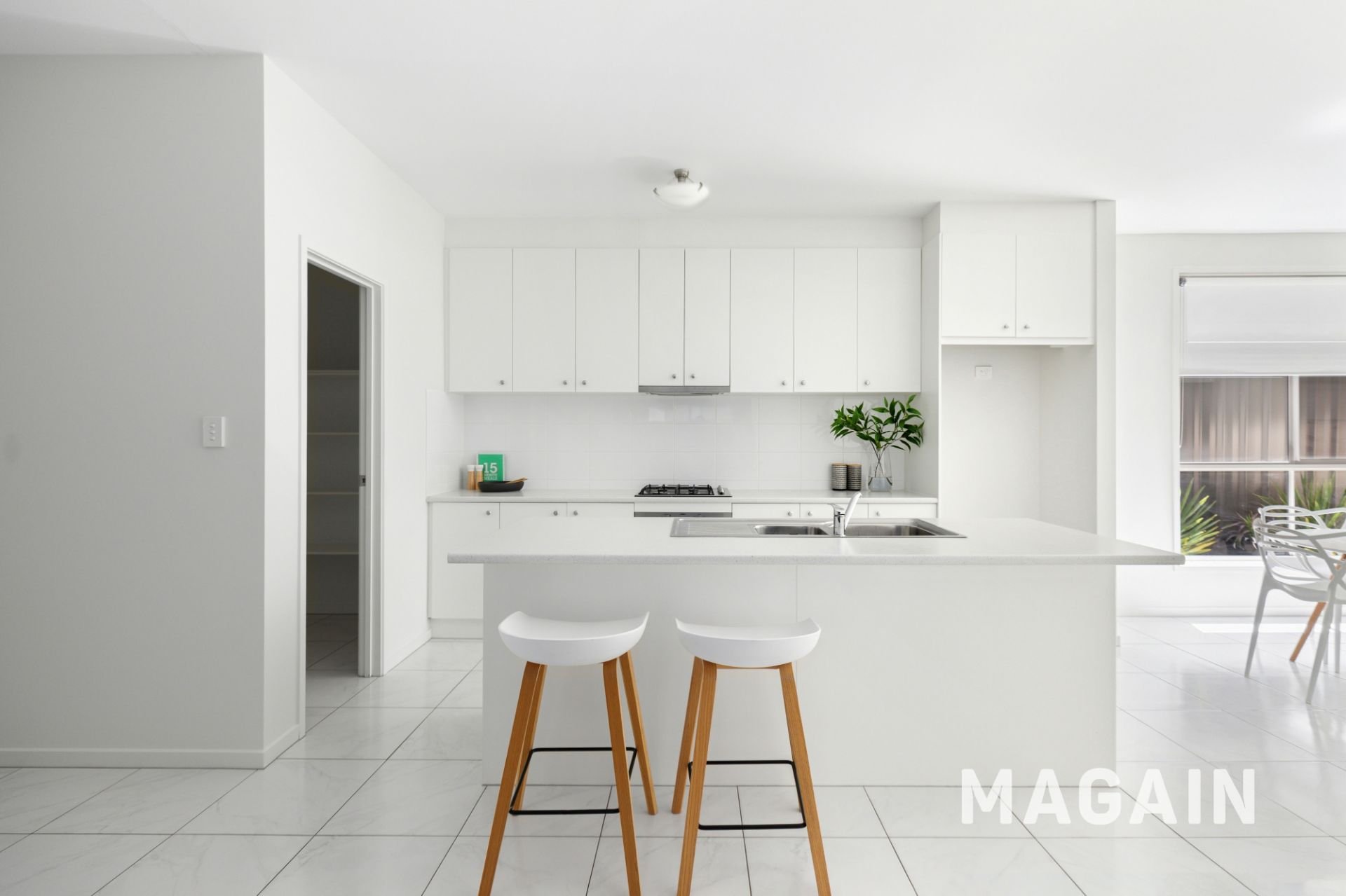 Step inside to discover a light-filled open plan living, dining, and kitchen area – the heart of the home – featuring a crisp neutral palette and tiled floors for easy-care living. The kitchen is beautifully appointed with stainless steel appliances, gas cooking, a walk-in pantry, and a breakfast bar, creating the perfect space for entertaining or enjoying family meals.