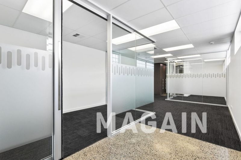 - Glass-partitioned rooms and open-plan workspace