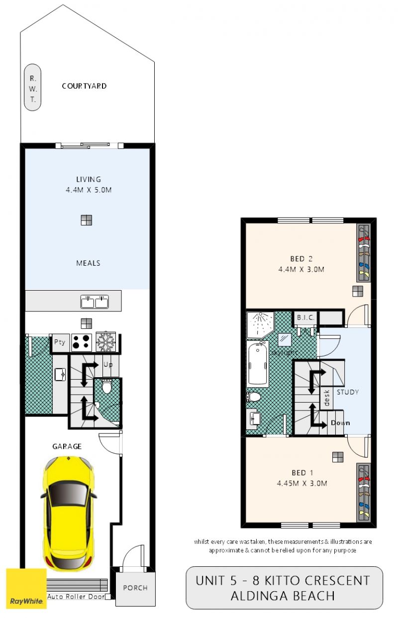 Set over two levels with a well-designed layout, the downstairs offers a separate entry with beautiful gloss tile flooring, flowing all the way down the long hallway and opening into the spacious open plan living area. The gorgeous, up to date kitchen boasts stainless steel appliances including electric oven & gas cooktop, dishwasher plus loads of counter space and ample cupboard storage. The adjoining meals & living area is light filled and flows seamlessly, through a glass sliding door, to the rear courtyard. Conveniently located off the kitchen, the laundry could become a multi-purpose room and potentially be used as a walk-in pantry for extra storage. Neatly tucked away under the stairs is a powder room, consisting of a toilet and hand basin.