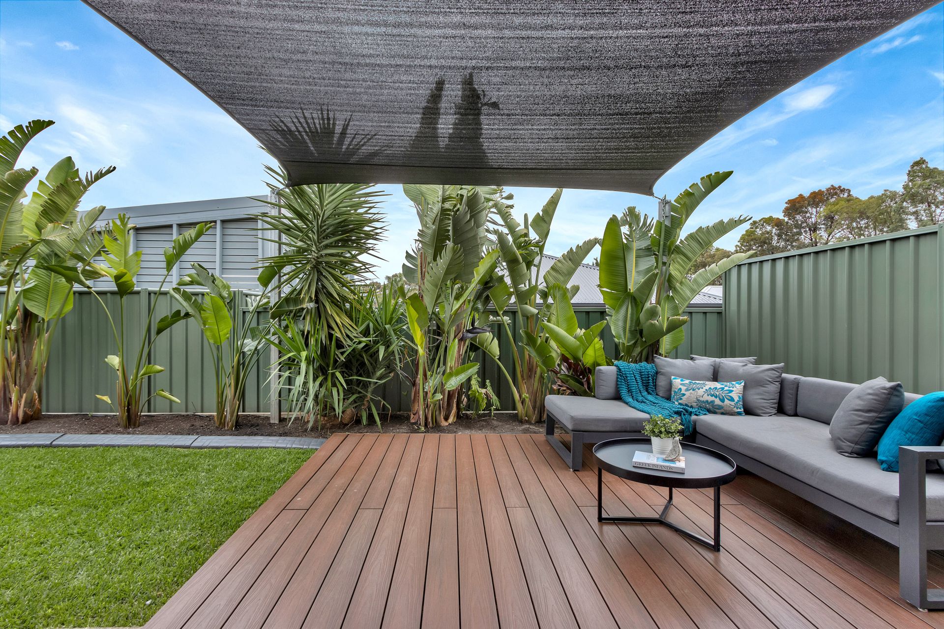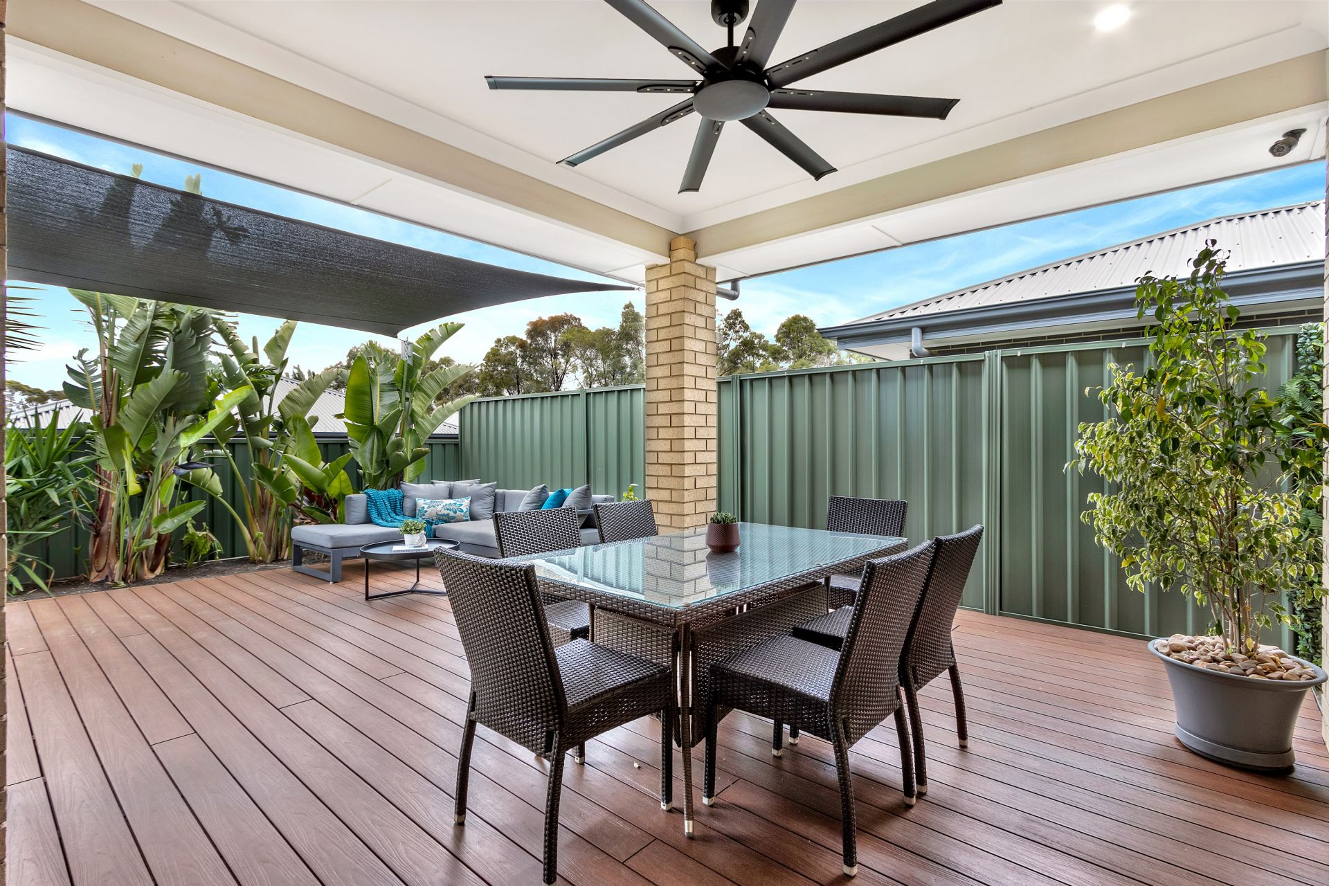 Step outside to the superb alfresco area under the main roof, featuring stylish decking and an outdoor ceiling fan, all overlooking manicured gardens. A double garage with rear garden access adds further practicality.