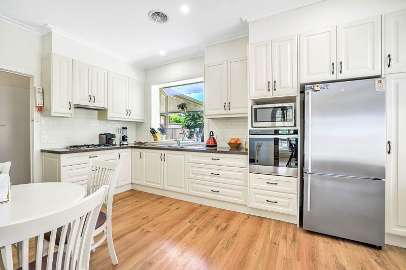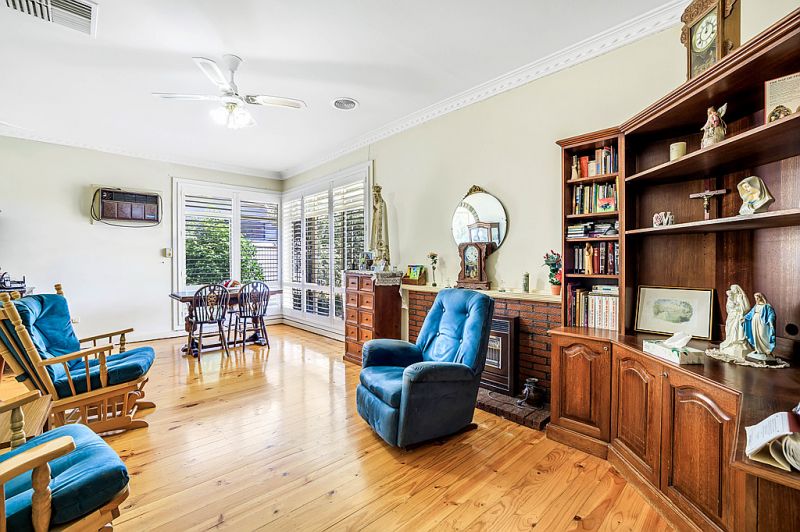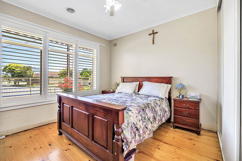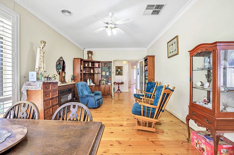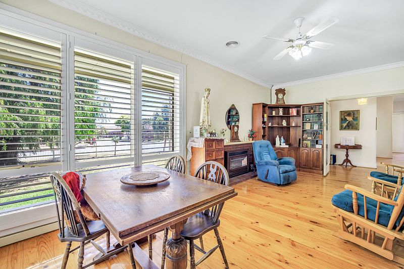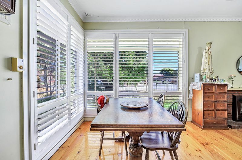 Beautiful plantation shutters are along the front of the house and the original polished floorboards are throughout. The modern kitchen leads into the hallway and on to the 4 bedrooms all with built in wardrobes and overhead fans. The heating is ducted gas and cooling ducted evaporative and there's an extra toilet in the laundry.
