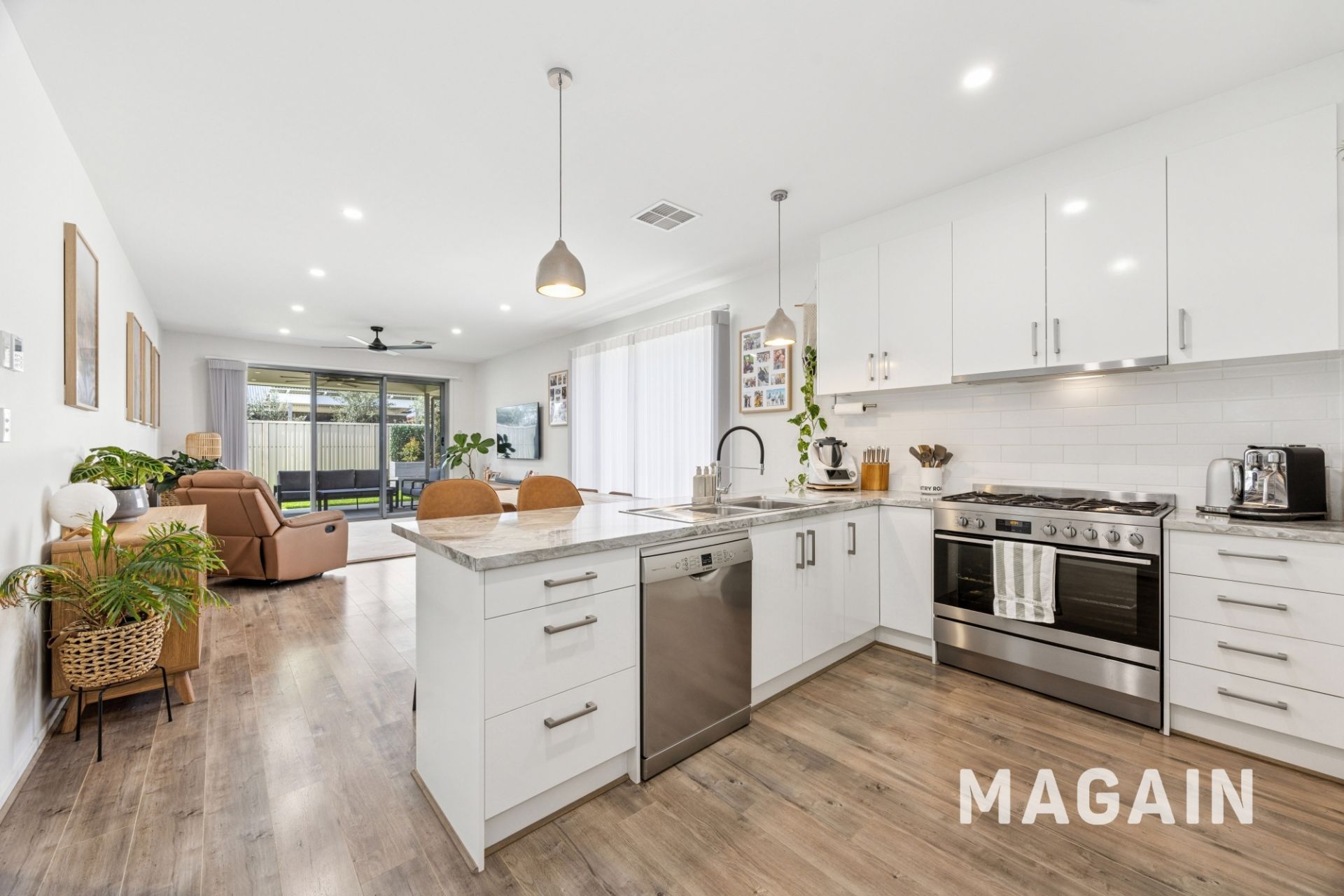The kitchen combines style and functionality, enhanced by elegant pendant lighting that brings a modern touch. Crisp white cabinetry and light benchtops create a fresh, timeless look, while premium stainless-steel appliances, including a 5-burner gas cooktop, oven, rangehood, and dishwasher, make cooking and cleanup a breeze. A spacious walk-in pantry, double sink, fridge nook, and versatile breakfast bar complete the space, offering both everyday convenience and the perfect setting for entertaining.
