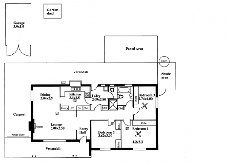 Rear verandah and entertaining overlooking the good size gardens, shed and fruit trees. Car parking is a roller door carport.