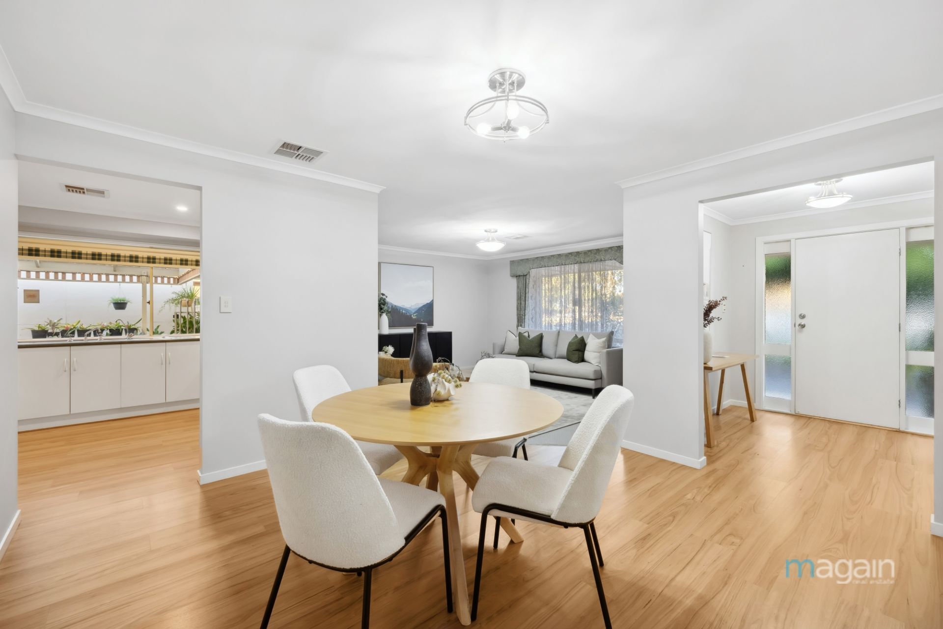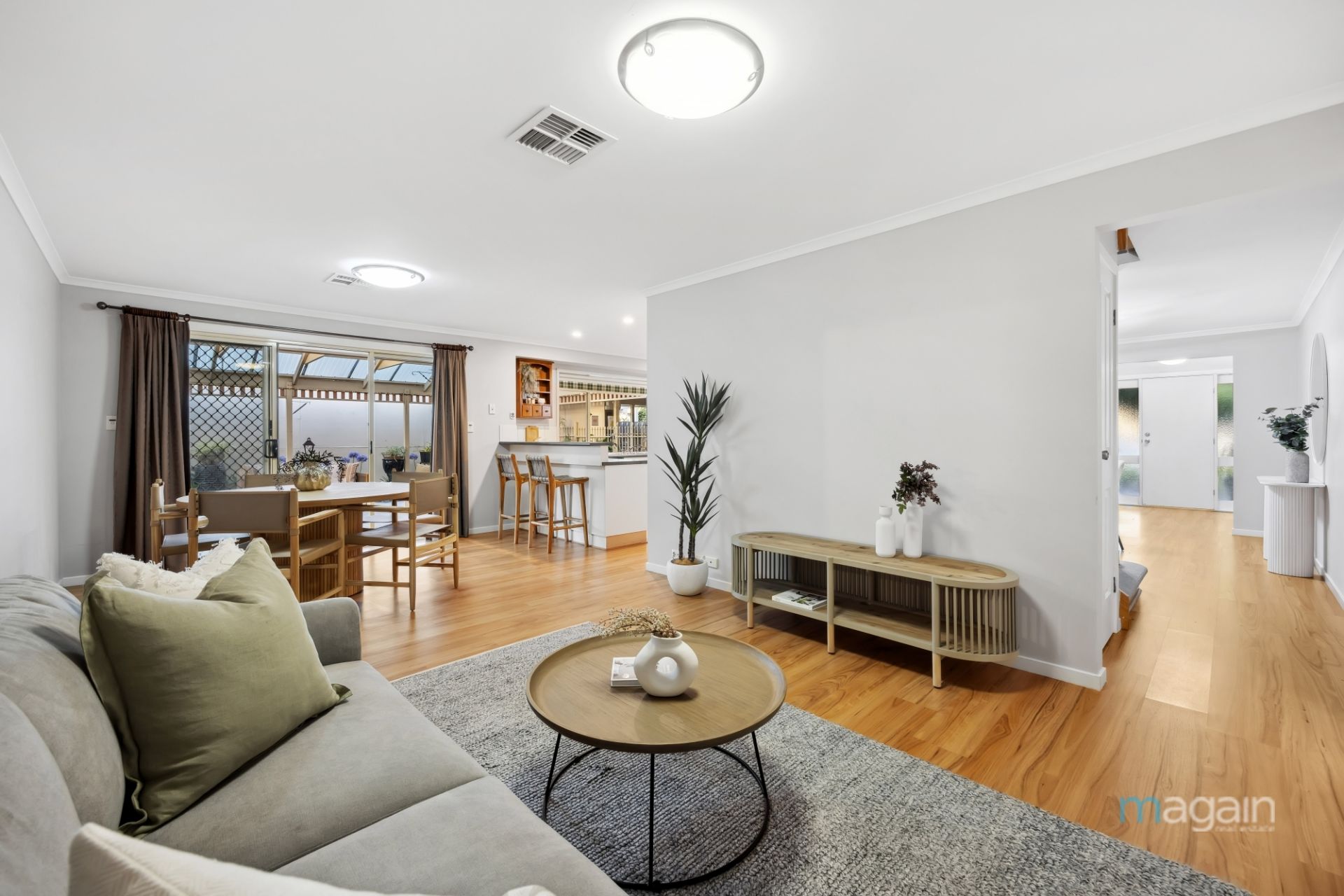 The home boasts a large main bedroom positioned at the front, offering a private retreat with carpeted flooring, corner walk-in-robe and a well-appointed ensuite. A front formal lounge and dining area creates a welcoming atmosphere for entertaining guests or enjoying quiet family moments. The comfortable, carpeted lounge area along with the dining space flows seamlessly into the homes L-shaped Kitchen/meals/family area.