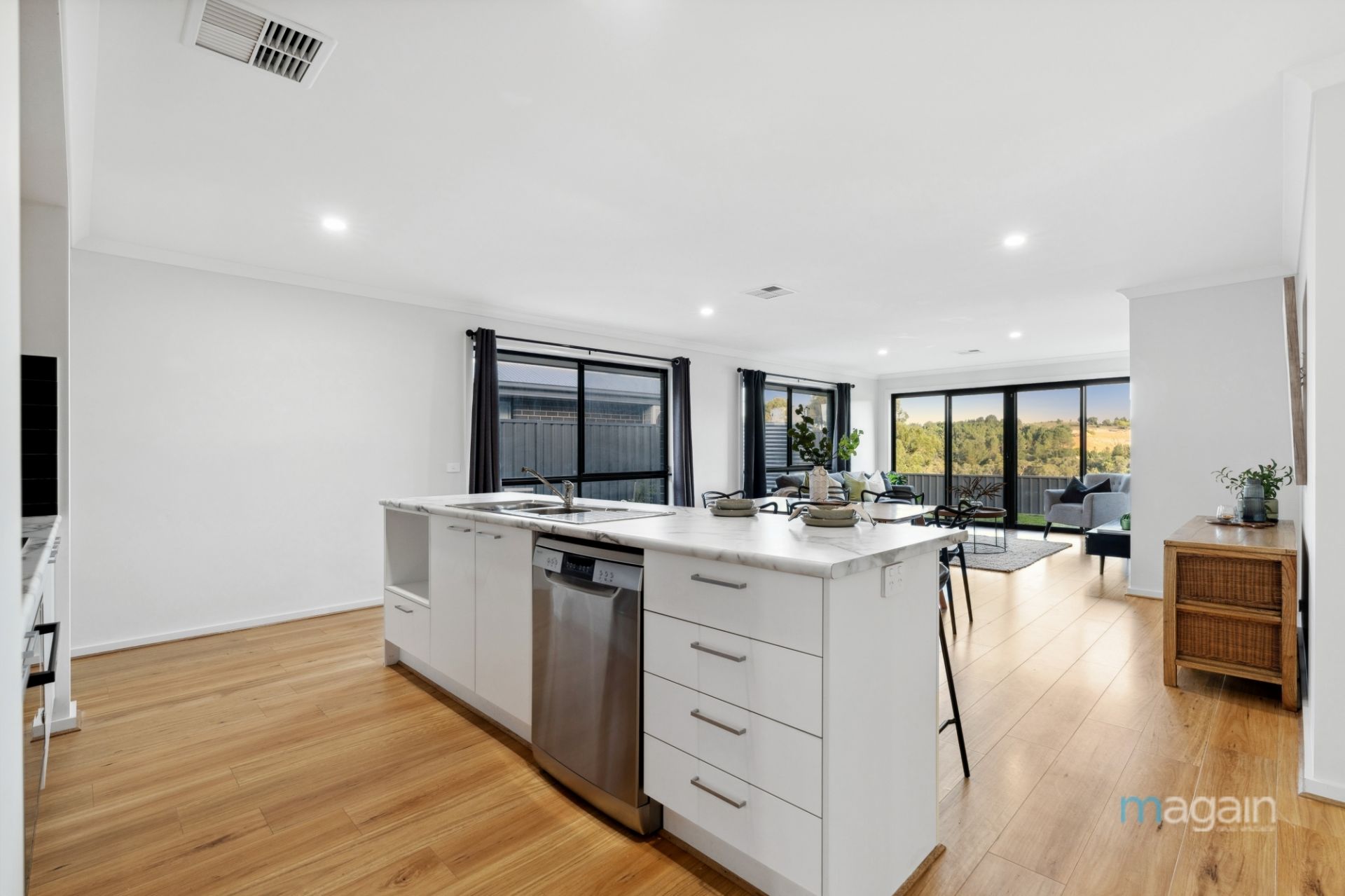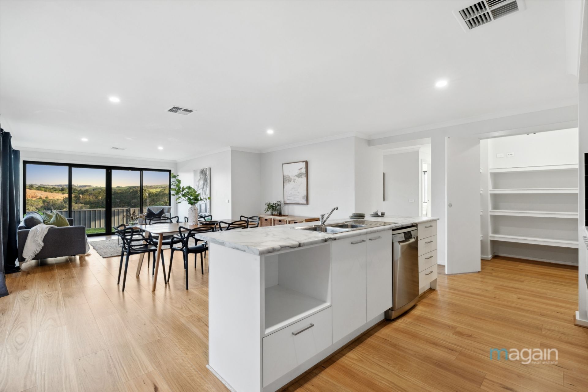 The galley style kitchen offers a large electric oven, gas cooktop with rangehood and impressive black subway tiled splashback. There is an island bench with stainless steel sink, dishwasher and breakfast bar seating that overlooks the dining and lounge room area with sliding glass doors that provide access to the rear yard whilst framing views out over the back fence of the golf course and the hills in the distance. There is also a large walk-in pantry which is handy.
