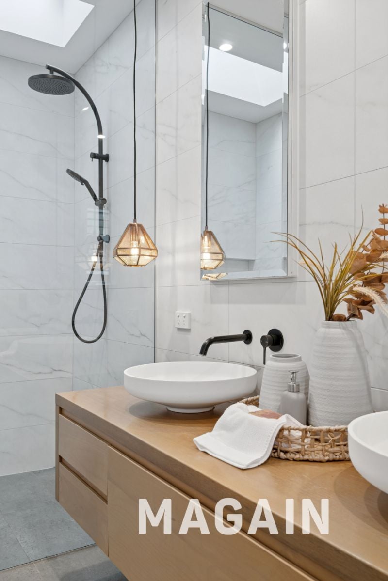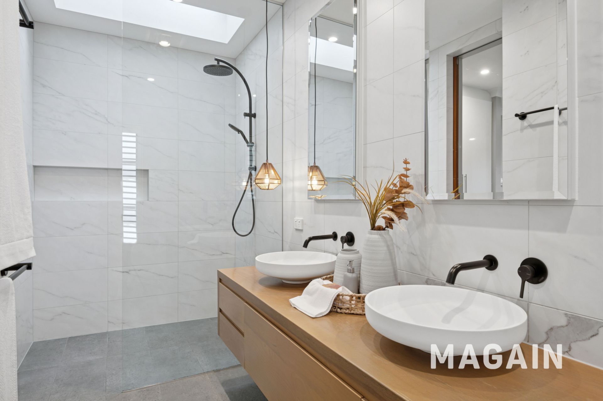 - Designer ensuite with floating timber vanity, double, black tapware, a rainfall shower, and a remote-controlled Velux skylight.