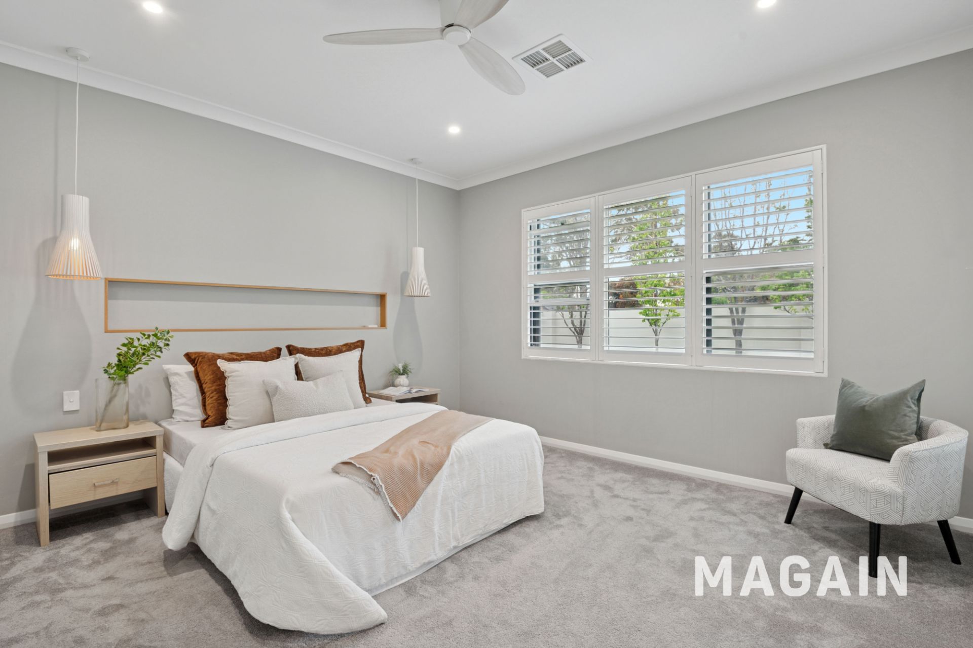 - Stunning master suite with feature lighting, luxurious carpet and a walk-in robe with custom shelving and shoe storage.