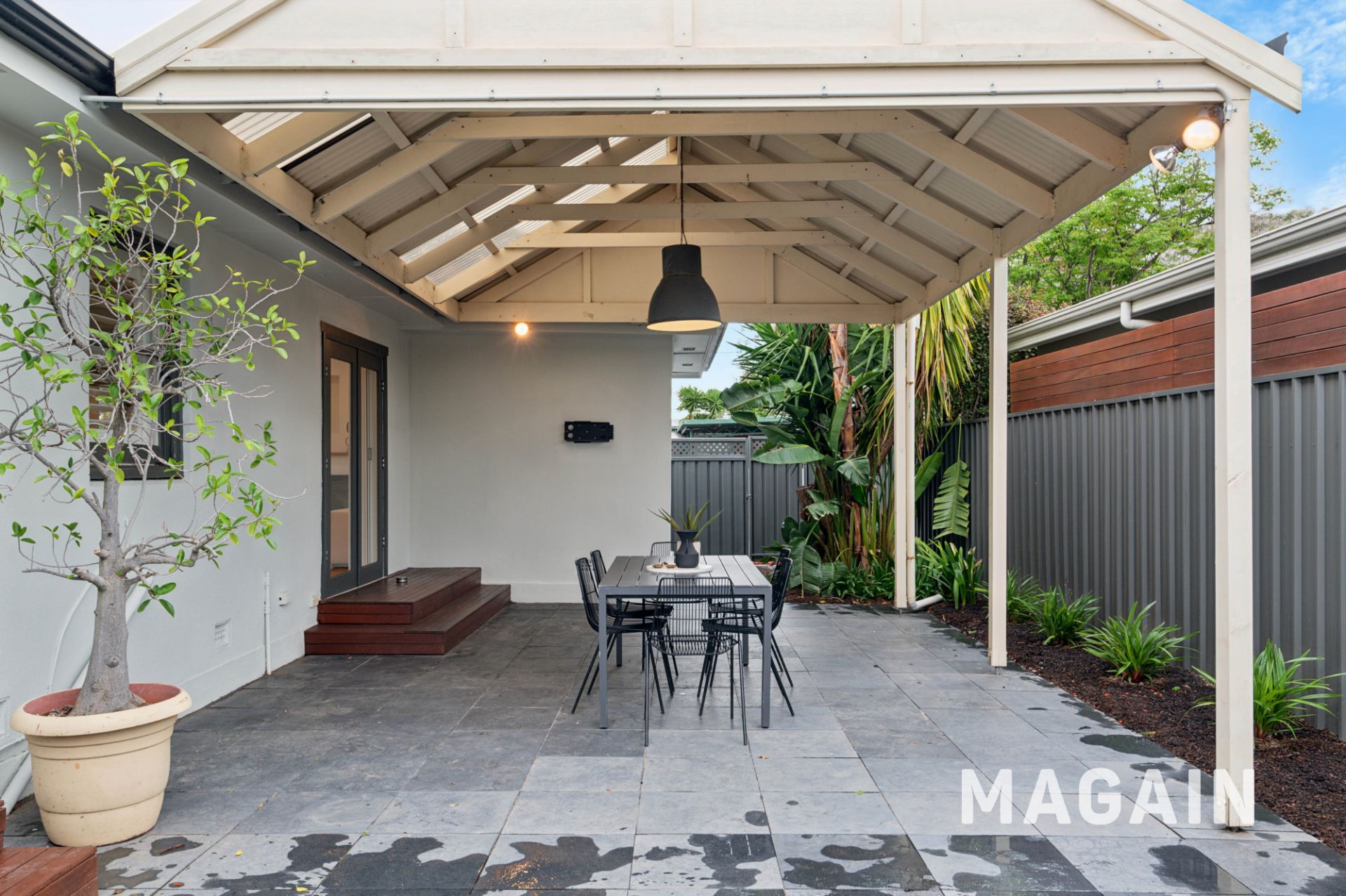 - North facing expansive rear undercover area with gabled patio, black limestone paving, tropical gardens, and a resort-like feel
