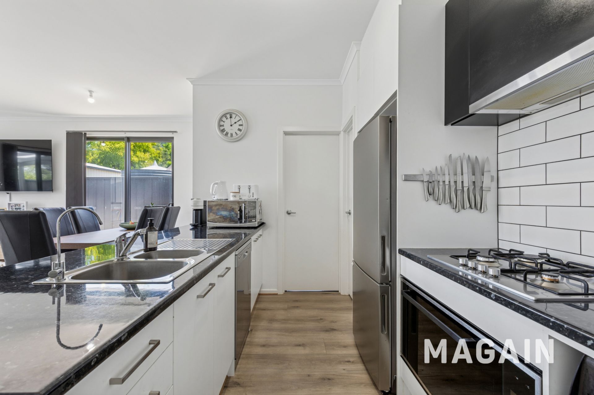 You'll find plenty of pleasing interior style with a stainless-steel dishwasher; a glossy granite-look kitchen bench-top; subway kitchen tiles; timber-look floors; crisp white walls; vertical blinds in the family room; large sunlit windows and sliding doors providing access to and a view of the garden.