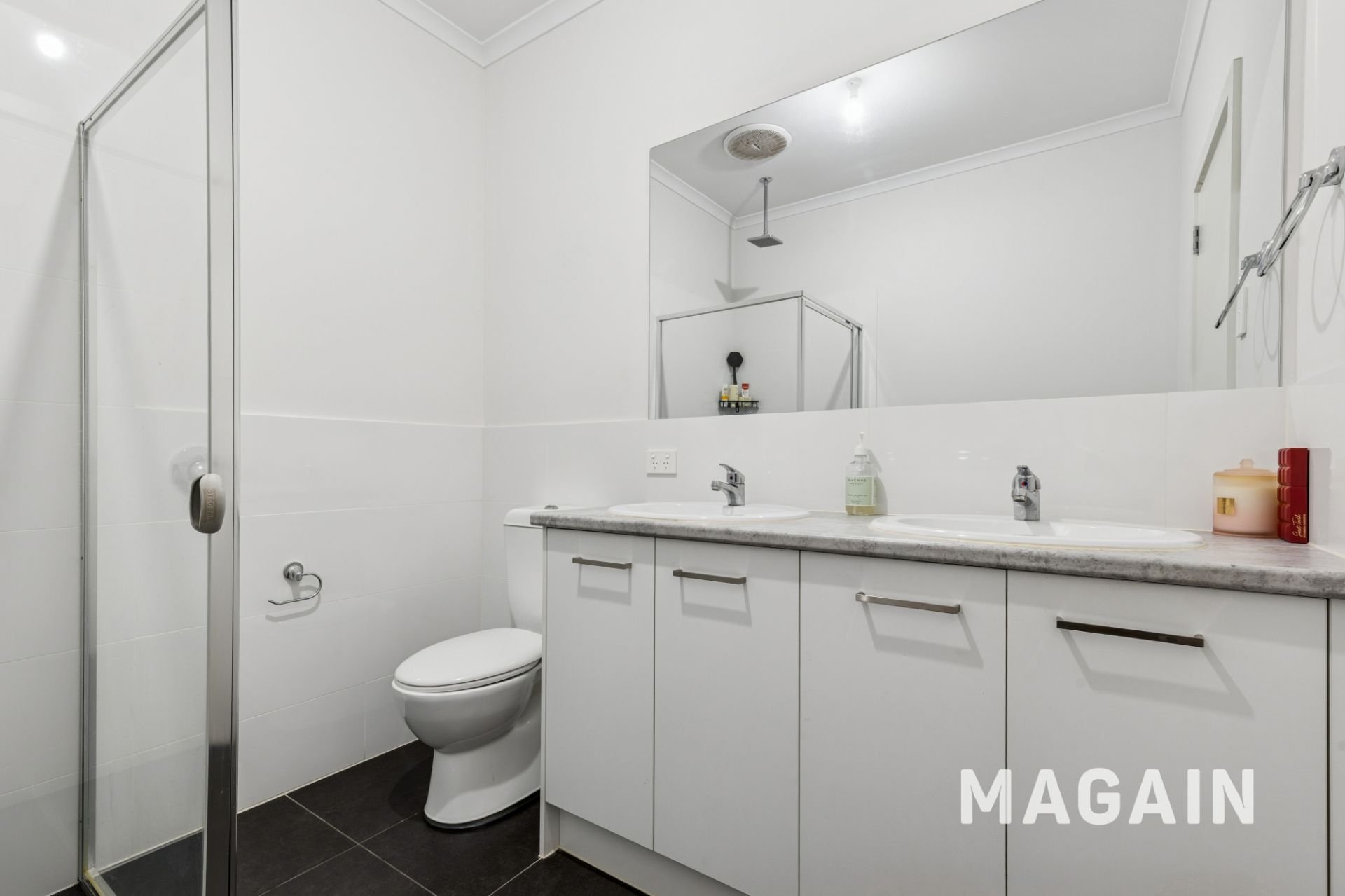 A waterfall shower head and double vanities in the ensuite