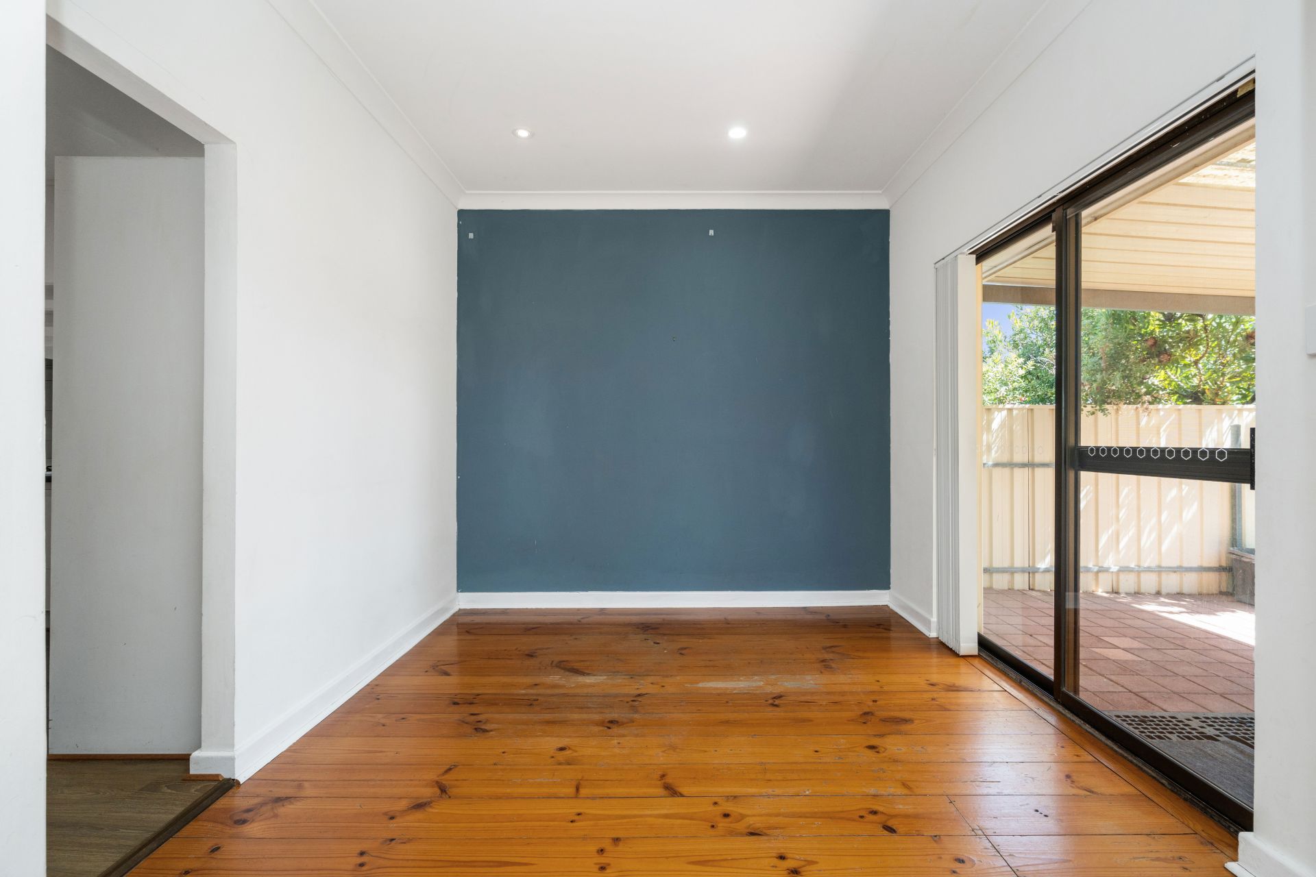 An open plan lounge and dining room, with polished floorboards throughout.