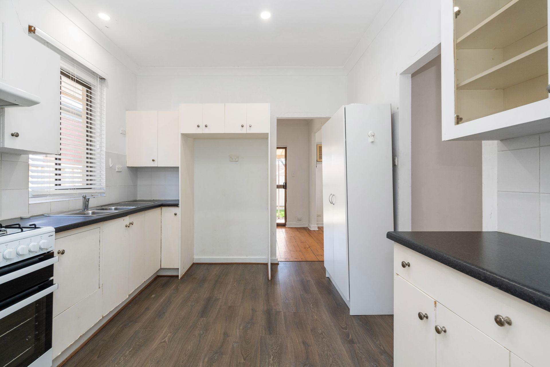 A light bright kitchen with loads of cupboard space and gas appliances.