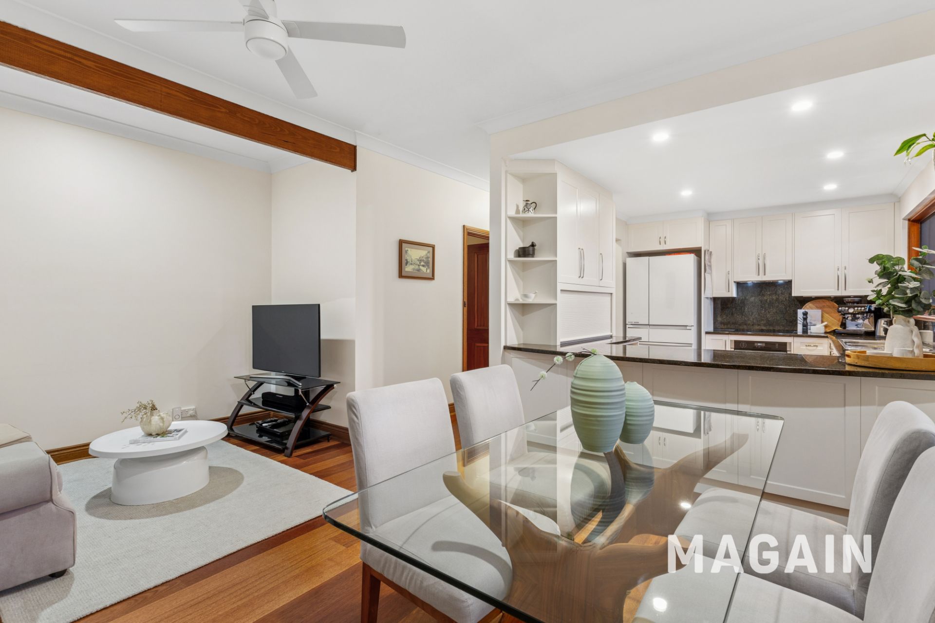 Outdoors, the rear yard presents an entertainer's sanctuary. The undercover alfresco with ceiling fan overlooks the sparkling salt-chlorinated pool-an idyllic setting for long summer days-while the pool adjacent pergola provides shaded relaxation and a perfect vantage point for evenings spent enjoying the summer months. The immaculate gardens include multiple fruit-bearing trees such as a mulberry, lemon, orange, and mandarin, enhancing the property's already exceptional appeal.