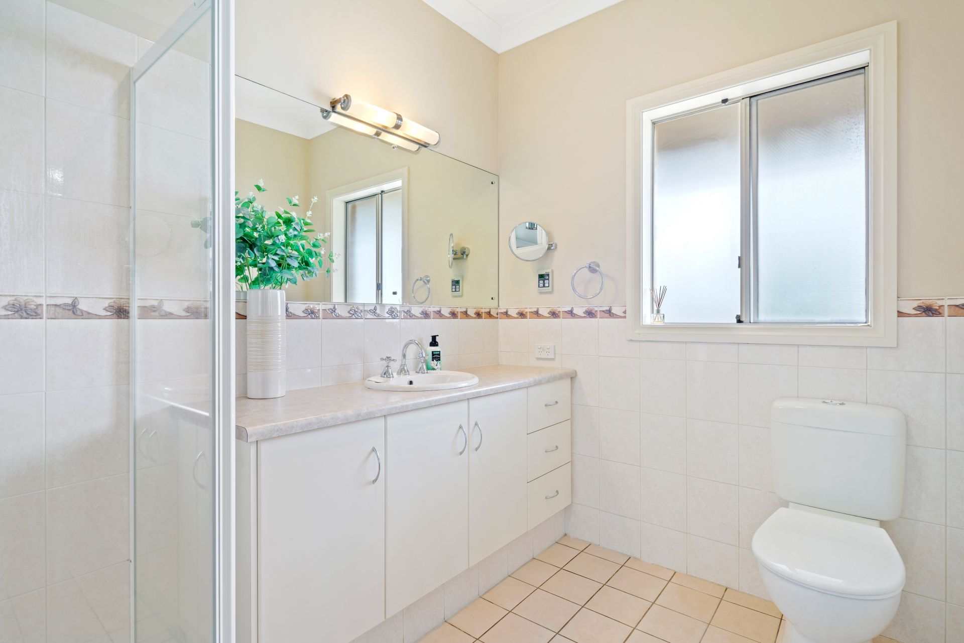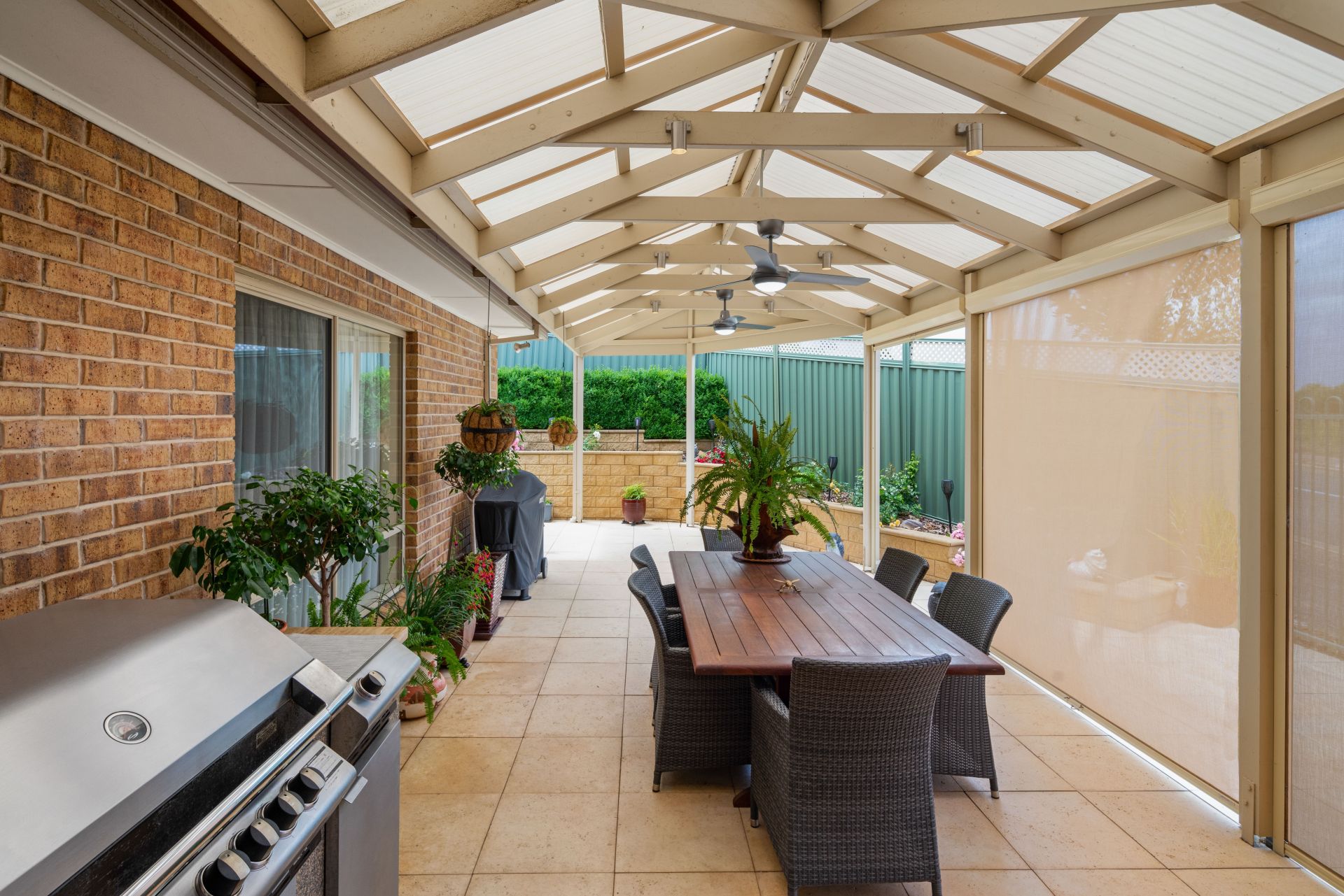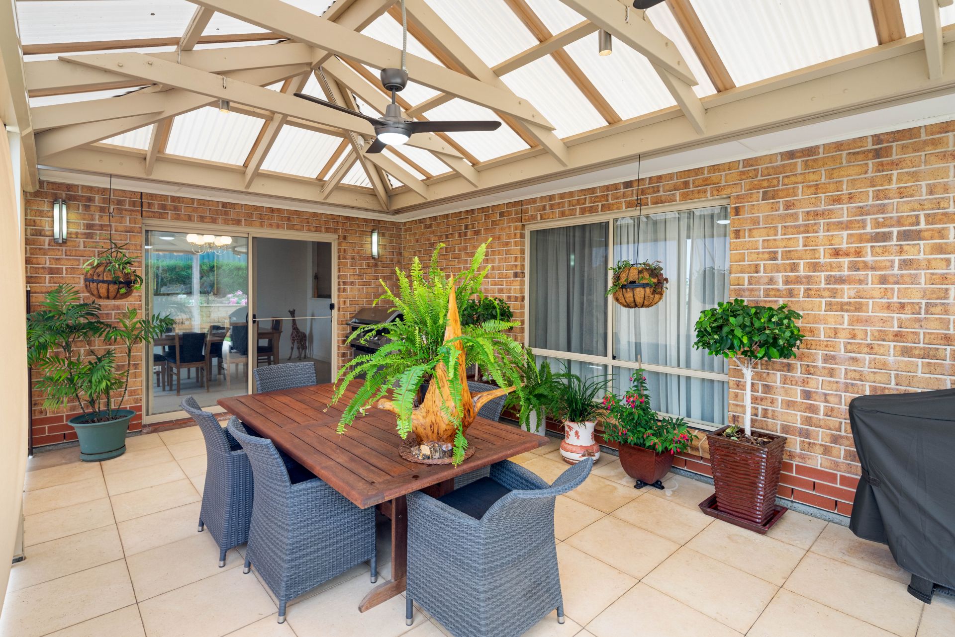 Glass sliding doors from the family living area beckon you to the rear yard, where an entertainer's paradise awaits. A capacious paved entertaining area with built-in BBQ, sheltered by a pitched roof pergola with ceiling fans, and partially enclosed with café blinds, offers the ideal setting for year-round gatherings. The rear yard grants plenty of space for the kids and pets to frolic and explore in fabulous privacy.