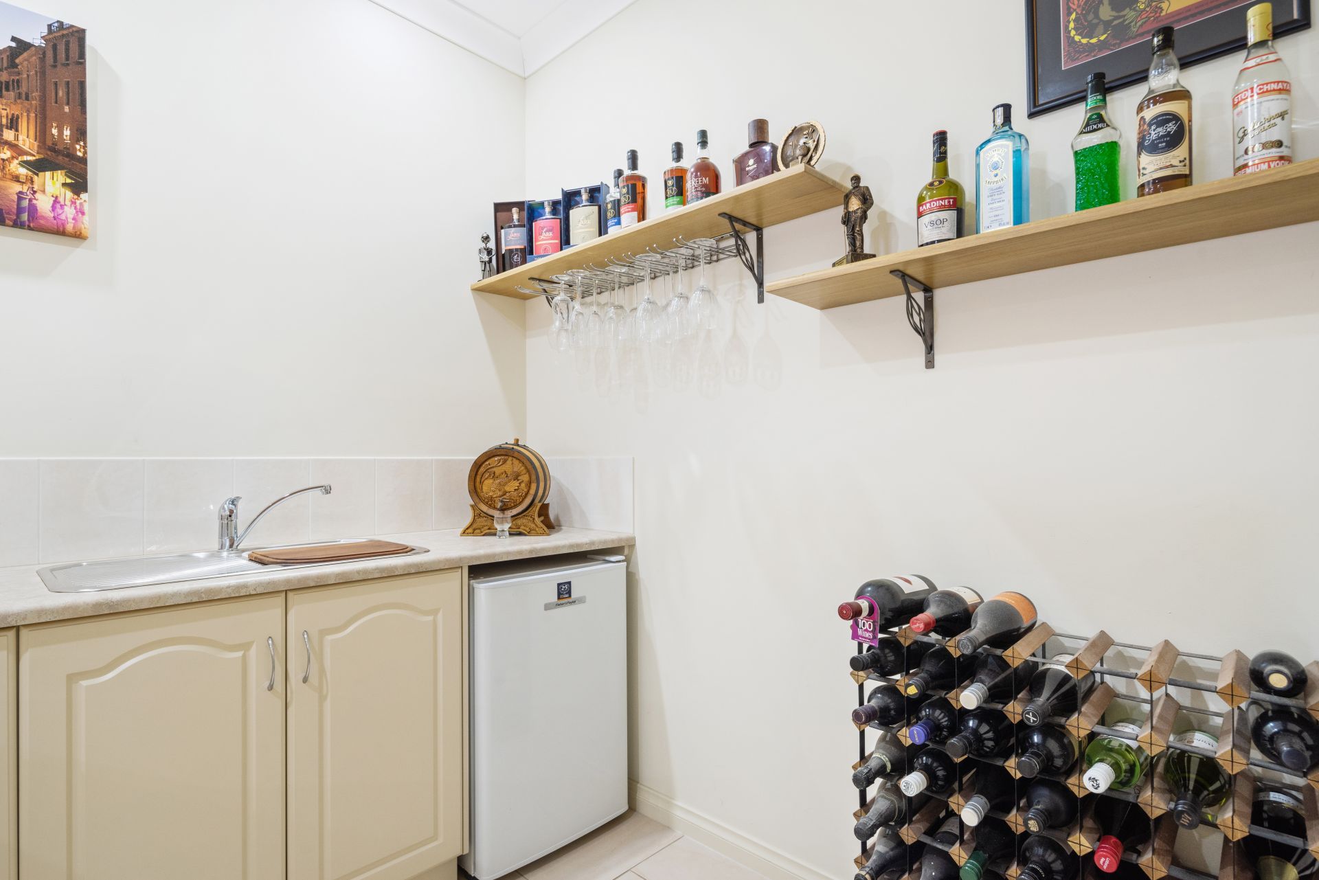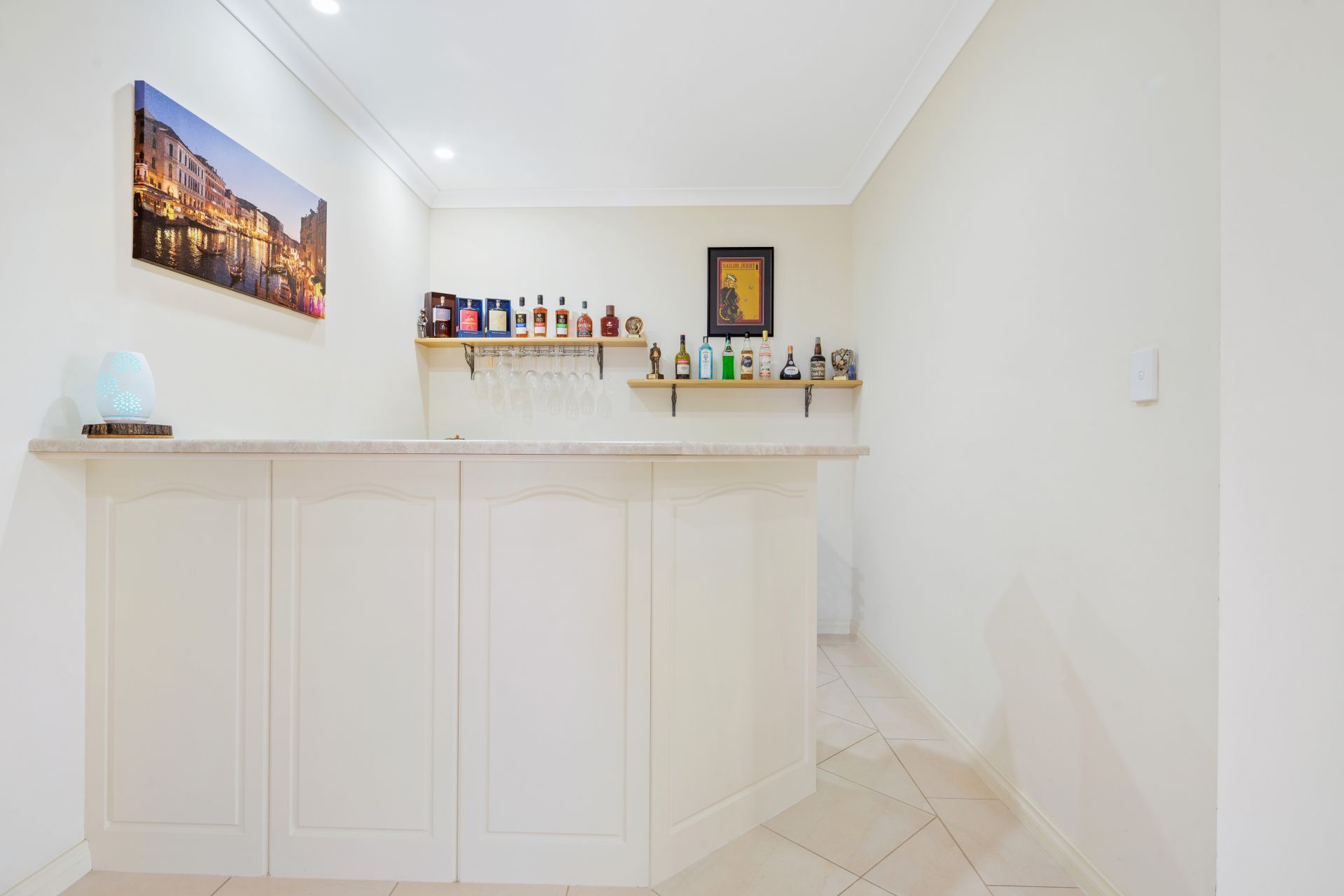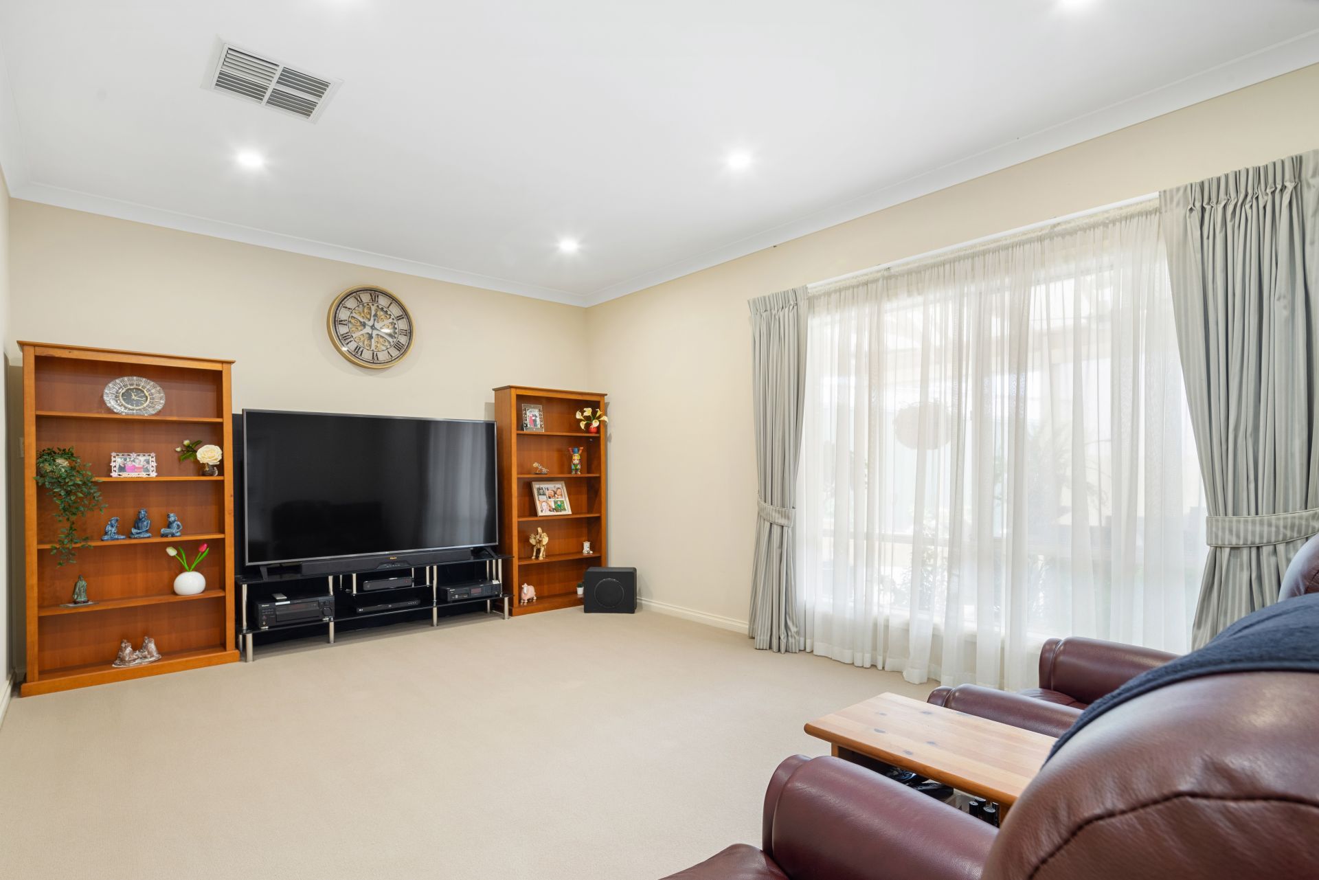 Glass sliding doors from the family living area beckon you to the rear yard, where an entertainer's paradise awaits. A capacious paved entertaining area with built-in BBQ, sheltered by a pitched roof pergola with ceiling fans, and partially enclosed with café blinds, offers the ideal setting for year-round gatherings. The rear yard grants plenty of space for the kids and pets to frolic and explore in fabulous privacy.