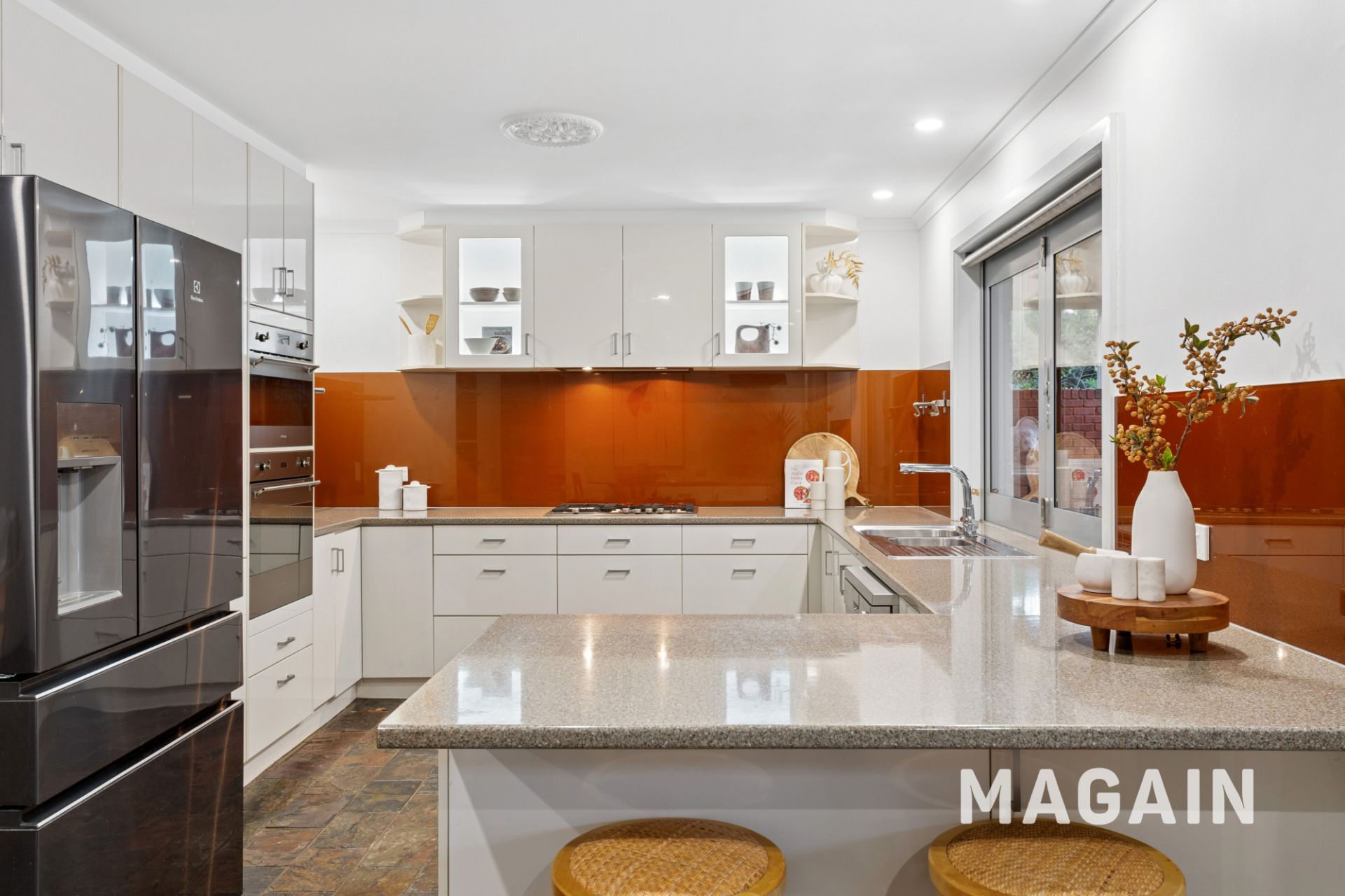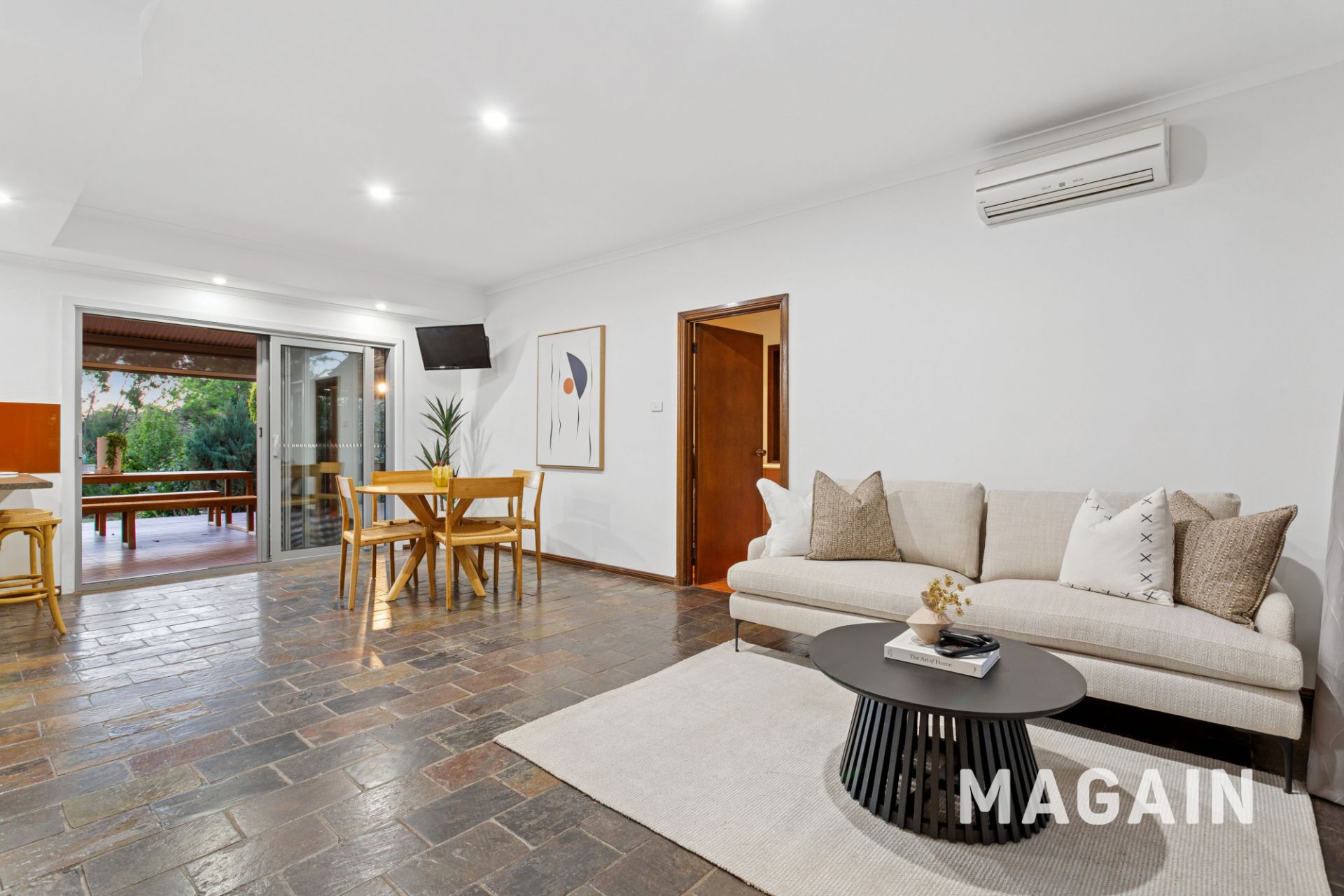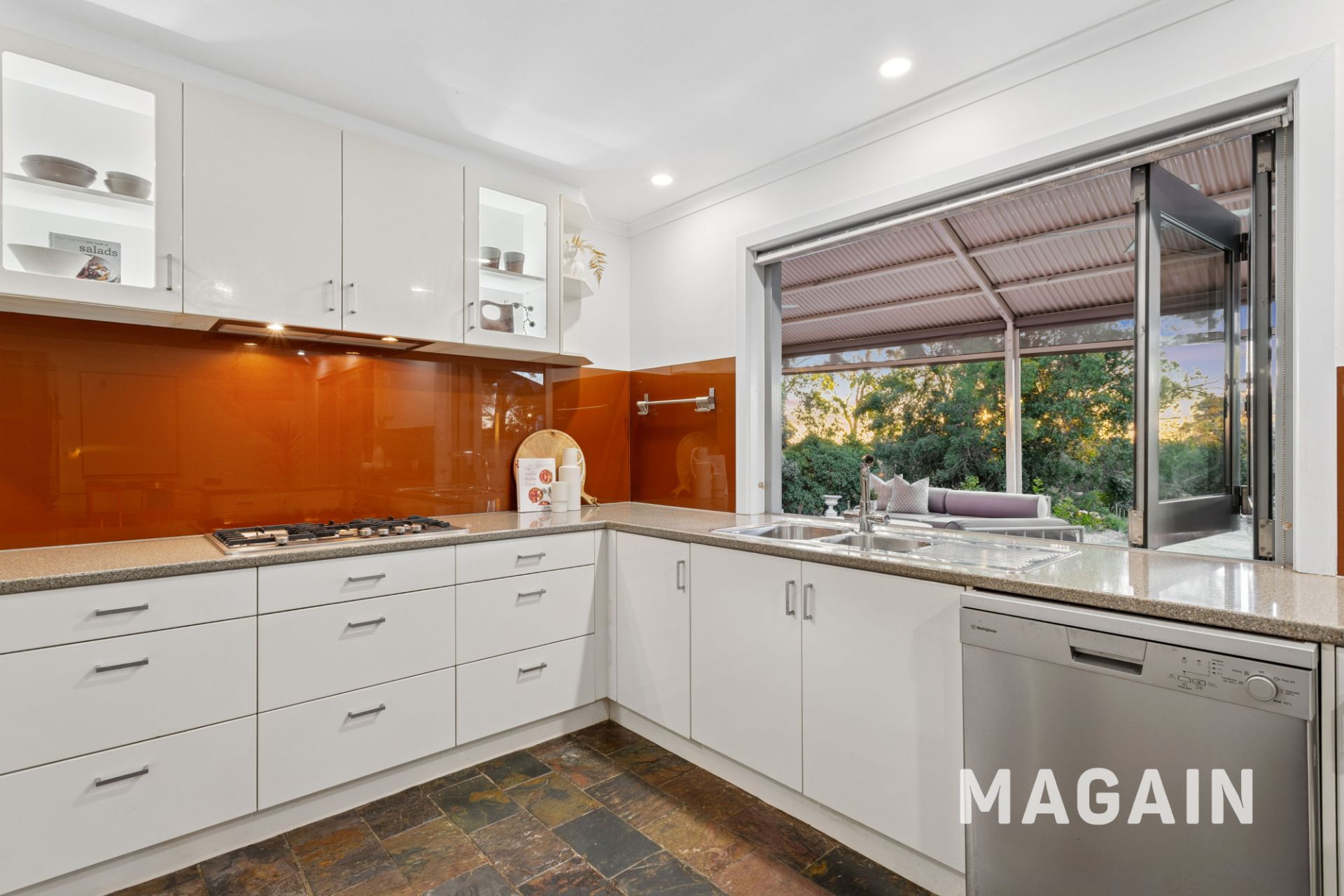 At the heart of the home, the central kitchen/dining/living area overlooks the rear decking and expansive yard. The well-appointed kitchen features a gas cooktop, a stainless steel double sink, dishwasher, two Smeg wall ovens and generous cupboard and drawer storage,. The kitchen boasts an impressive double glazed bi-folding window that opens to the rear deck which is ideal when entertaining. The casual meals and additional living space is comfortably serviced by a wall-mounted split system air conditioner. A downstairs laundry room and a separate toilet complete the practical lower level.